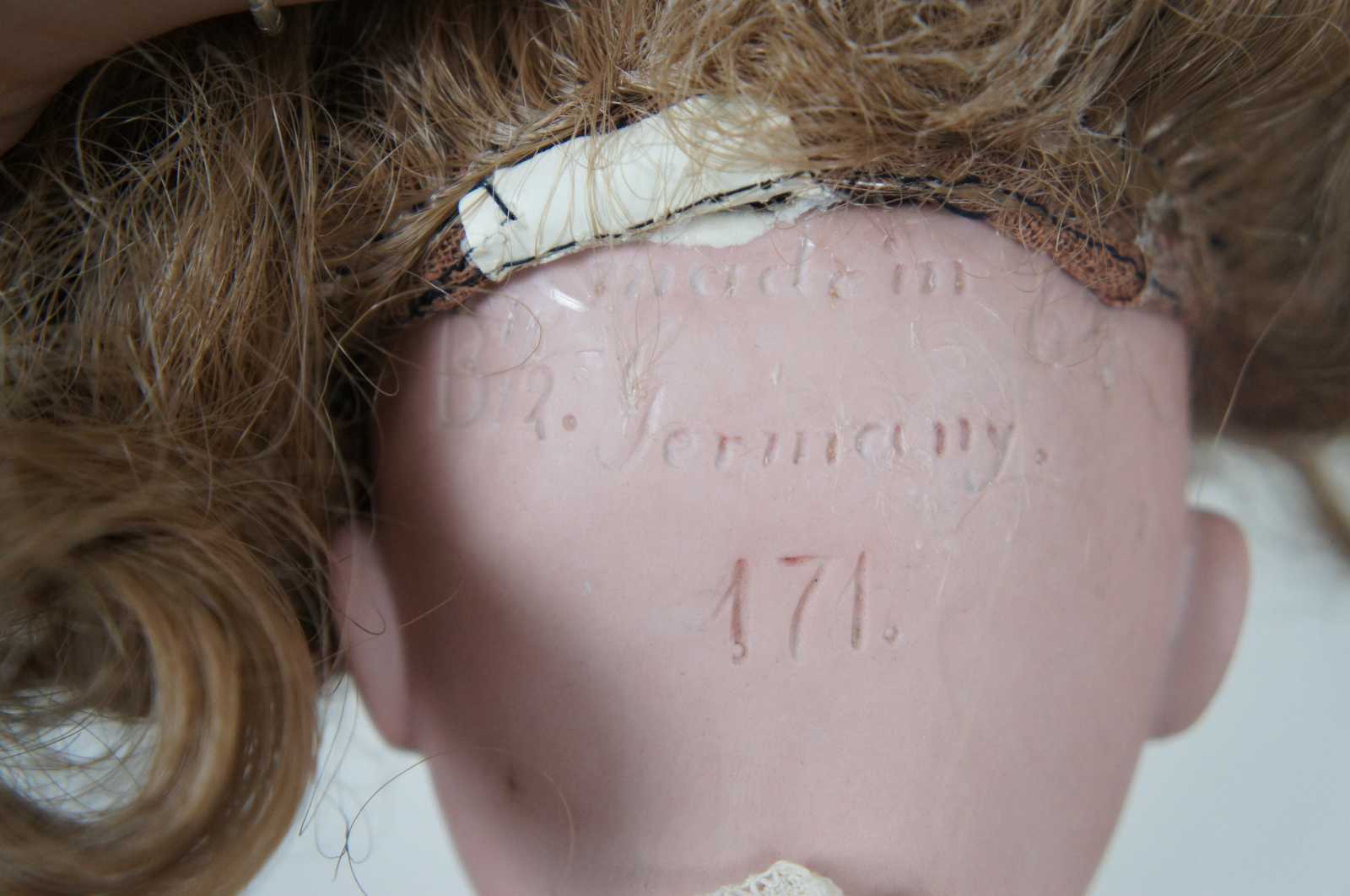 Antique German 171 bisque head doll with composition articulated jointed body, sleep eyes, light brown/dark blonde hair, dressed in a white dress with black shoes.