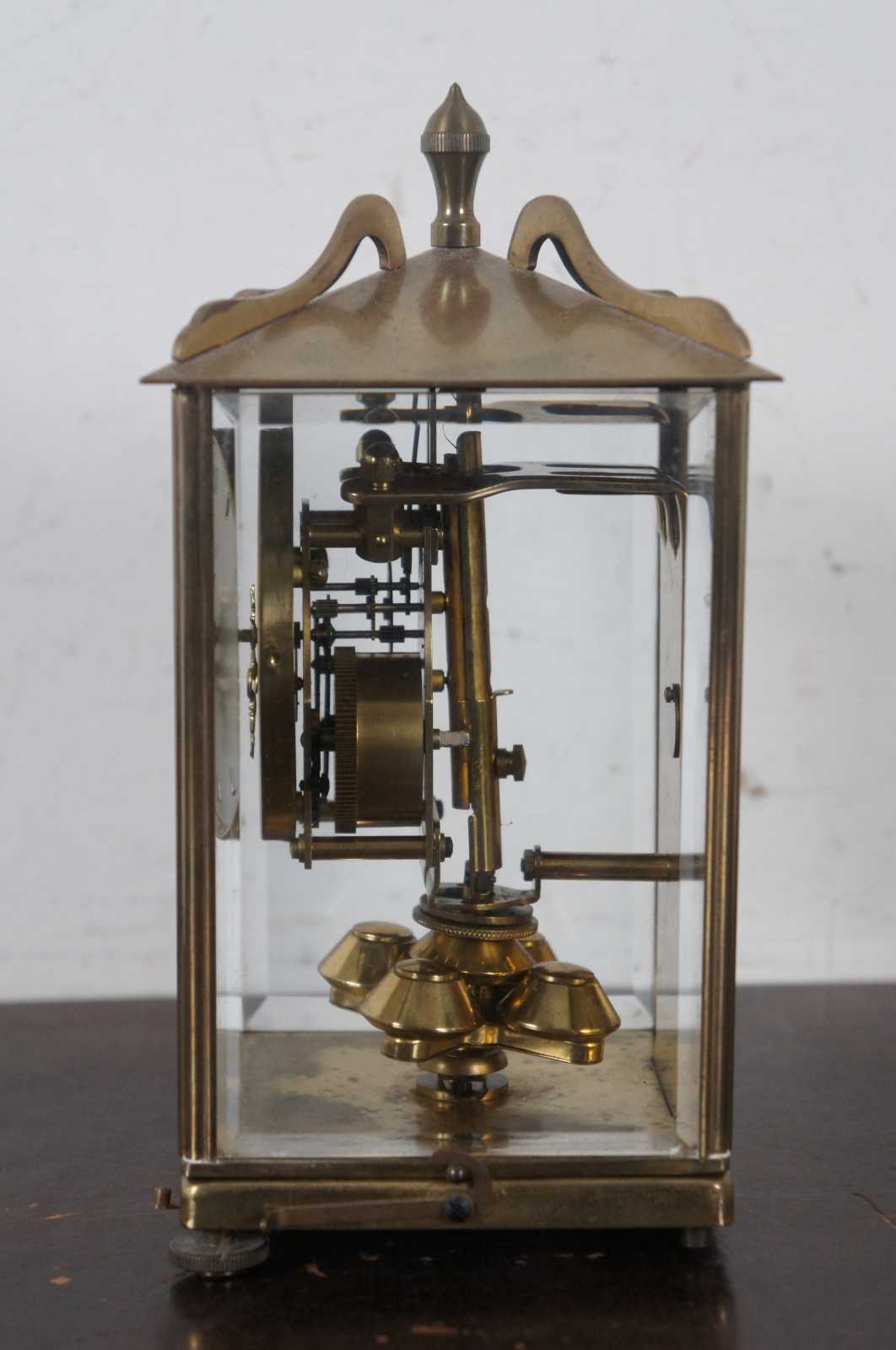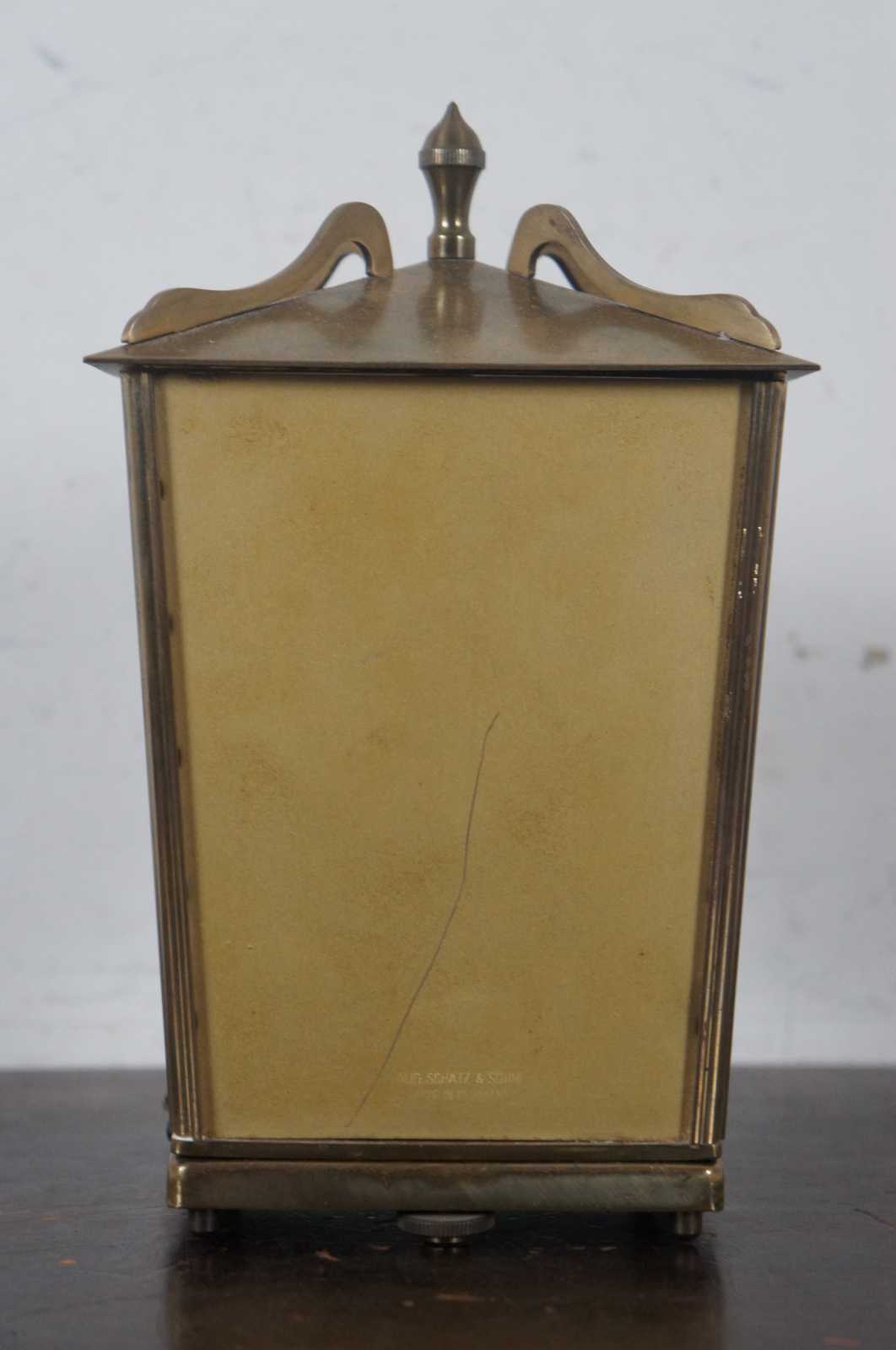 Antique Schtaz & Sohne 400 day anniversary mantel clock in brass and glass case. Includes key. “The company known as Schatz was first known as Jahresuhrenfabrik. The company was founded by August Schatz in the mid-1850s in the Black Forest region of Triburg, Germany. It was registered in 1881 as Schatz & Wintermantel, and was re-structured in 1884 as Jahresuhrenfabrik A.G. It was registered again in1897 as Jahresuhrenfabrik GmbH, and finally in 1923 as Jahresuhrenfabrik August Schatz & Sohne. They produced cuckoo clocks, barometers, and 400- day clocks. In later years, they produced electric clocks and battery- operated quartz clocks. The company struggled to compete in the early 1980s, and finally closed down in 1985.”