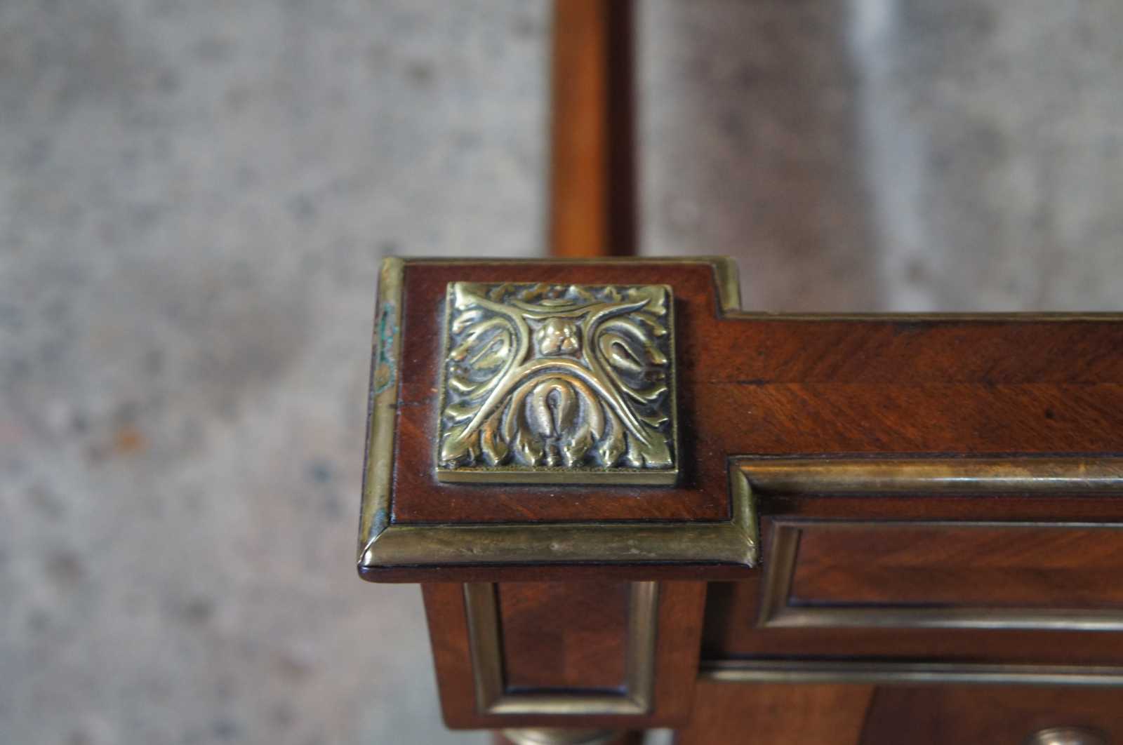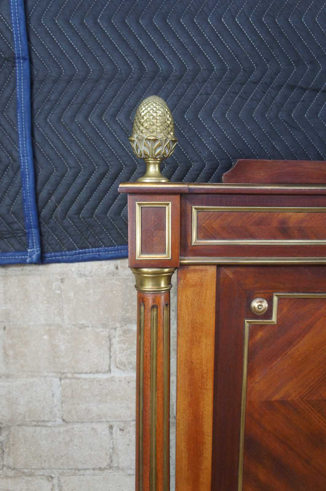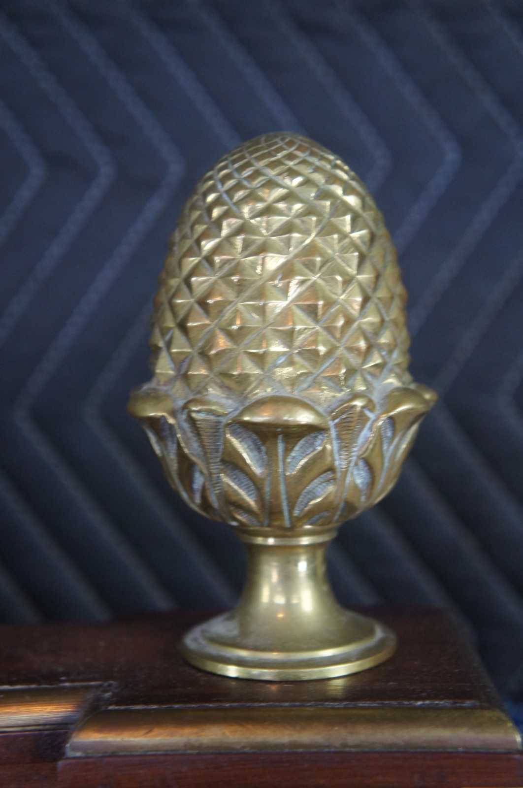 Antique 19th century French Empire bed. Made of mahogany with inalid brass and large arctichoke or pineapple shaped finials.