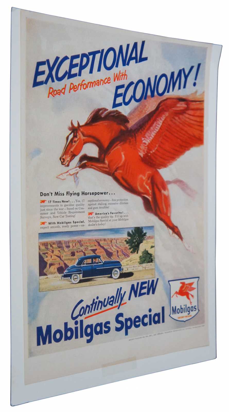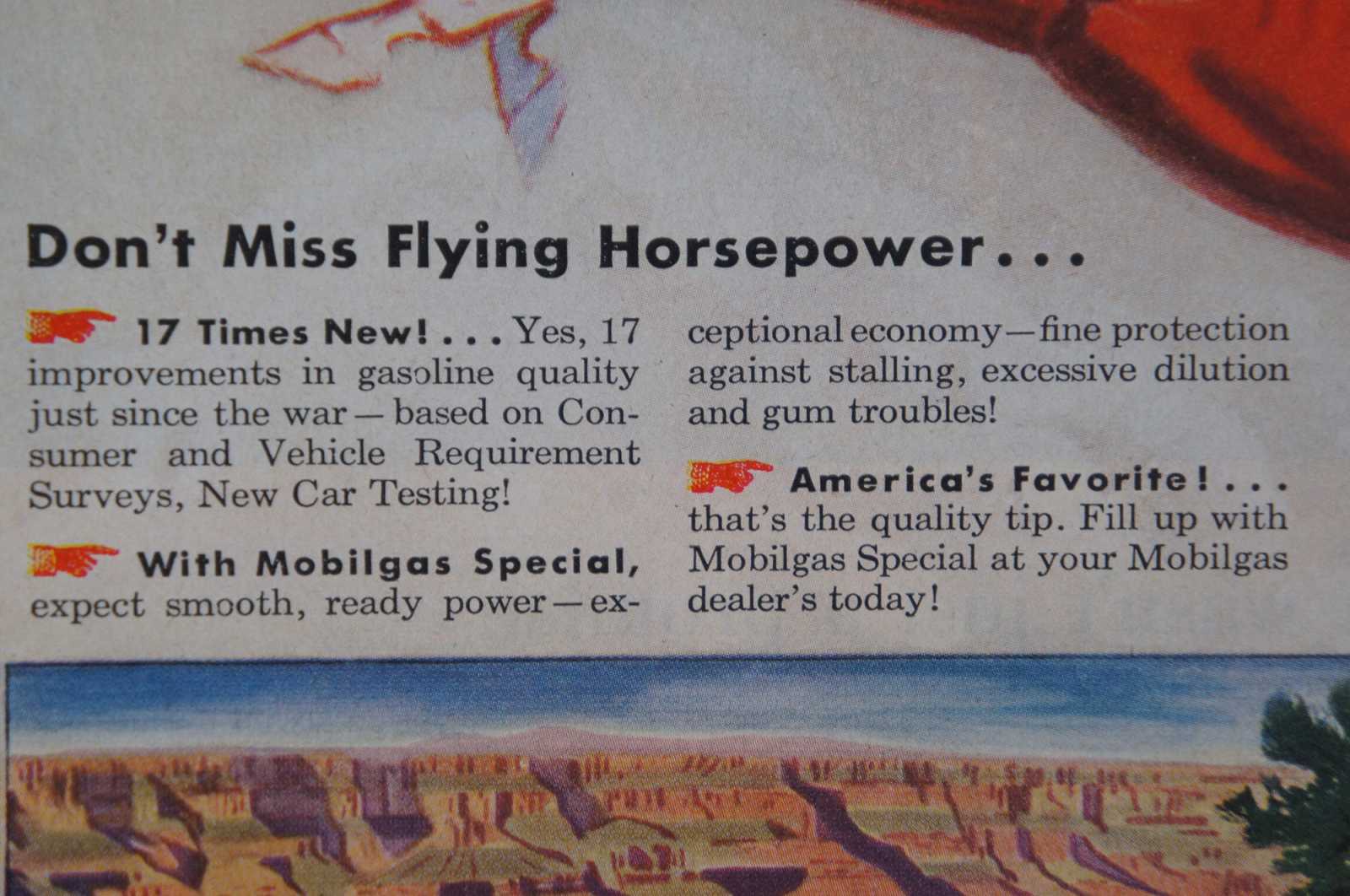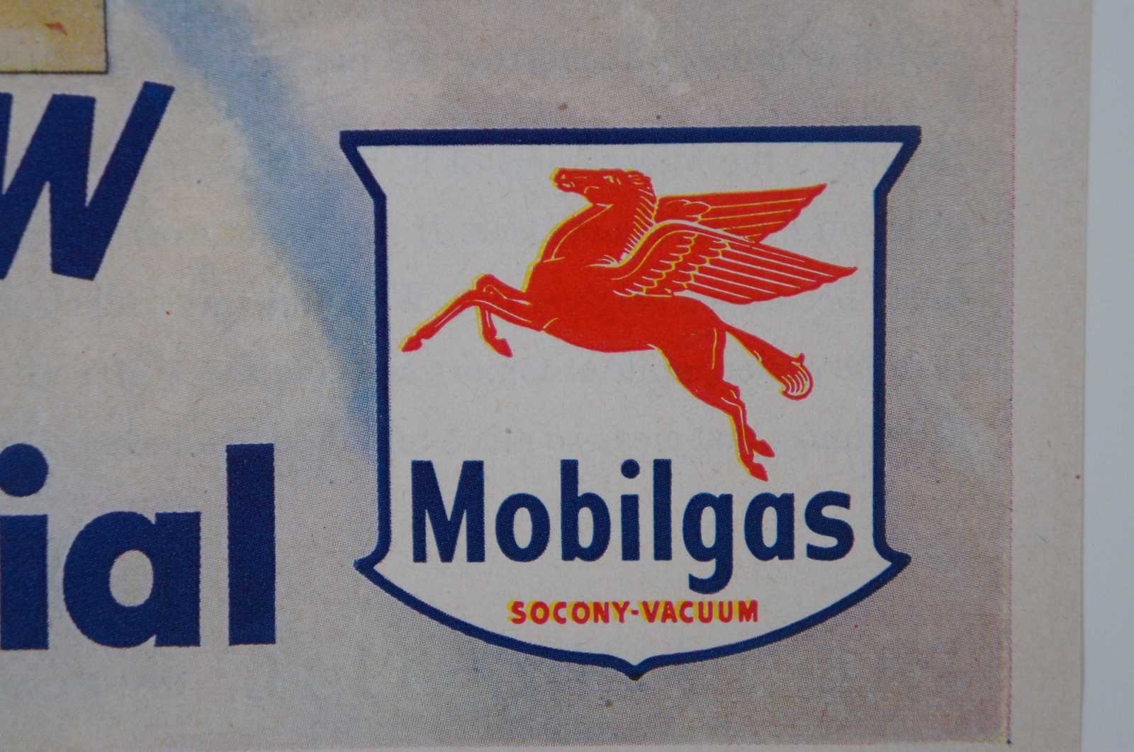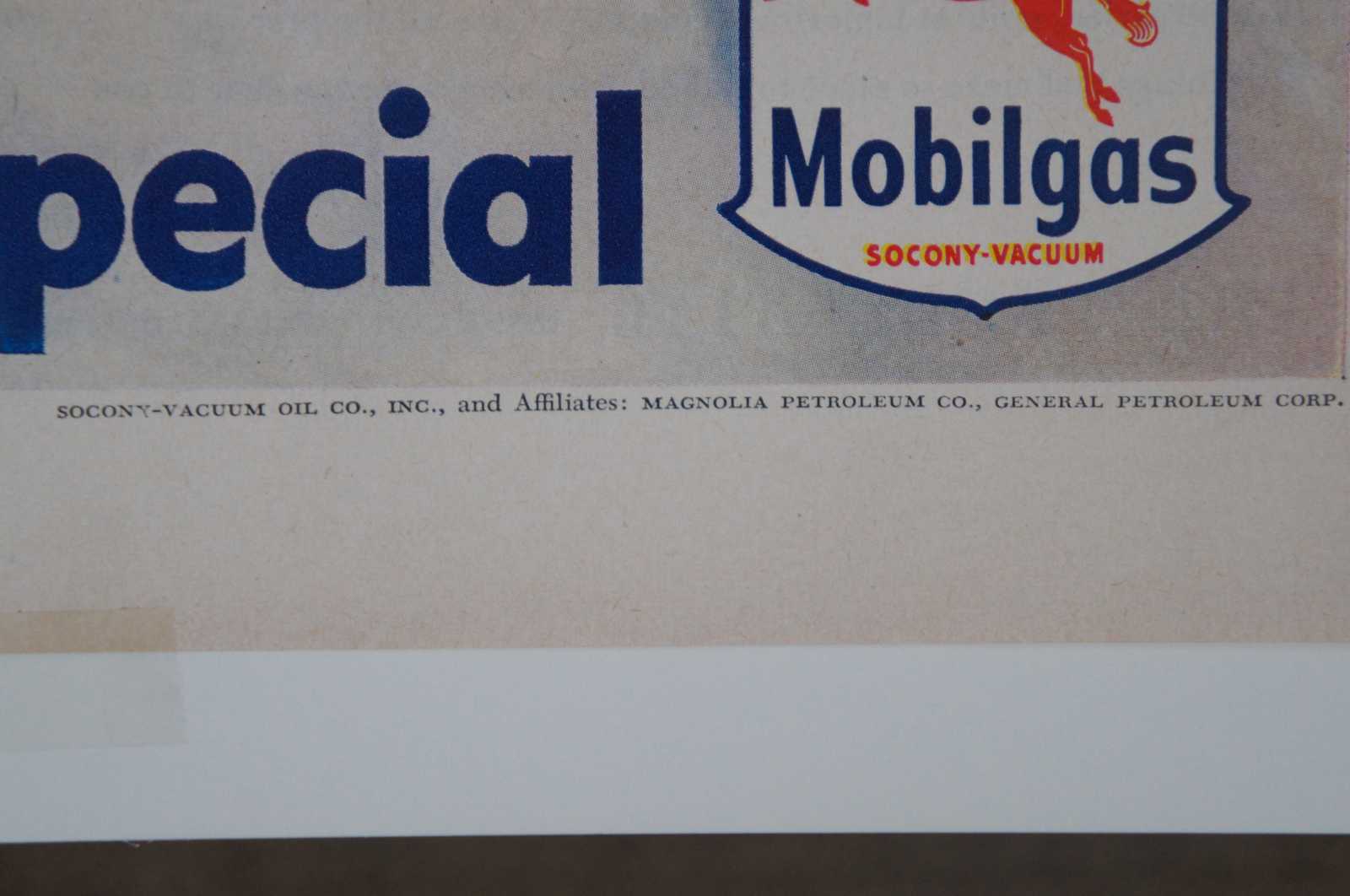 Vintage 1950 magazine page advertisement for Mobilgas featuring a red pegasus. Socony Vacuum Magnolia Petroleum.