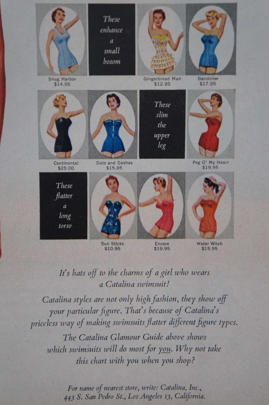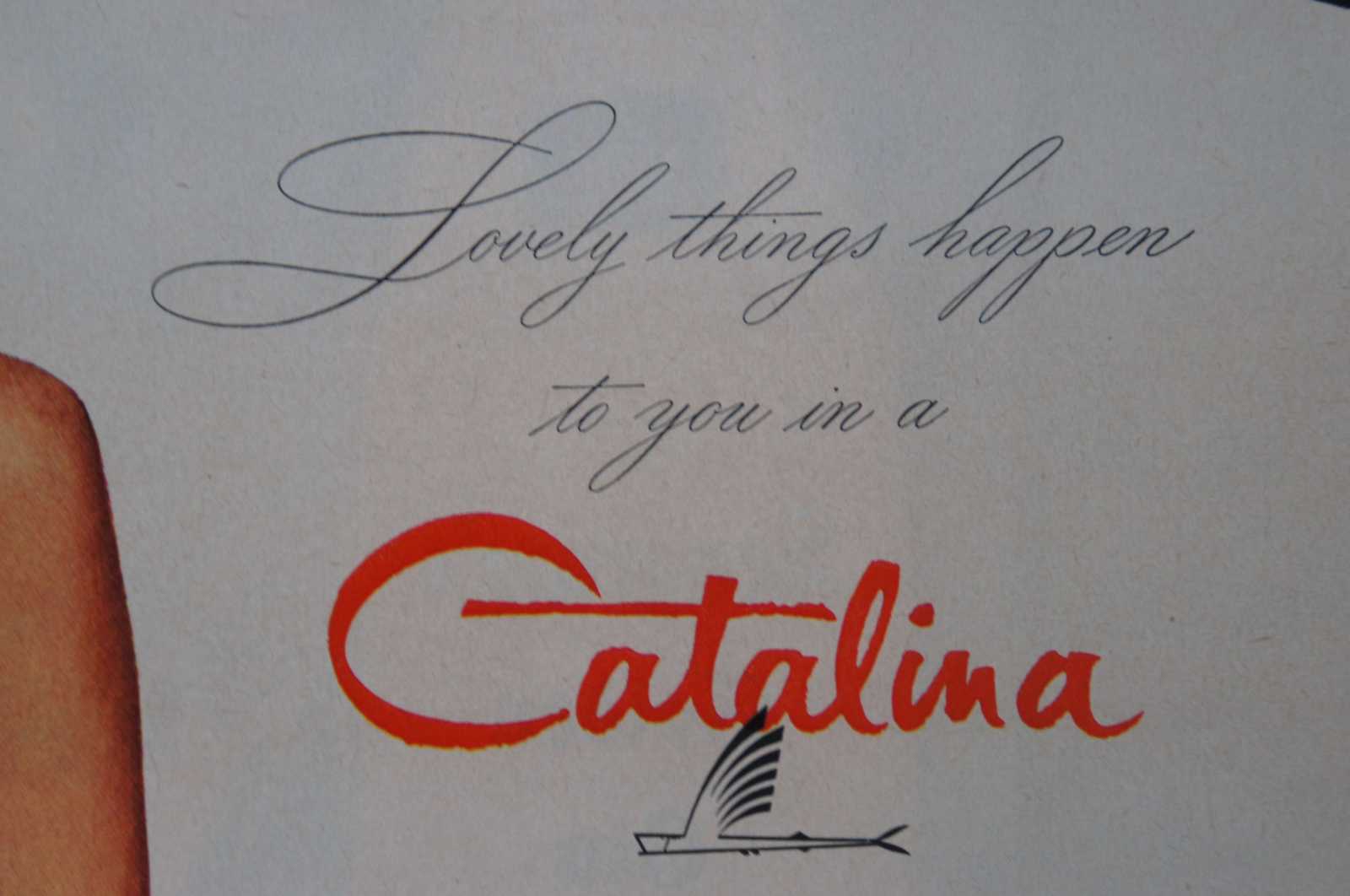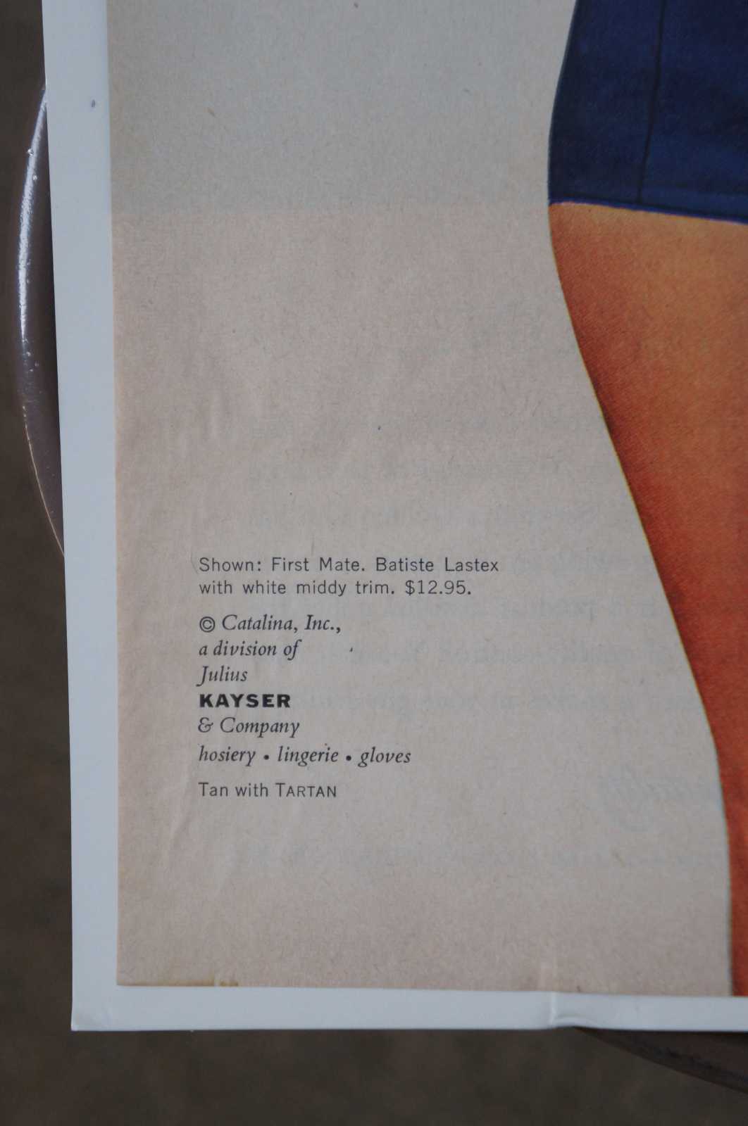 Vintage 1955 magazine page advertisement for Catalina women’s bikini swimwear. A division of Julius Kayser and company. Hosiery, lingerie, gloves. Seagrams Golden Gin ad on verso.