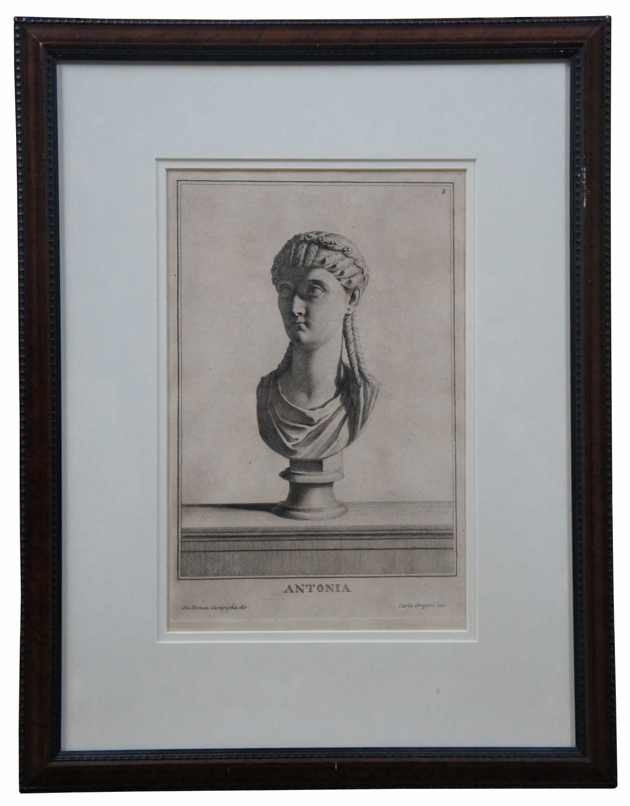 Antique Italian copper-line engraving of the bust of Roman Emperor Vespasian and his consort Antonia by Carlo Gregori after Giovanni Domenica Campiglia’s series “Musei Capitolini,” a series of work inspired by the sculptures of the Capitoline Museum in Rome. “Vespasian was Roman emperor from 69 to 79. The fourth and last in the Year of the Four Emperors, he founded the Flavian dynasty that ruled the Empire for 27 years. He reformed the financial system of Rome after the campaign against Judaea ended successfully, and initiated several ambitious construction projects, including the building of the Flavian Amphitheatre, better known today as the Roman Colosseum. After the death of his wife, Vespasian's long-standing mistress, Antonia Caenis, became his wife in all but formal status, a relationship that continued until she died in 75.” “Carlo Gregori was an Engraver and etcher from an Italian family of engravers; born 1702 in Lucca, active in, and died 1759 in Florence; studied with Johann Jakob Frey in Rome before pursuing his career in Florence. He made prints after Old Master paintings by, for example, Titian, Rubens and Correggio and also reproduced artists' portraits. His engravings illustrated some important 18th century publications, including Ignazio Enrico Hugford's work (1762) on Anton Domenico Gabbiani. He primarily signed with his name in full, but also used an interwoven monogram of c and g.” “Giovanni Domenico Campiglia (1692–1768) was an Italian painter and engraver from Florence, active under the patronage of the House of Medici.