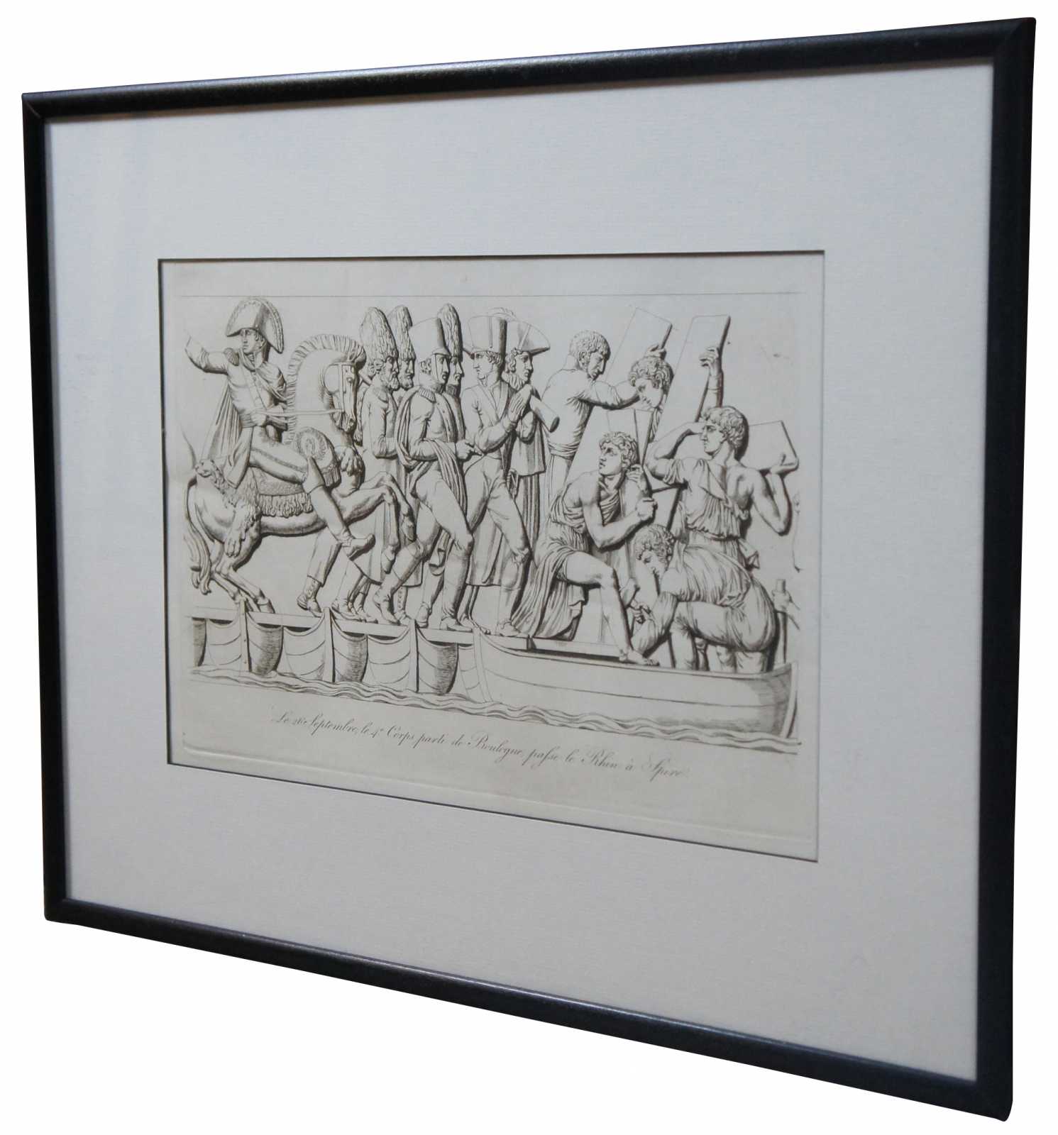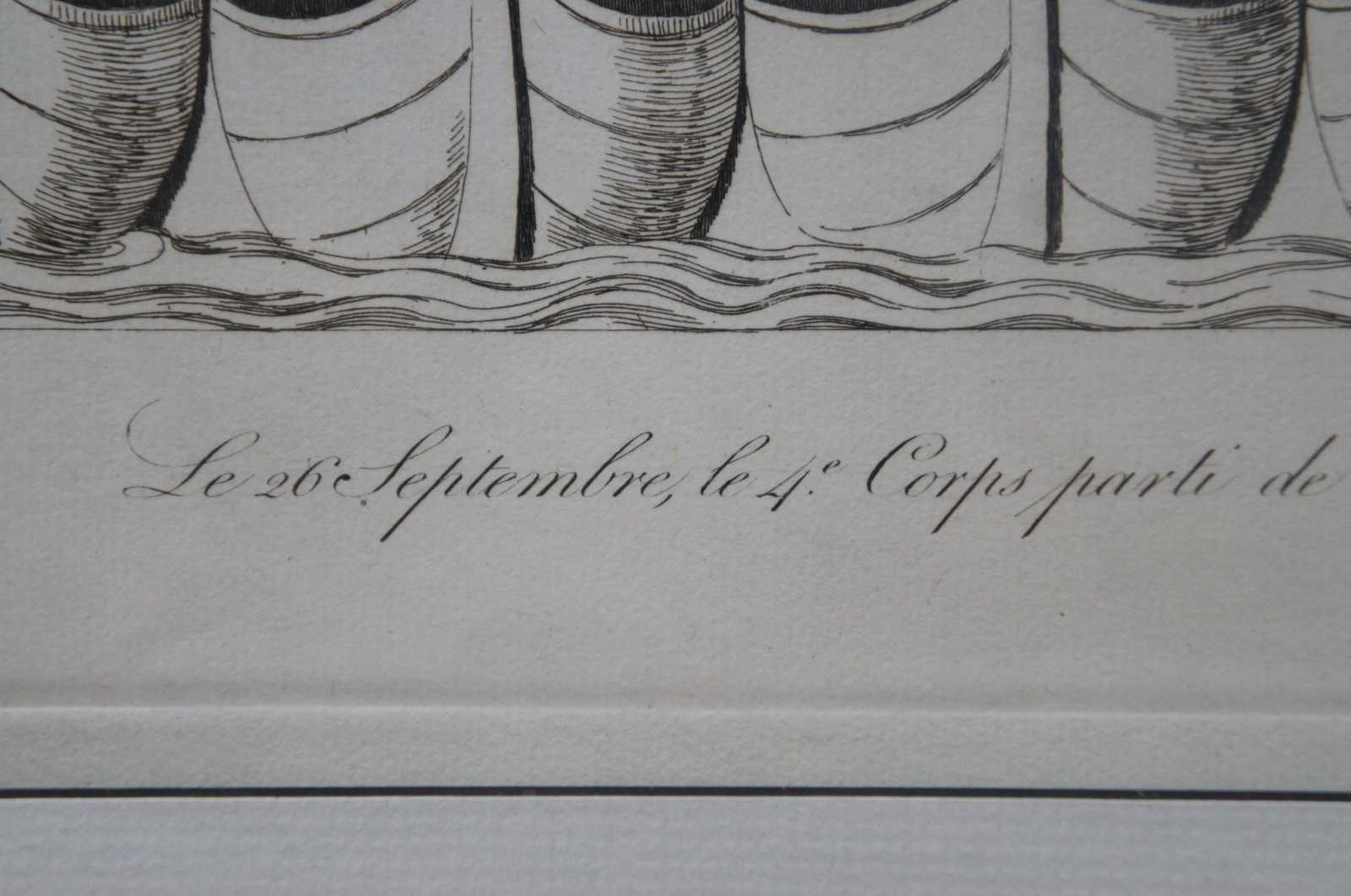 Antique engraving with the phrase “On September 26, the 4th Corps left from Boulogne, Crossed the Rhine to Spire” along the bottom, showing a troop of French naval soldiers crossing a floating bridge as it’s being built by workmen in roman style togas.