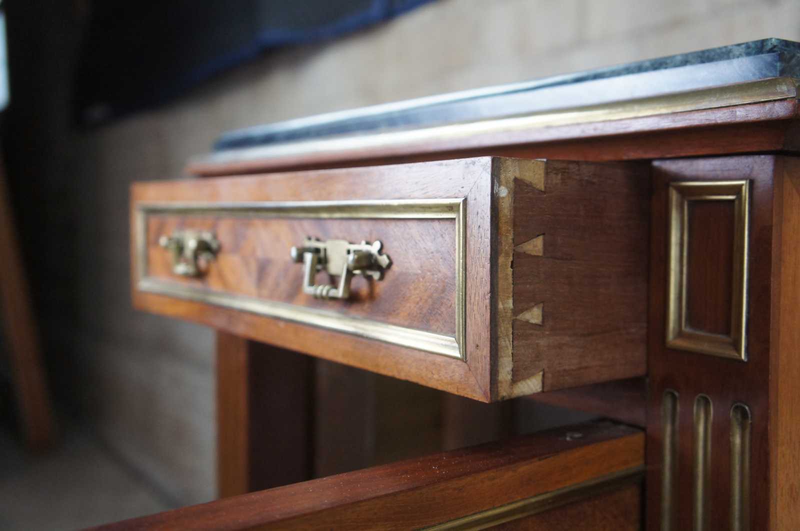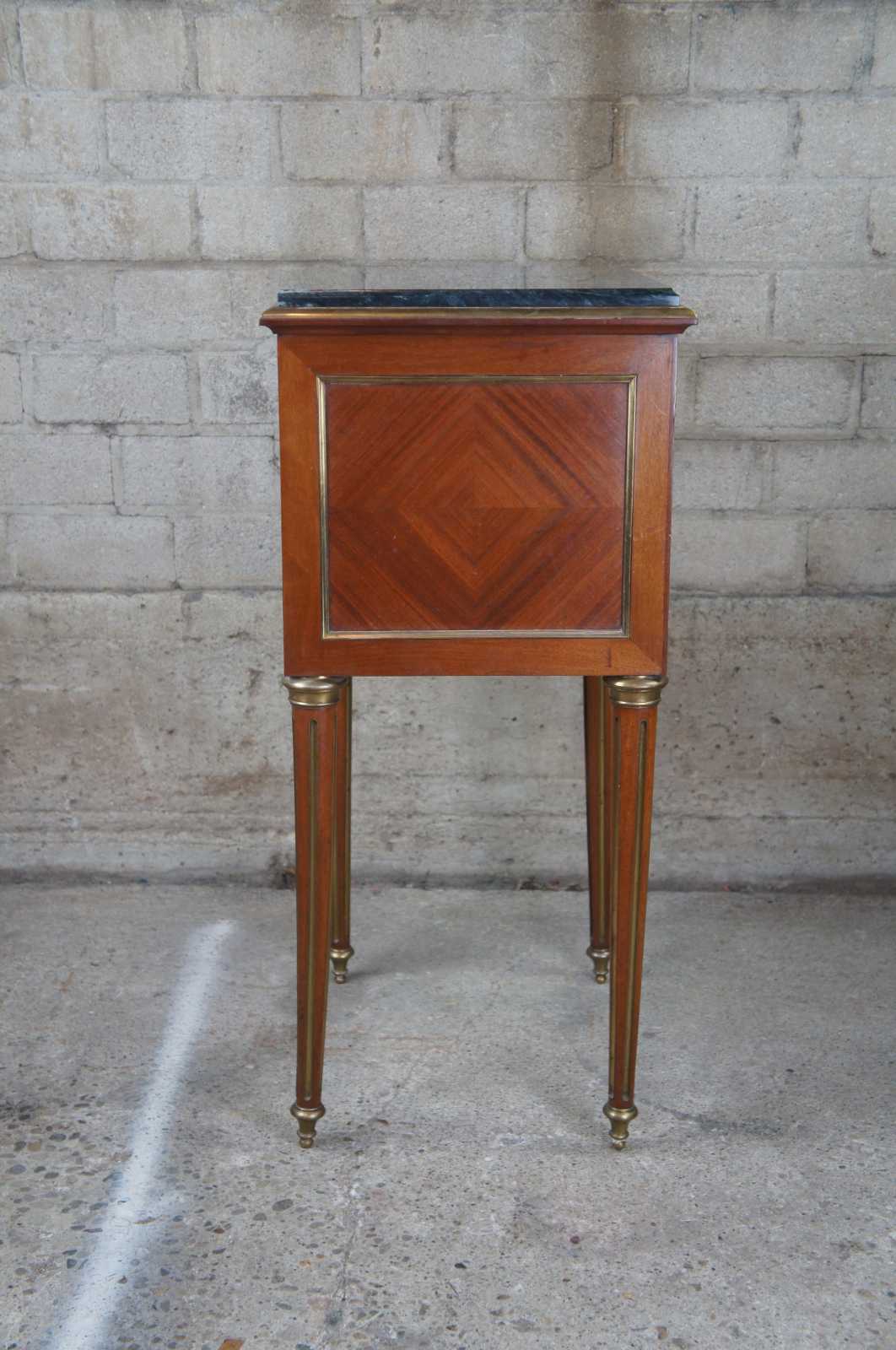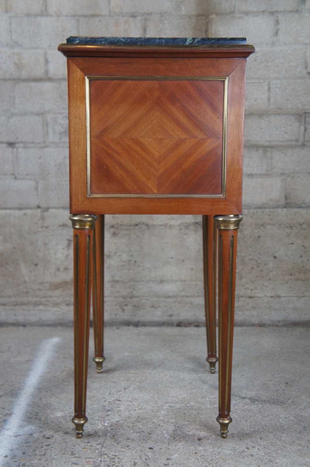Antique 19th century Louis XV French humidor or side table. Made of walnut with matchbook parquetry veneer featuring brass inlaid accents and hardware, green marble top and tapered fluted legs. Interior humior compartment is lined with white marble and has a neat upper clasp mechanism for opening and closing the door.