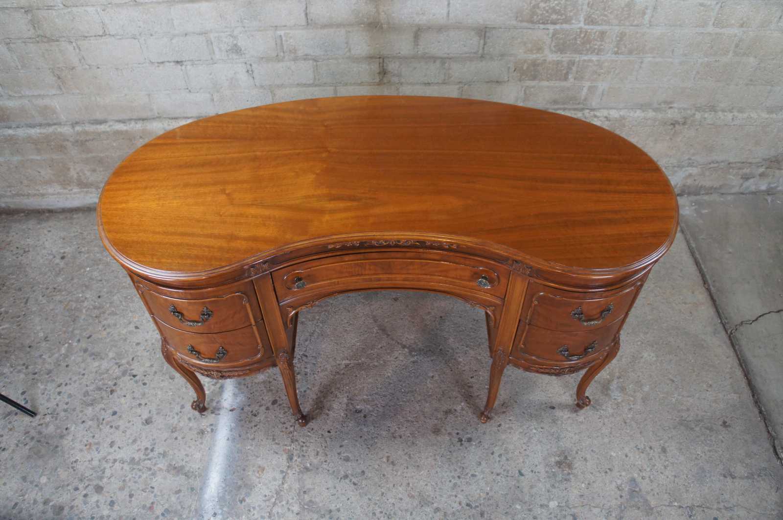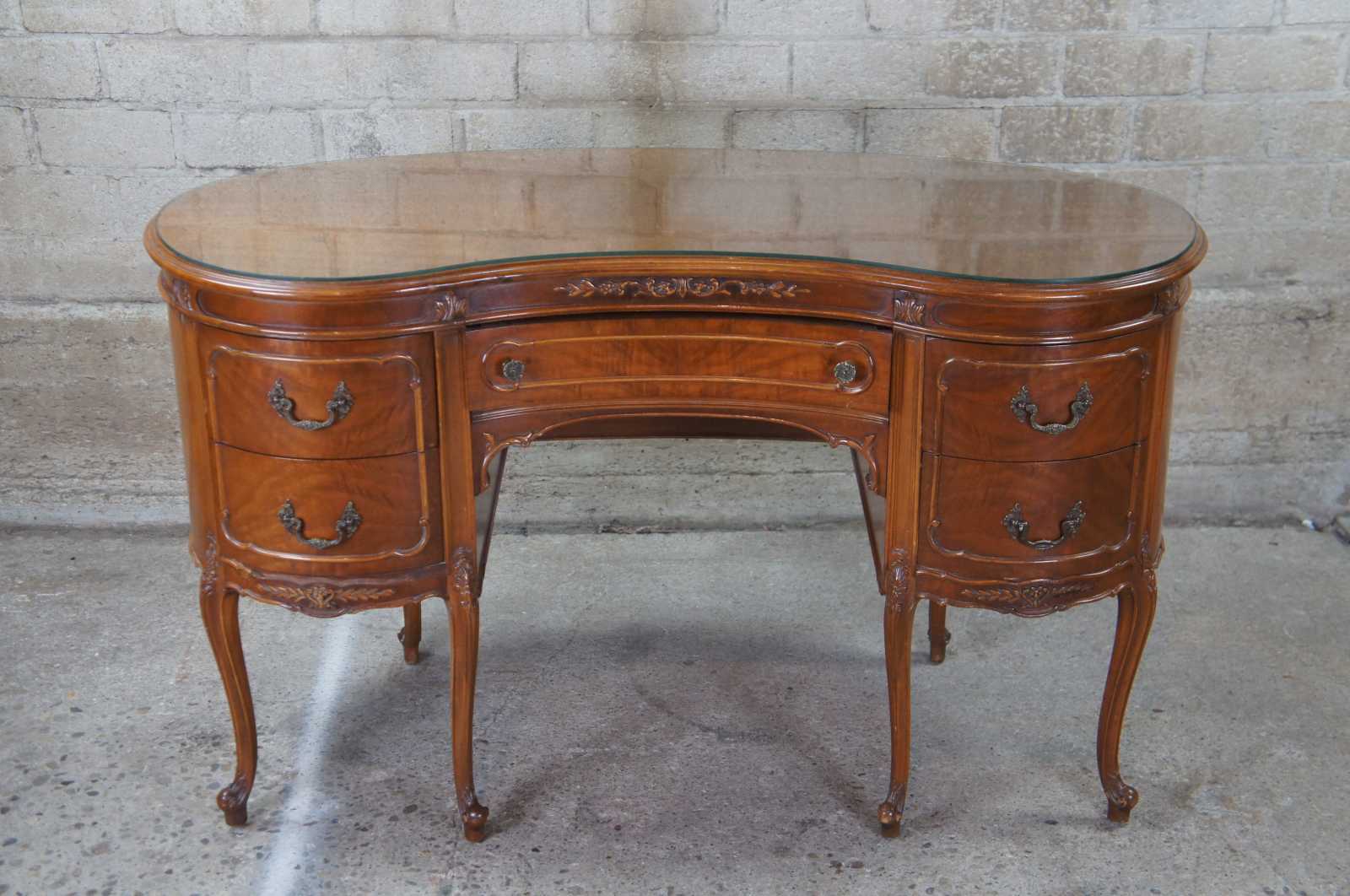 1940s kidney bean or crescent shaped writing desk. Made from walnut with crotch veneer along the front. Features French styling with carved foliate accents and five drawers supported by six cabriole legs over scrolled feet. Includes Glass tops.