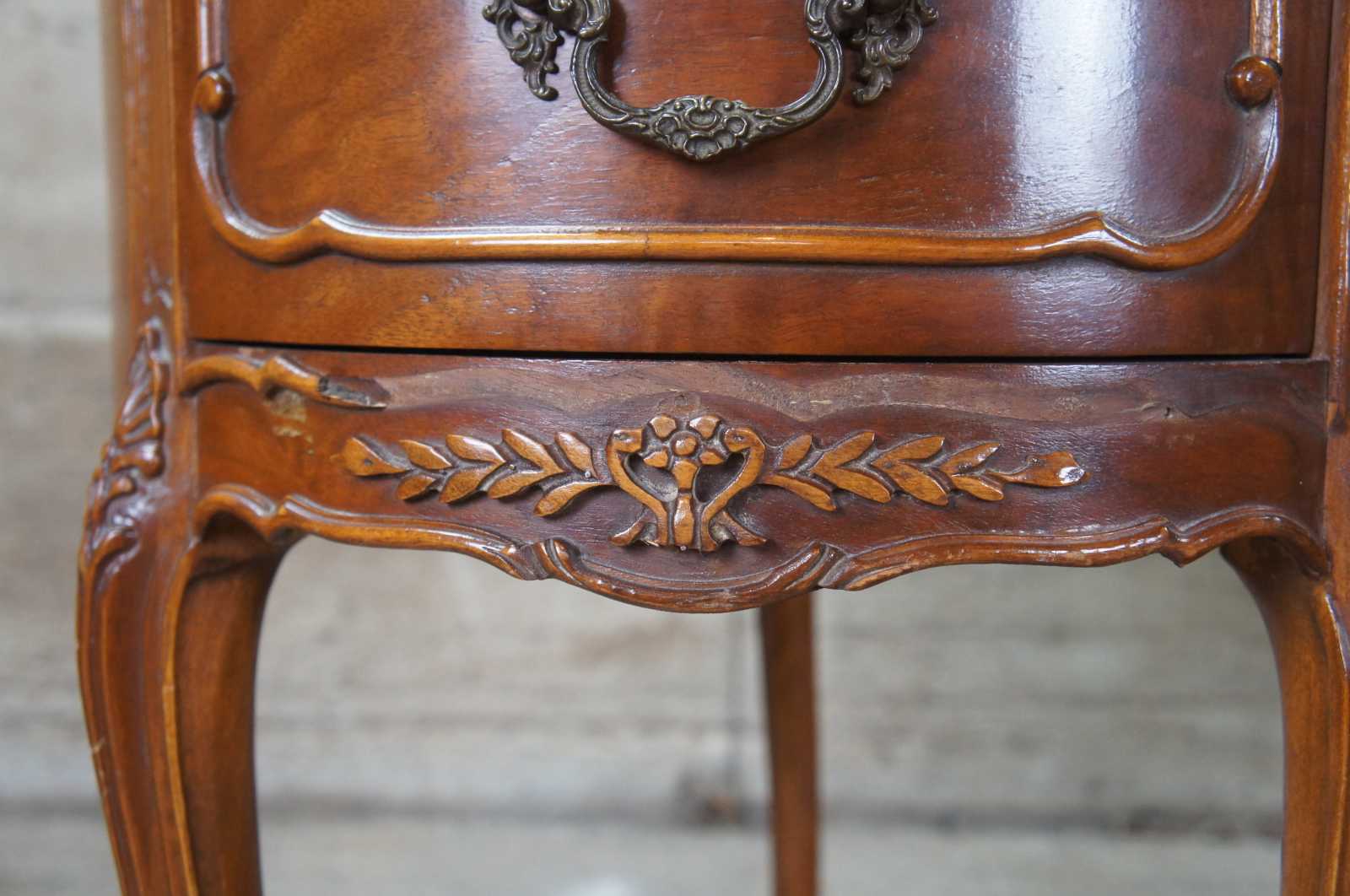 Good overall, light wear and distressing, some missing trim, two chips to underside of glass, see pictures.