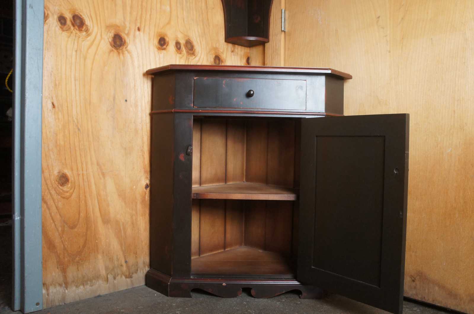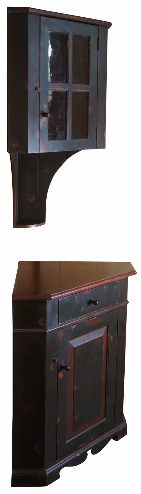 Late 20th century J.L. Terharn corner cabinet and hanging cupboard. Made from maple with a naturally distressed black finish over reddish brown. Features a hanging cupboard with glass front and plate groovese over a lower corner cabinet with drawer.