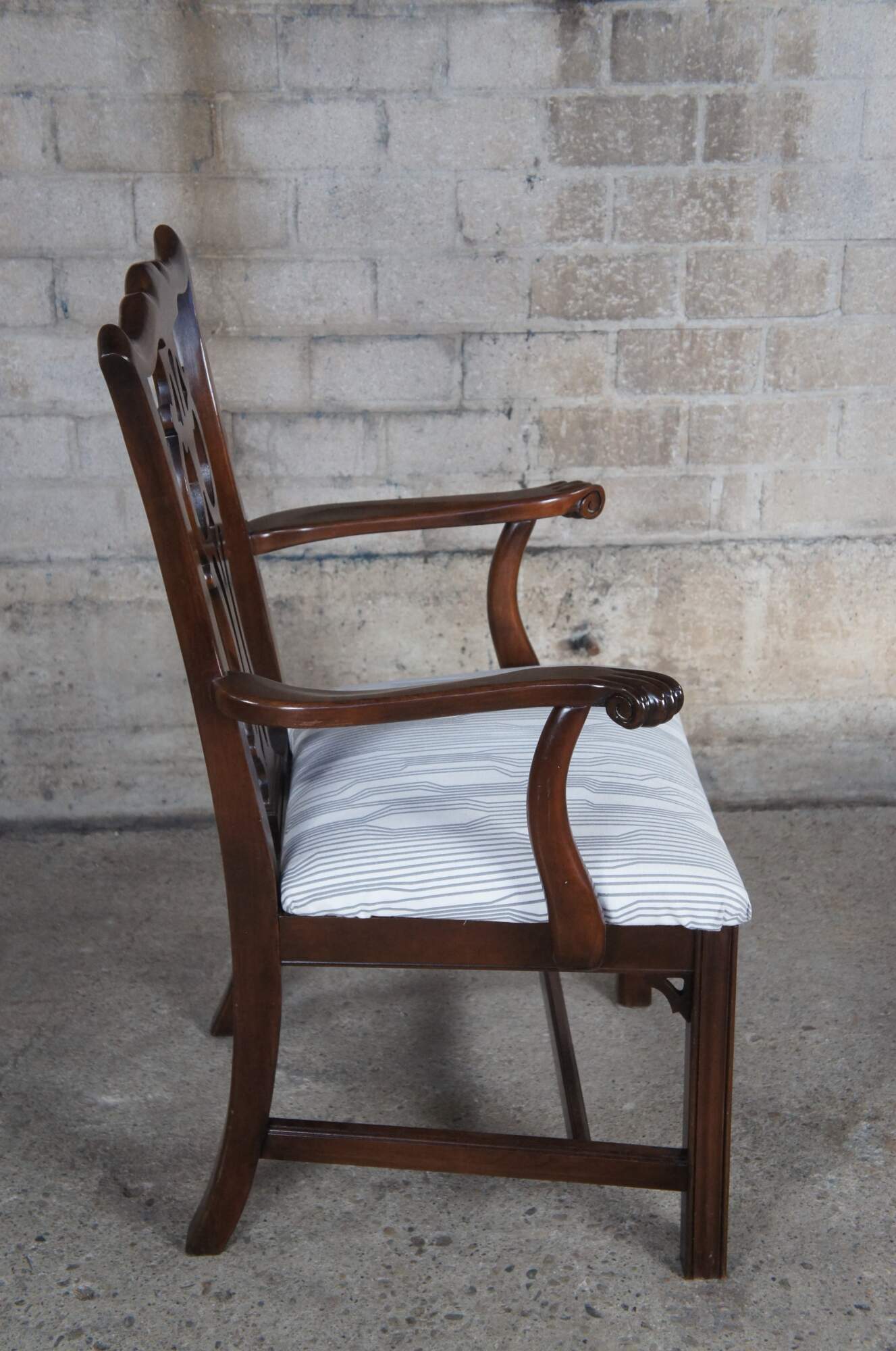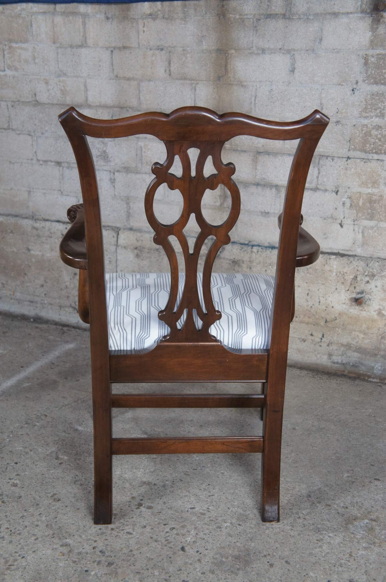 Ethan Allen Splat Back Chippendale Chair, 11-6060A. Part of the Georgian Court Collection. Made from cherry with a serpentine crest rail over pierced splat back and countoured arms. The chair is supported by straight legs with fluted accents. Seat is upholstered in a striped fabric. Circa 1980s
