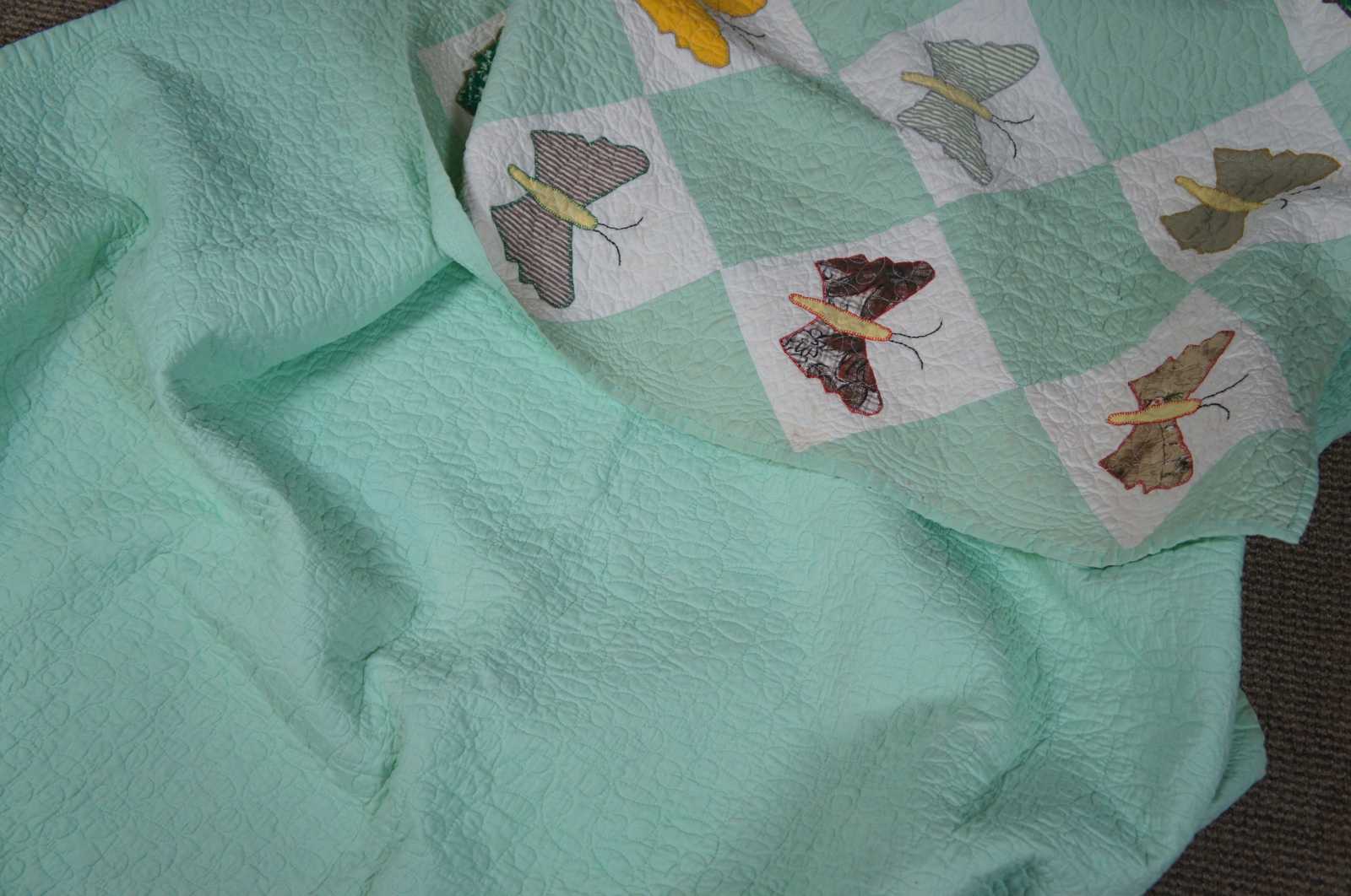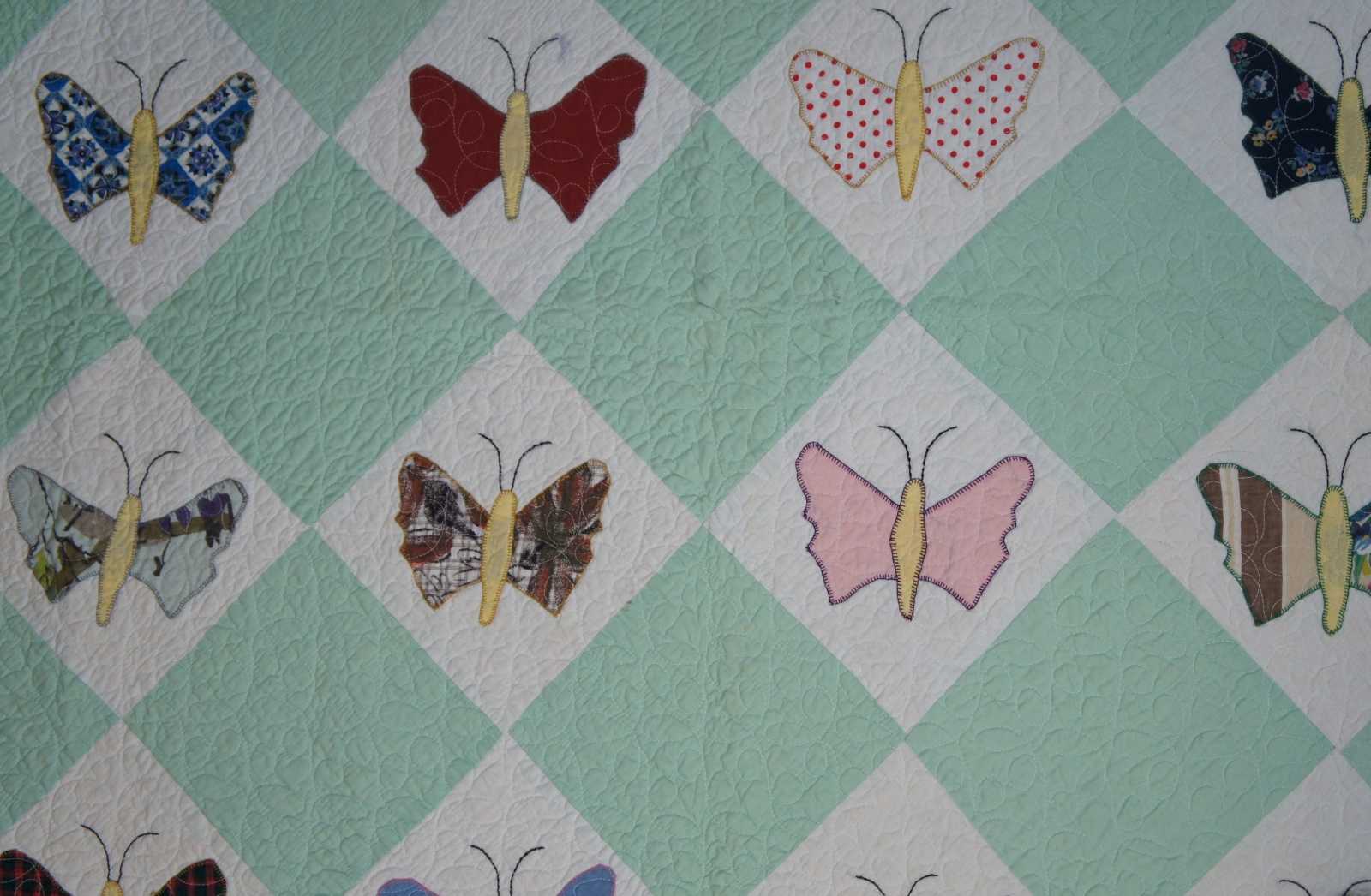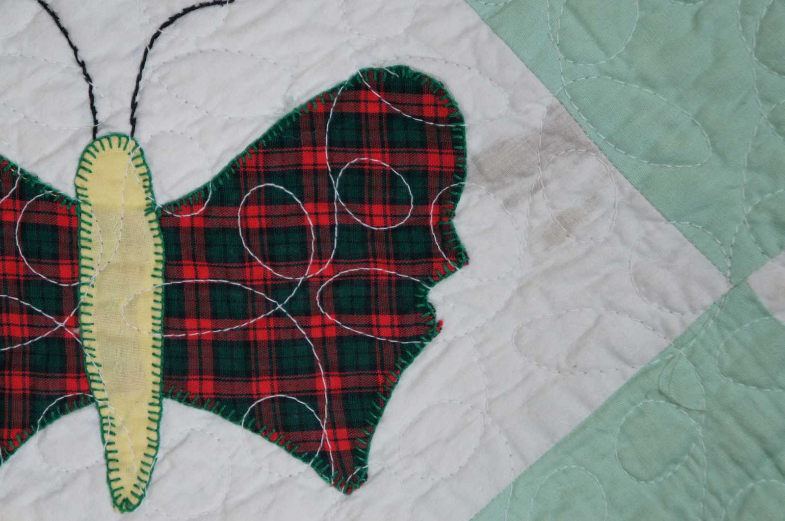 Home made, machine quilted vintage bedspread in a green and white check pattern with appliqued patchwork butterflies.