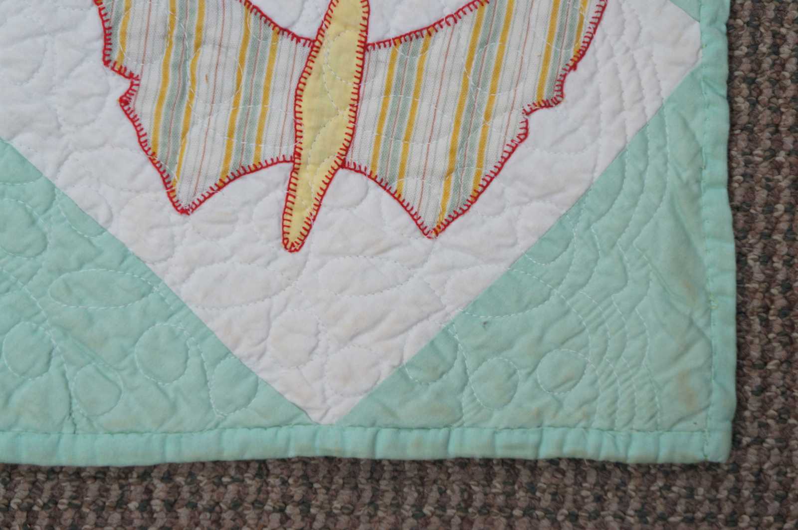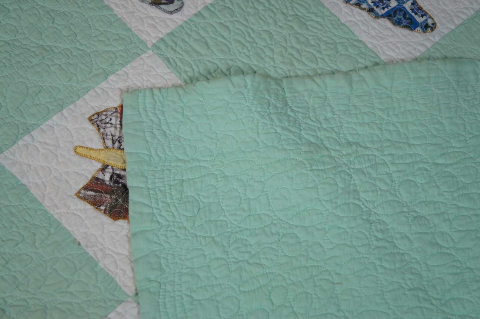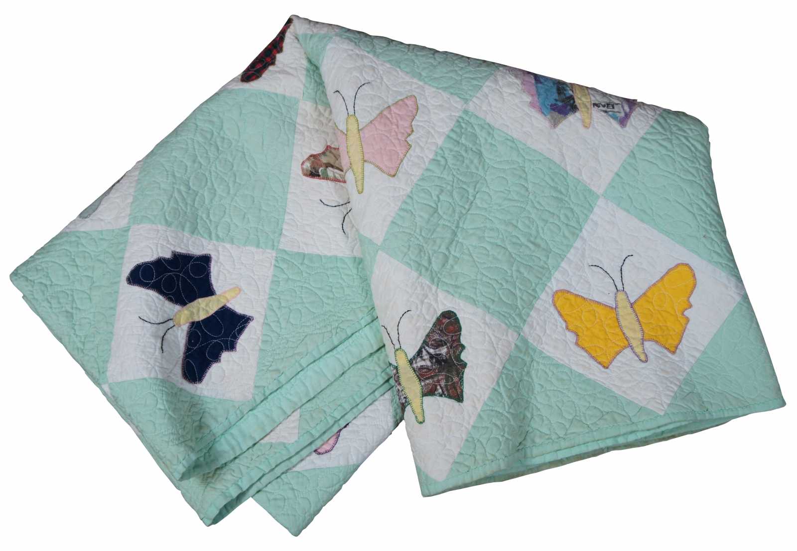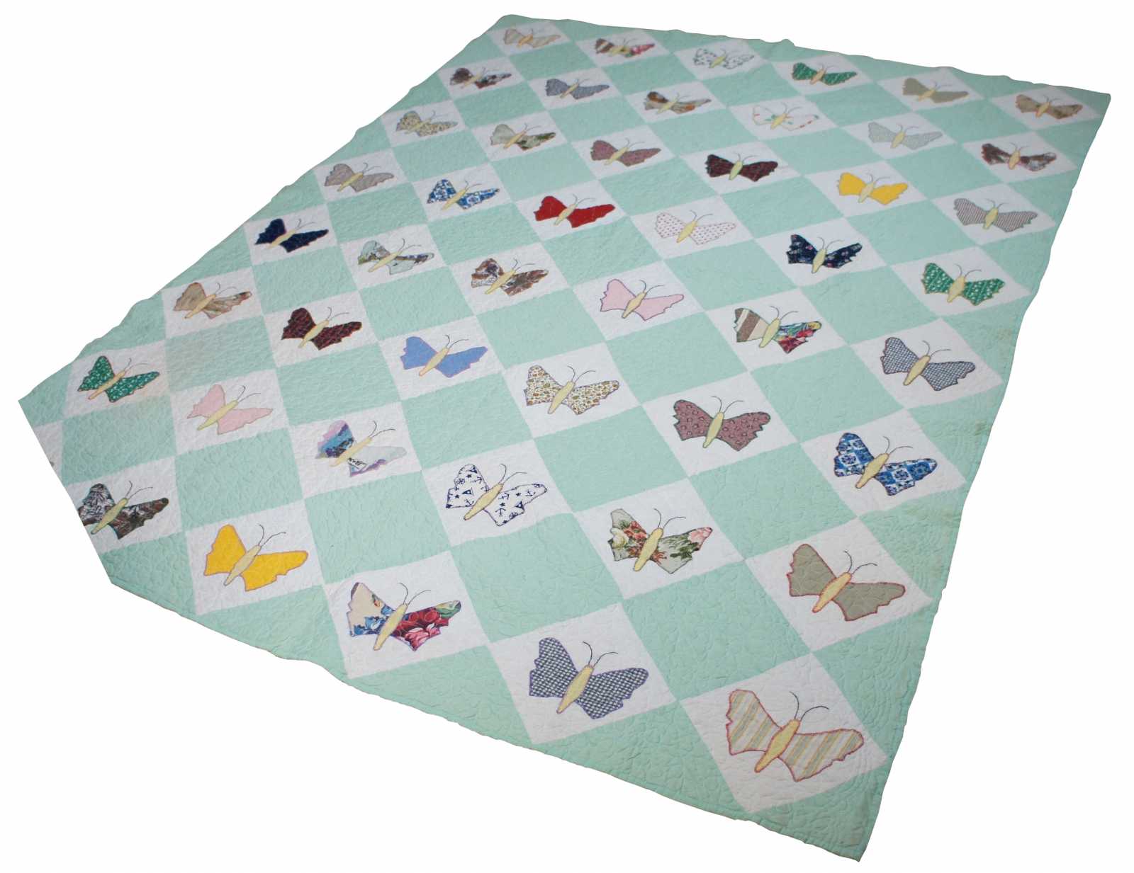 Home made, machine quilted vintage bedspread in a green and white check pattern with appliqued patchwork butterflies.