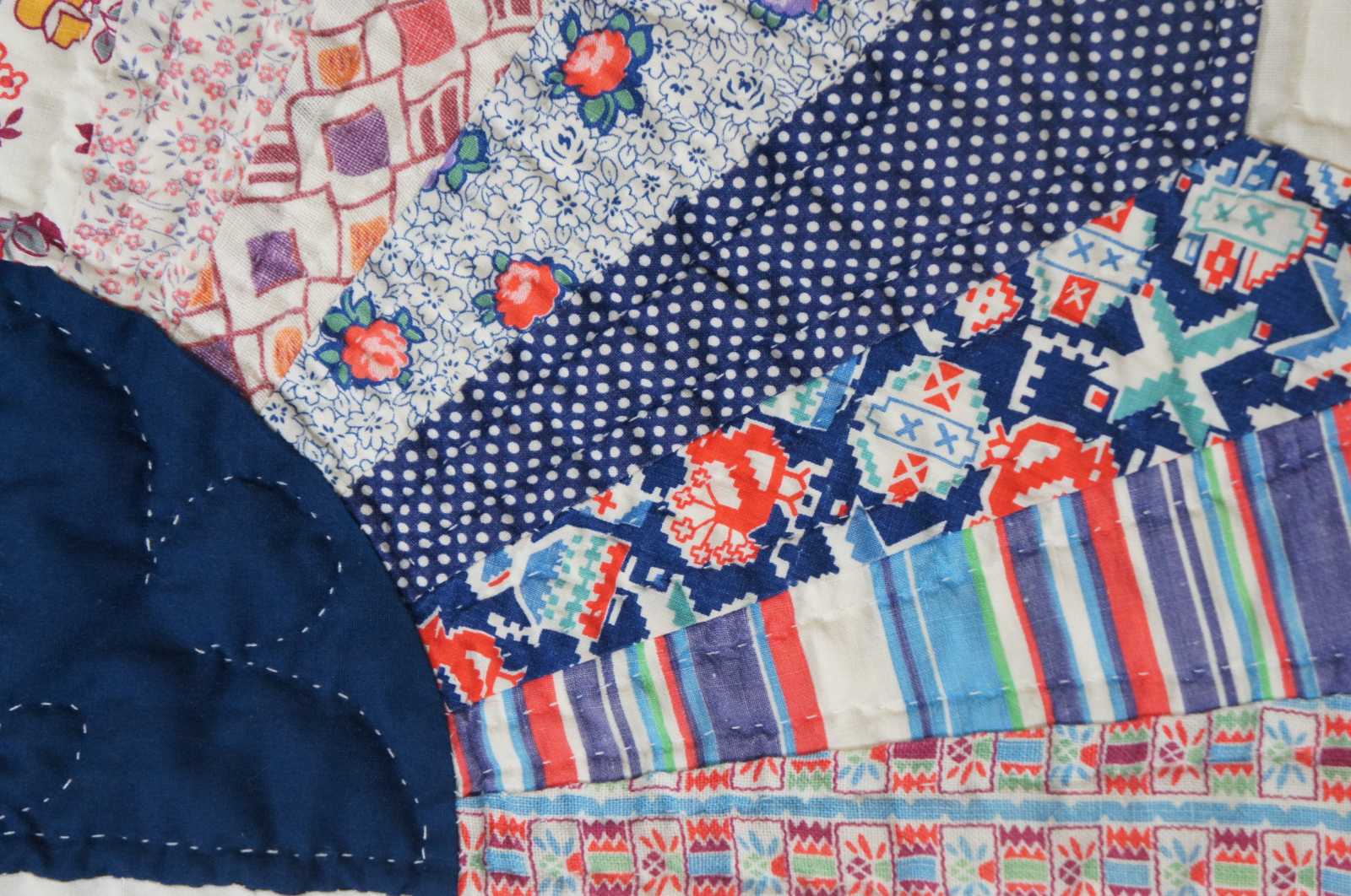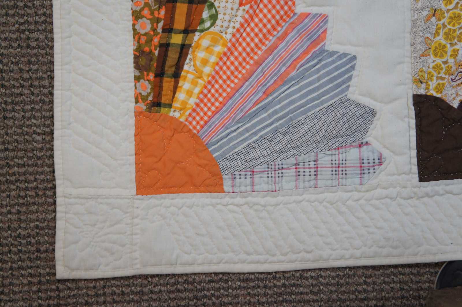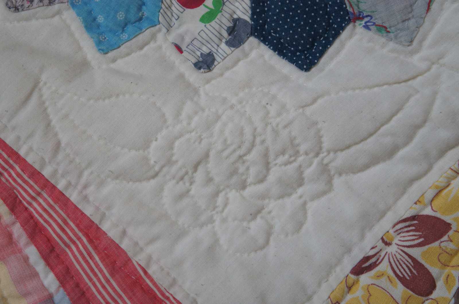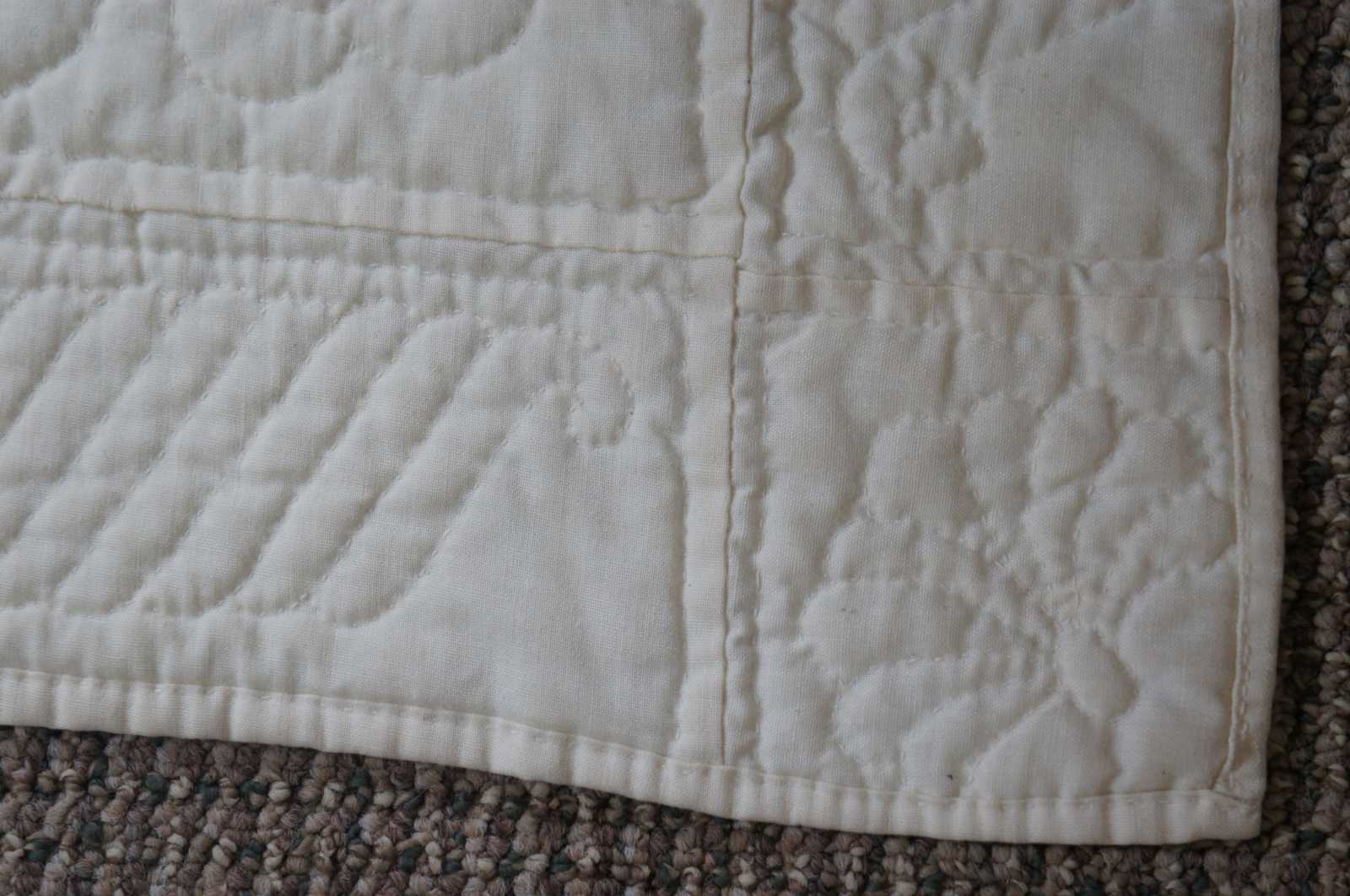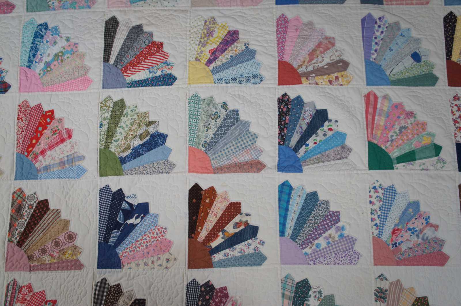 Hand quilted vintage bedspread in white cotton with a grid of patchwork fans.