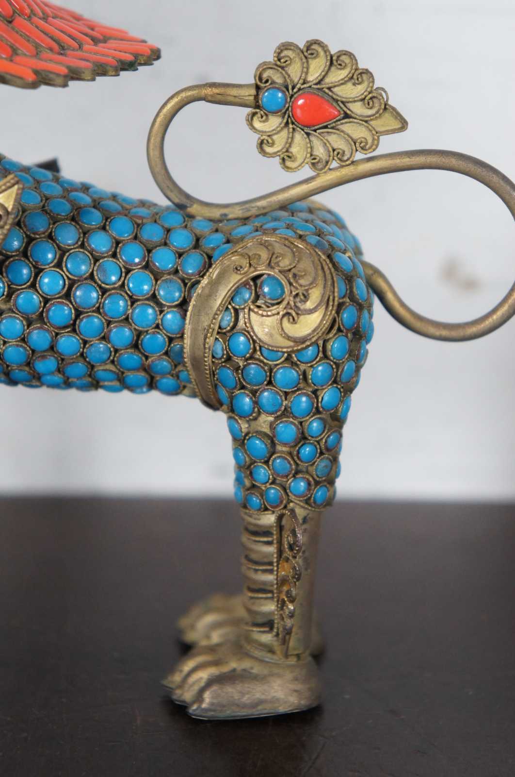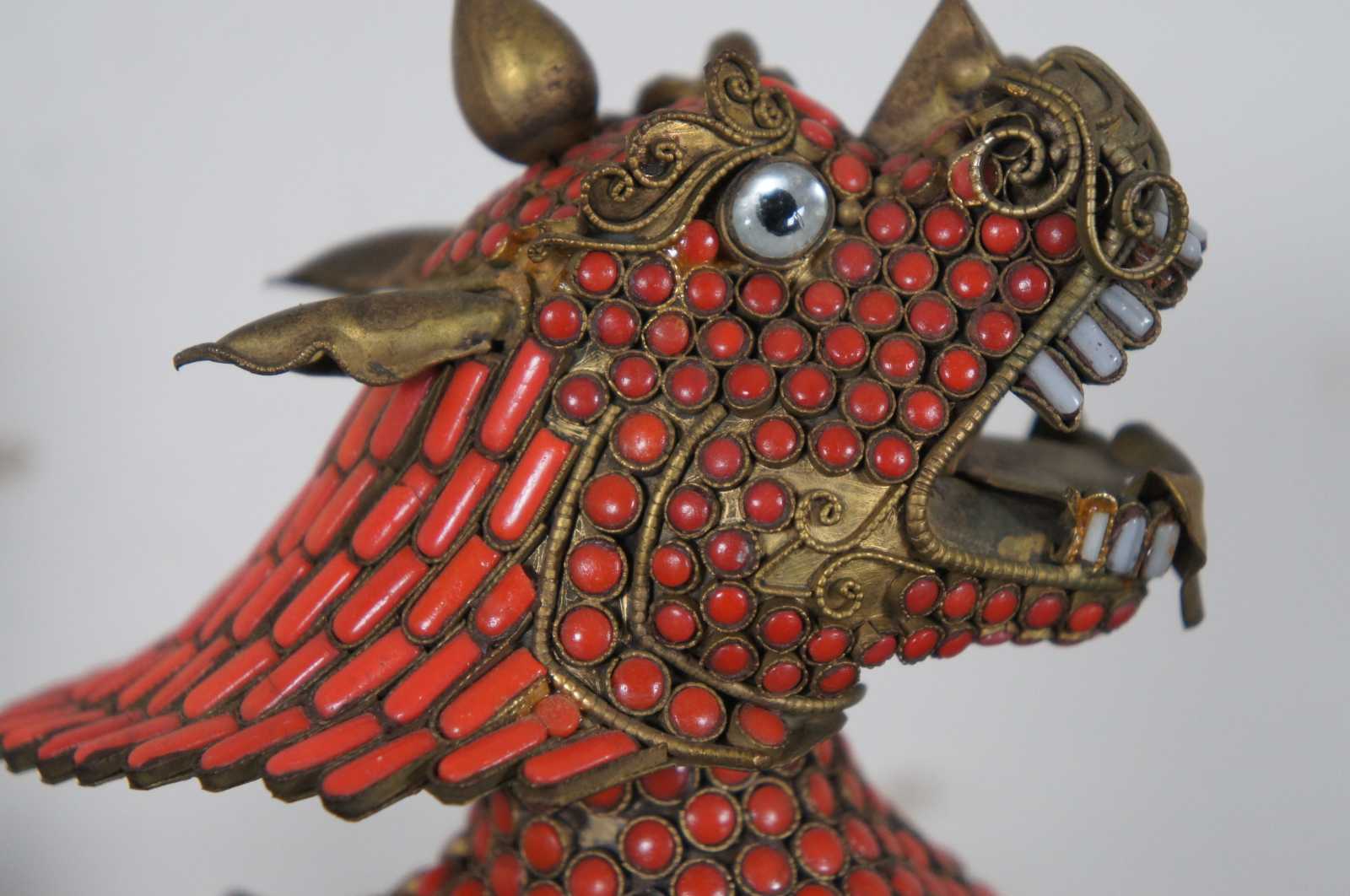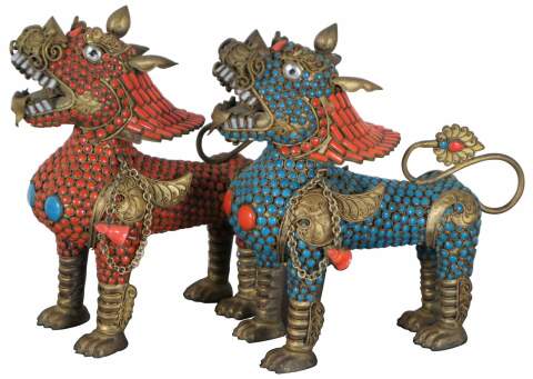 Pair of vintage hand crafted Tibetan or Nepalese brass incense burners in the shape of foo dogs or guardian lions, decorated with inlaid red-orange coral and turquoise stones.