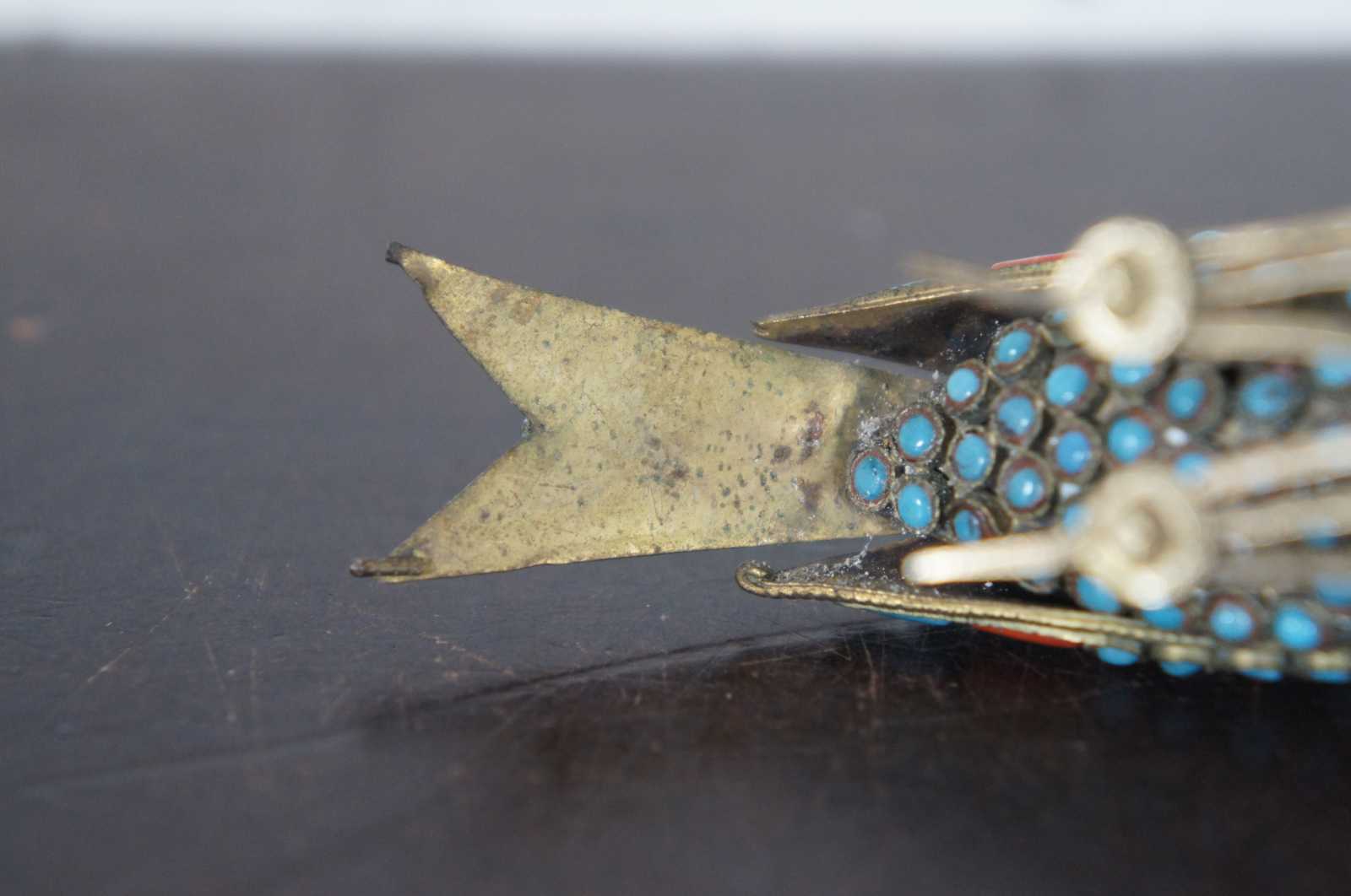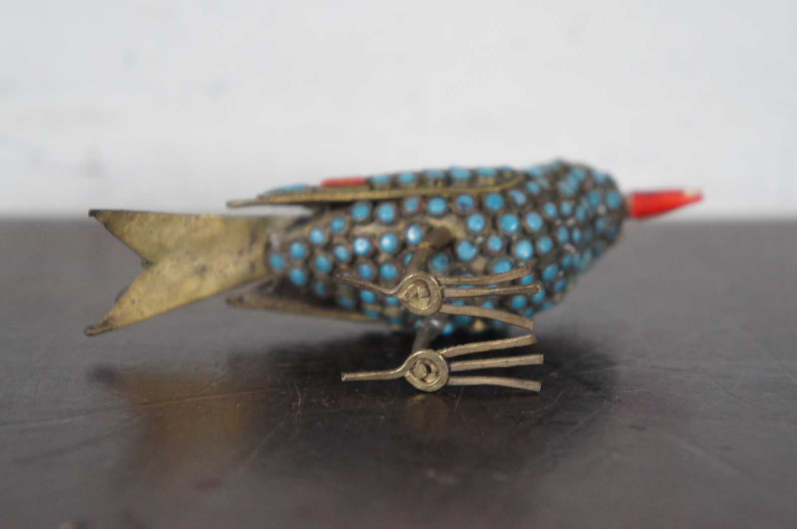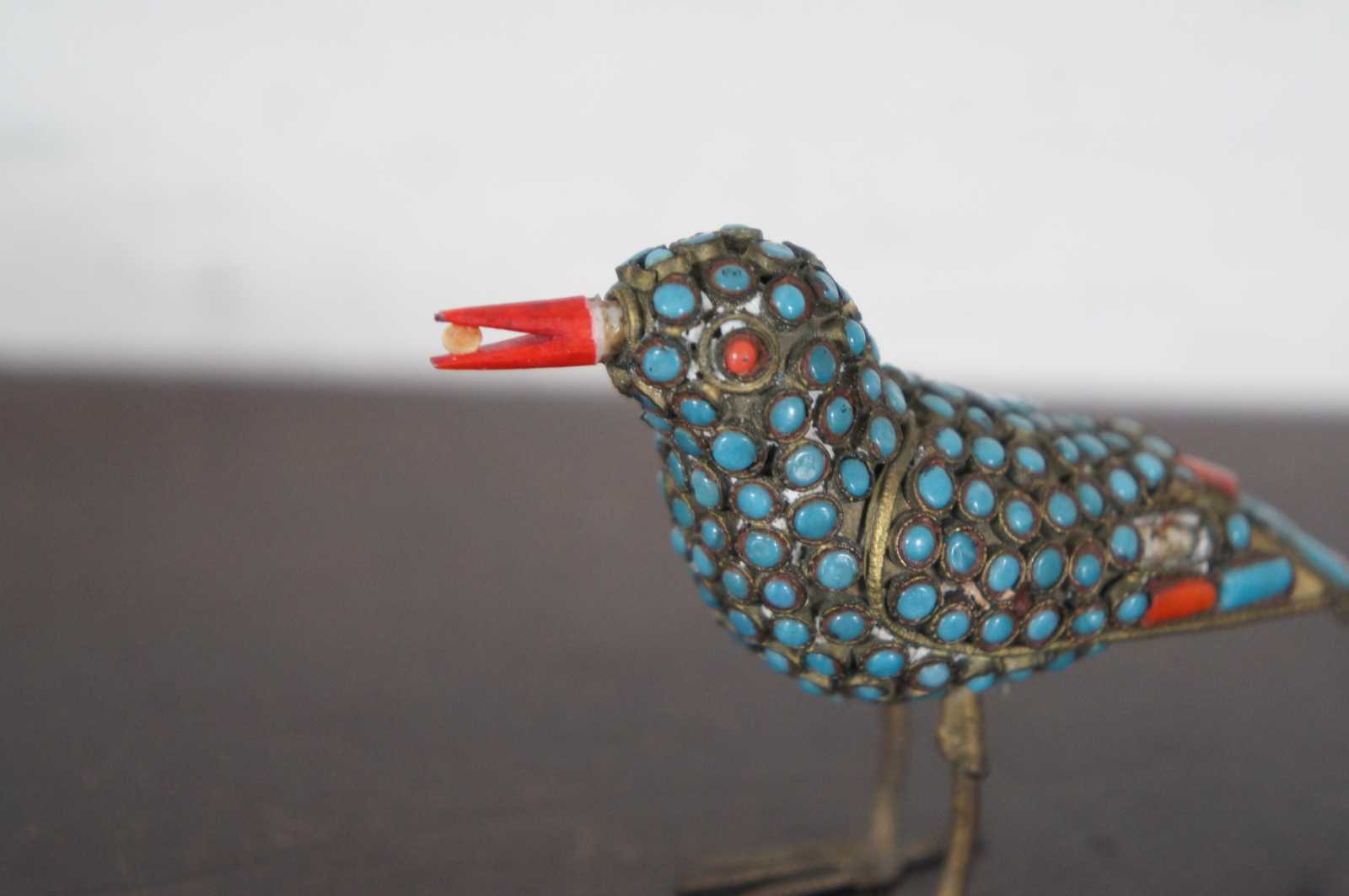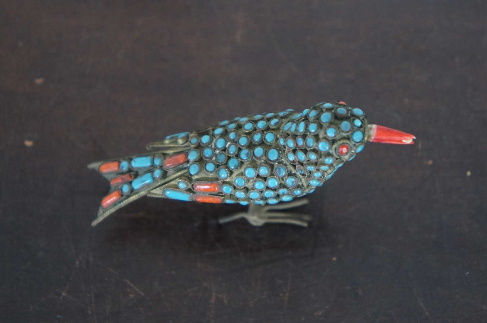 Vintage handmade Tibetan or Nepalese brass figurine in the shape of a bird with a seed in its coral beak, decorated and inlaid with red-orange coral and turquoise stones.