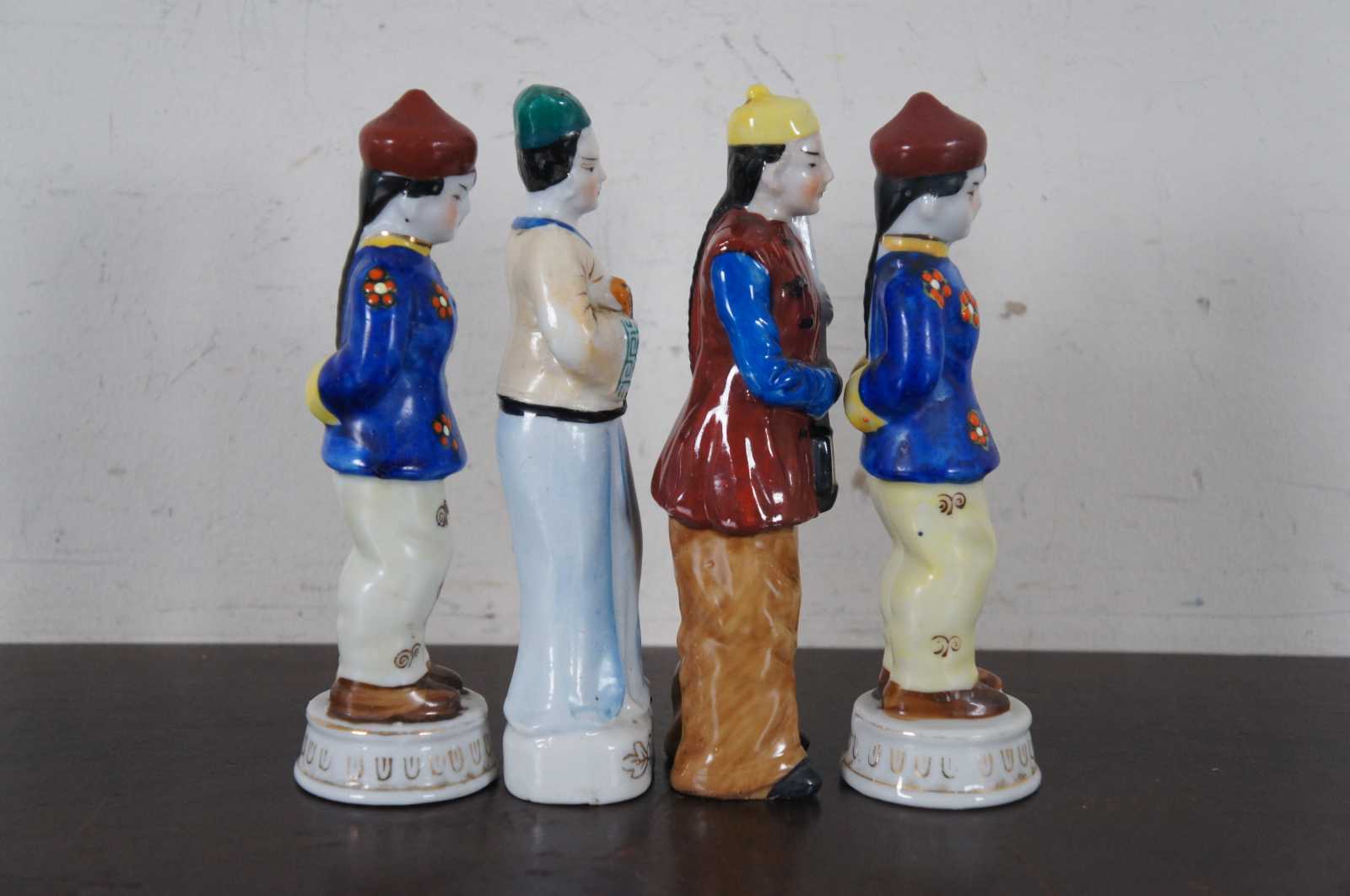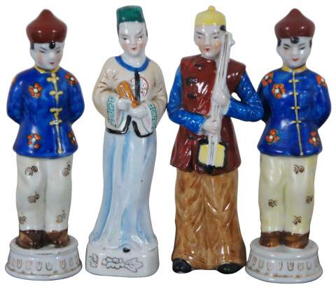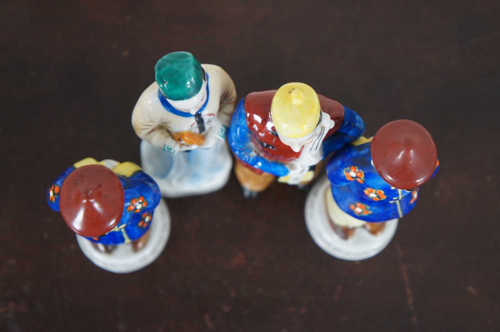 Four vintage hand painted porcelain figurines made in Occupied Japan, a male and female musician holding instruments and two matching figures in blue jackets with their hands behind their back.