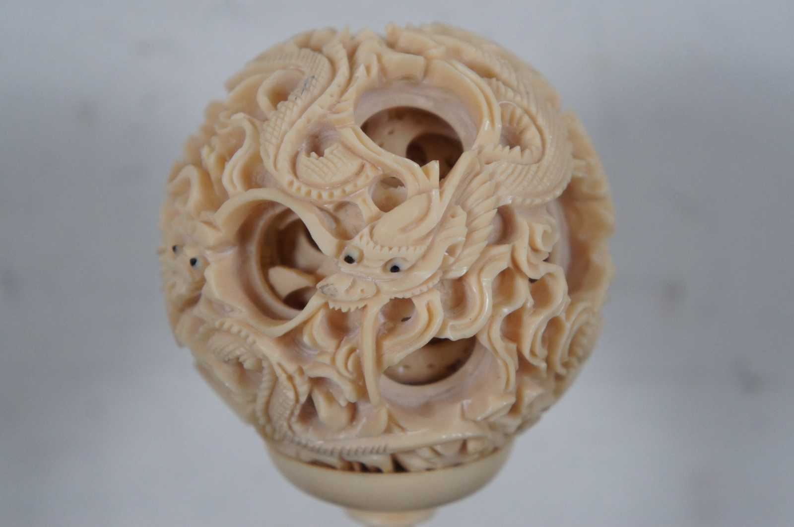 Intricately carved Chinese dragon puzzle ball within ball sculpture and stand. Eight layers on top and 3 along the middle section.