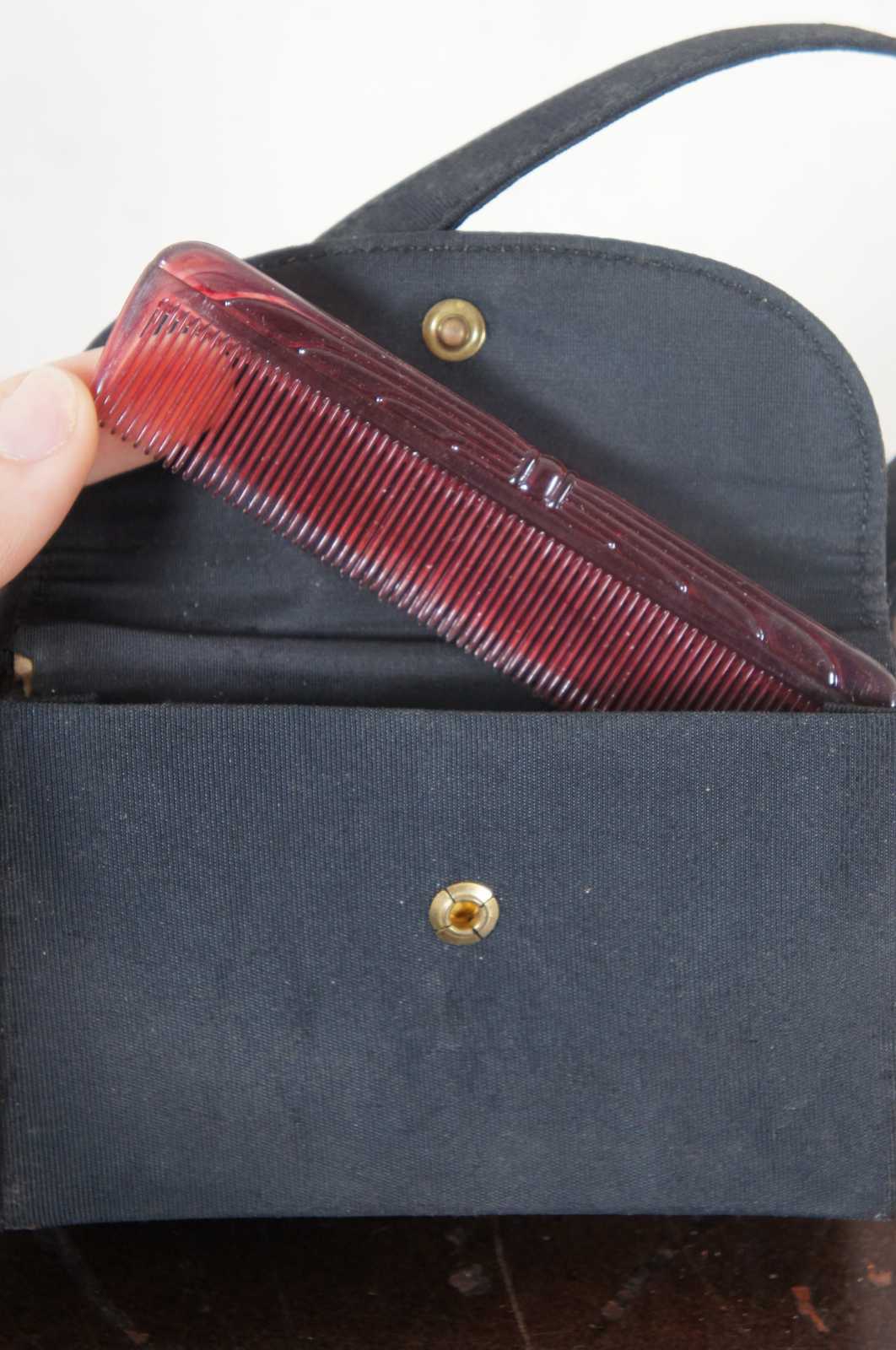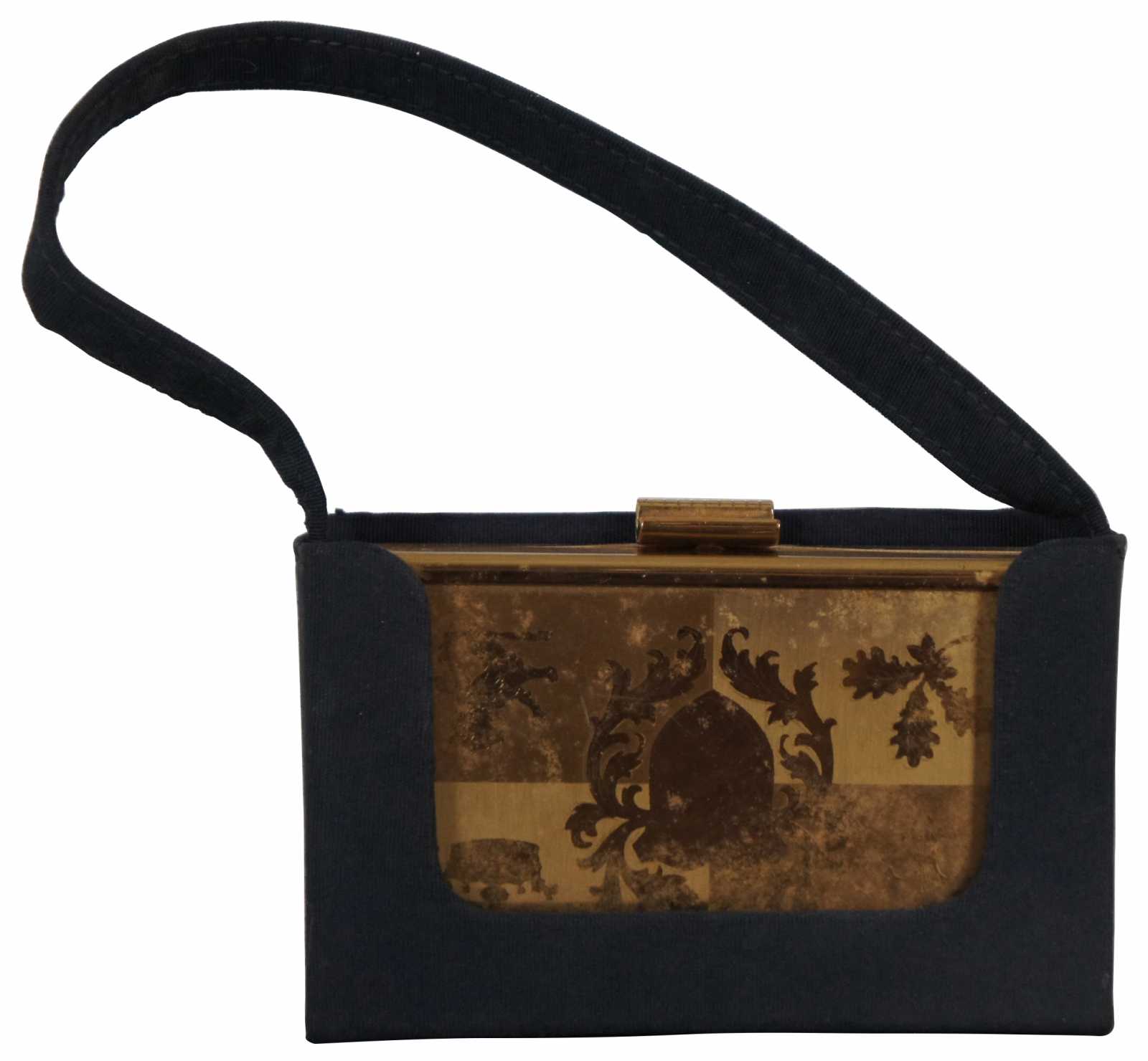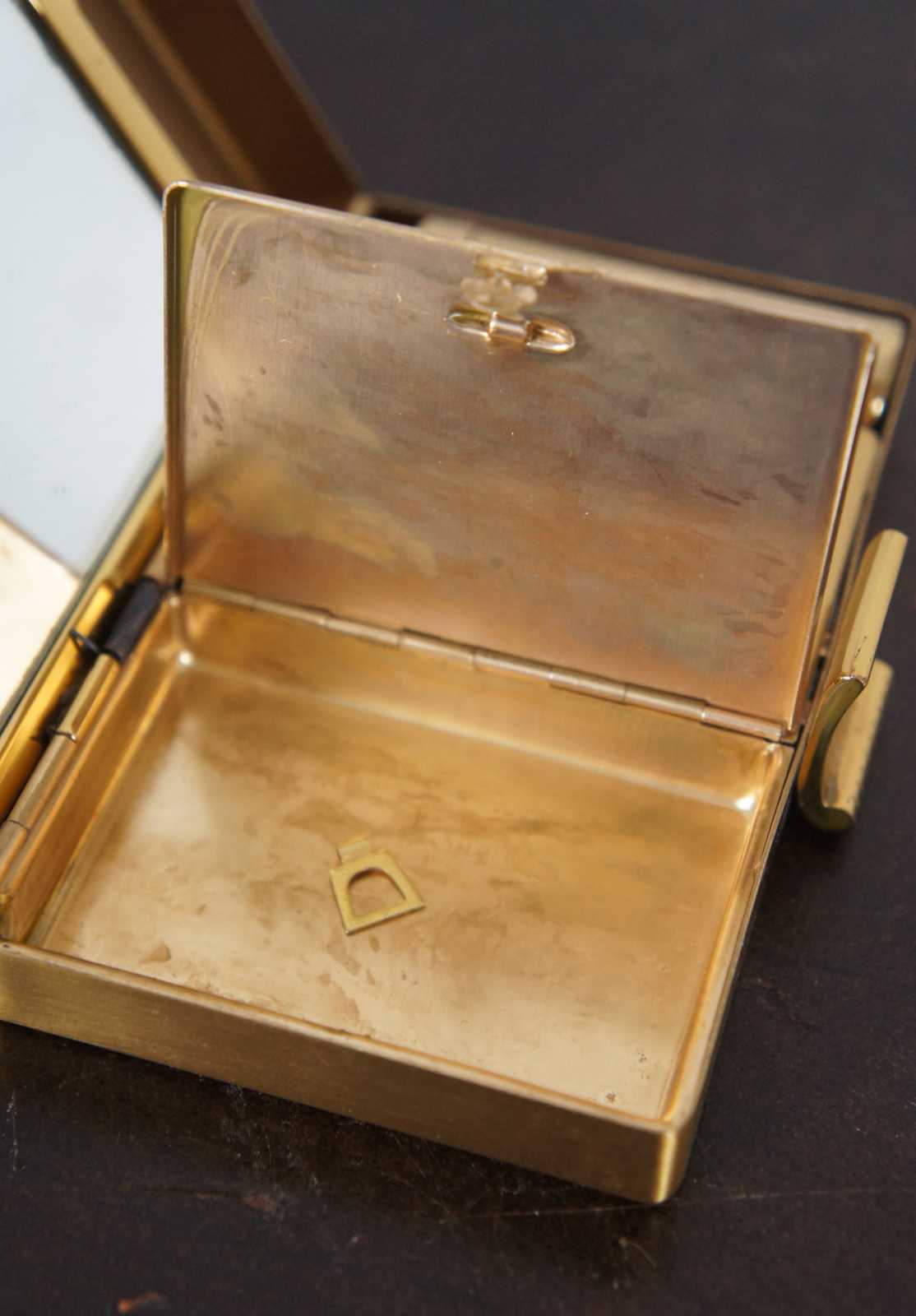 Vintage Elgin American compact make up case in brass decorated with a coat of arms, three interior compartments, powder puff, lipstick tube, and a black carrying case with bakleite comb.