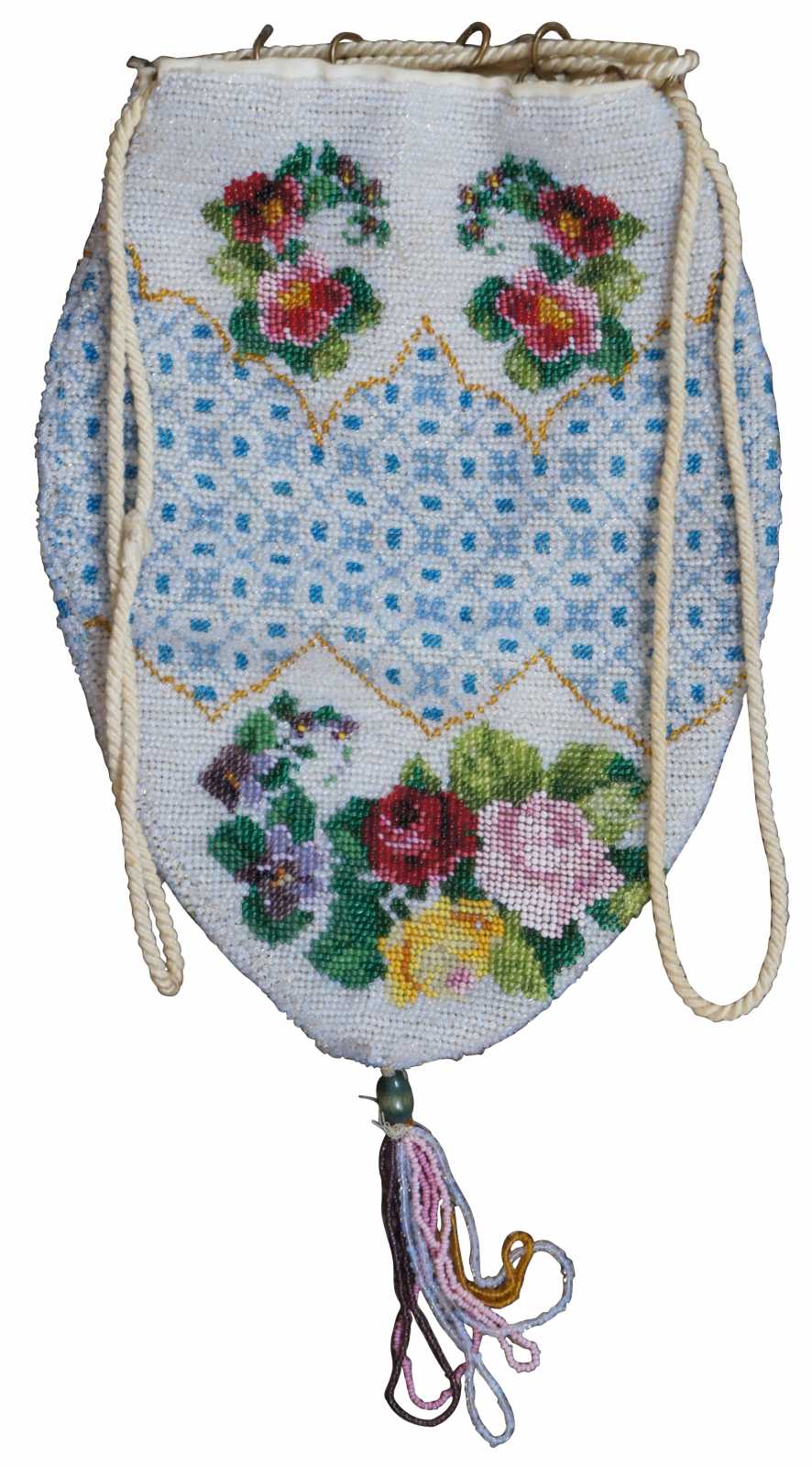 Antique beaded purse or reticule with beaded tassel, brass ring drawstring top and a pattern of roses above and below a blue and white geometric band.