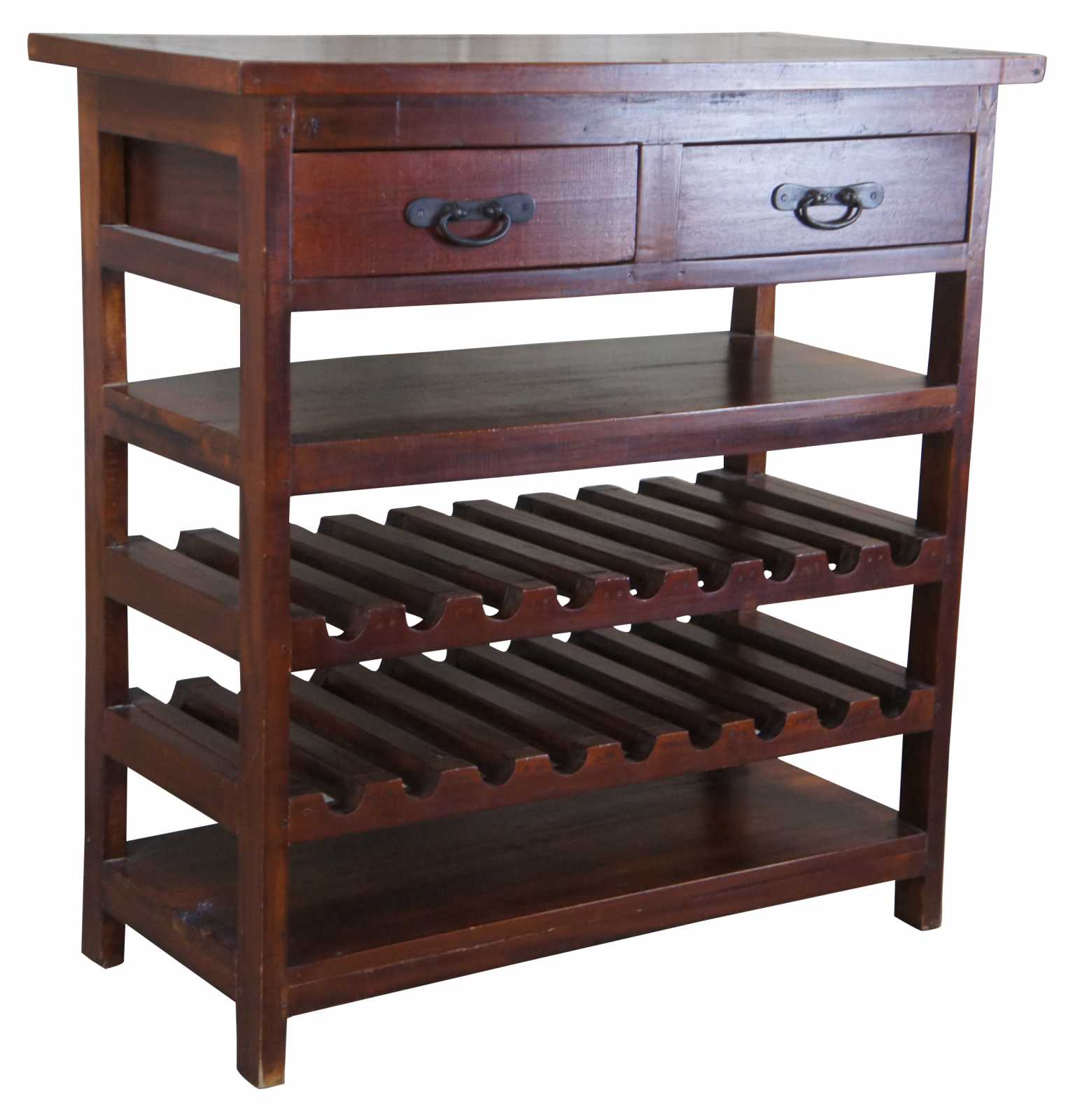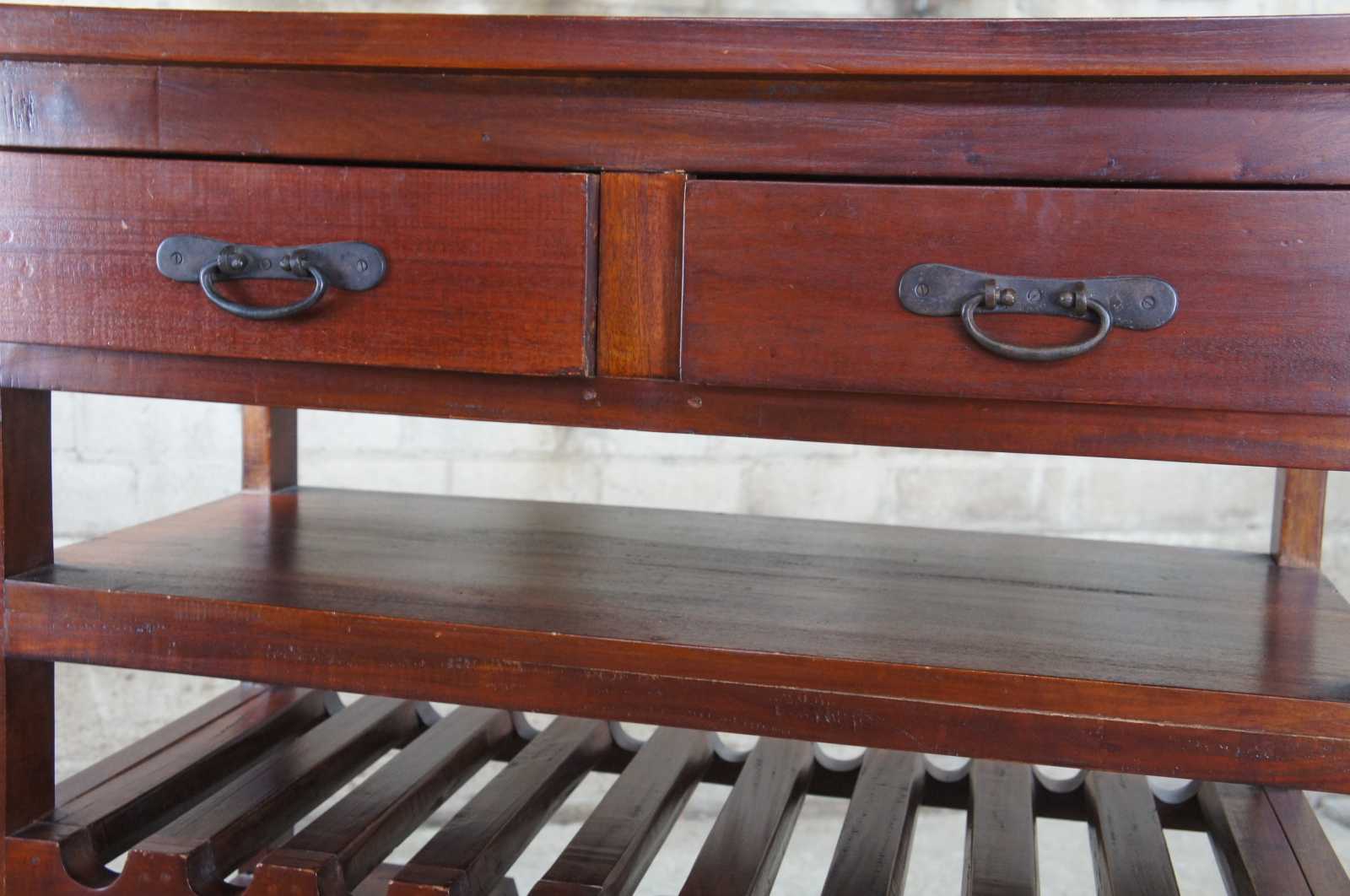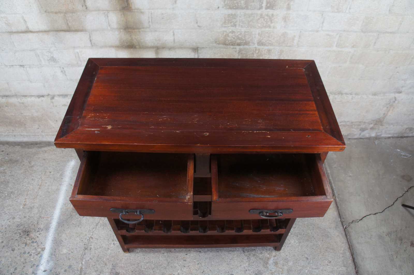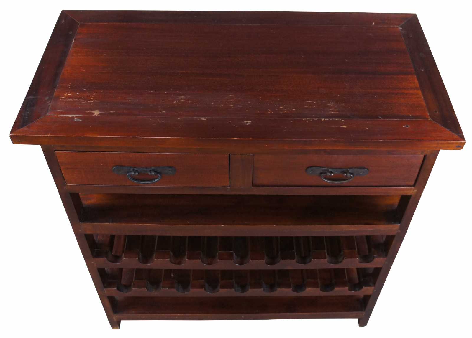 Two sided wine storage table or server. Finished in Mahogany with 2 drawers, storage for 18 bottles and 2 shelves.