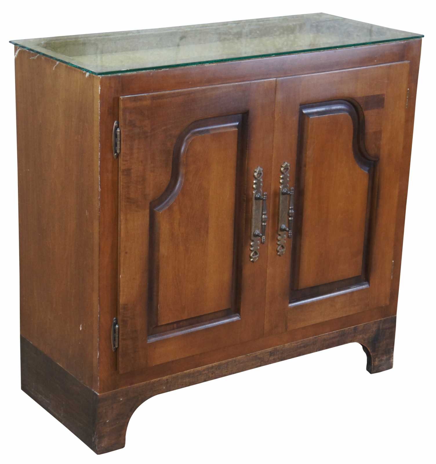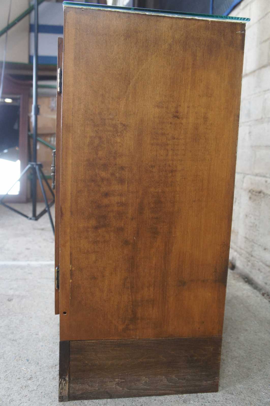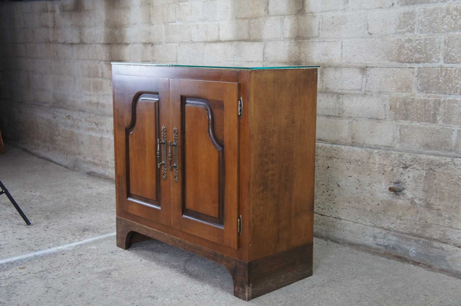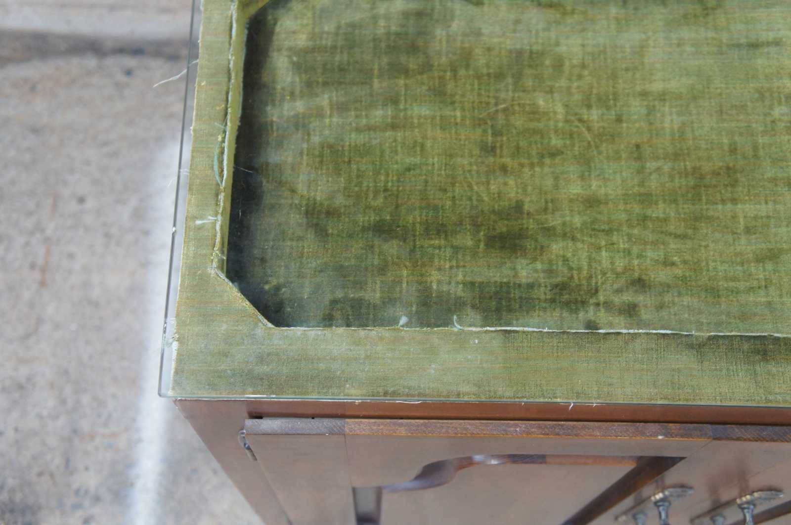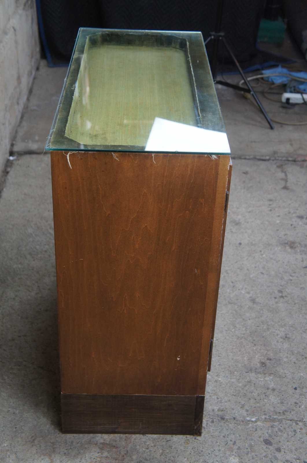 A custom made cherry cabinet with velvet lined showcase. Great for displaying jewelry, knives or other curiosities. Opens to an interior shelf for additional storage.