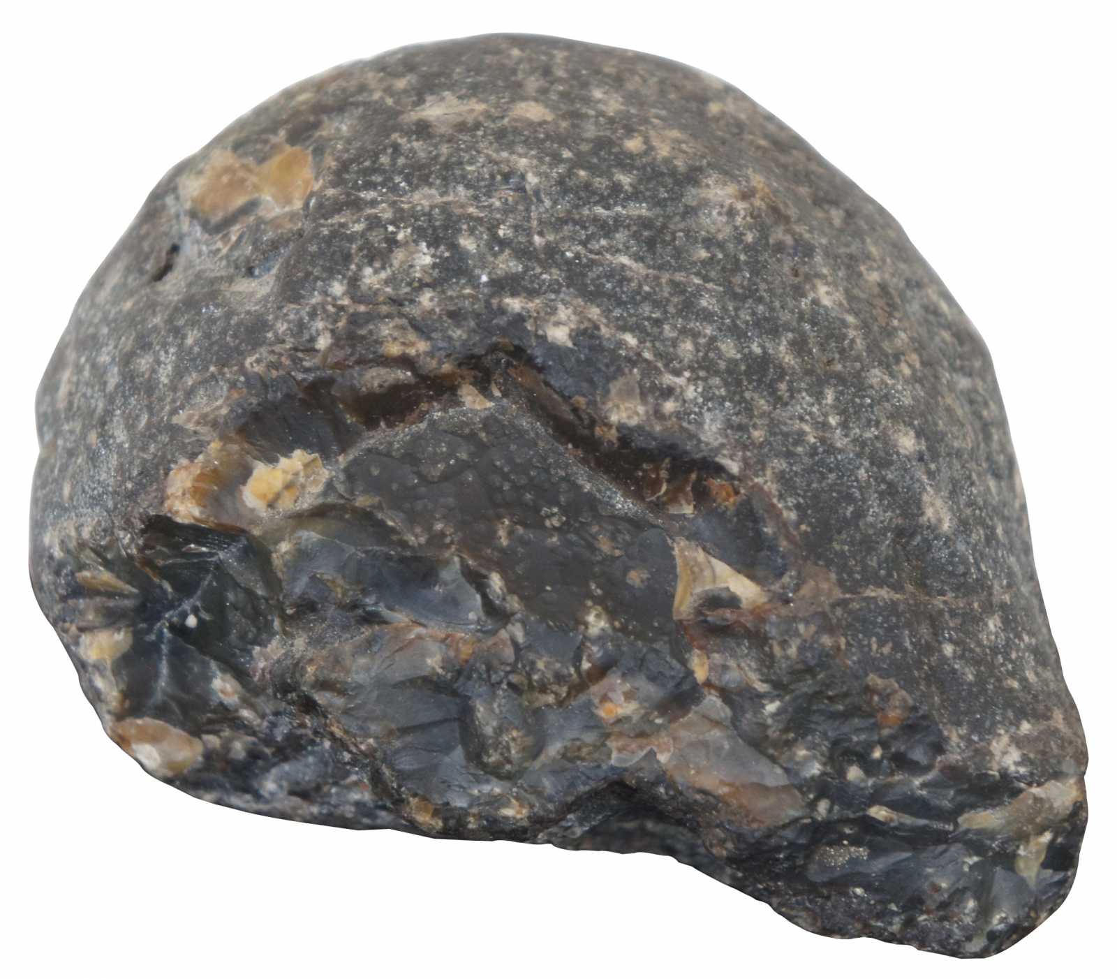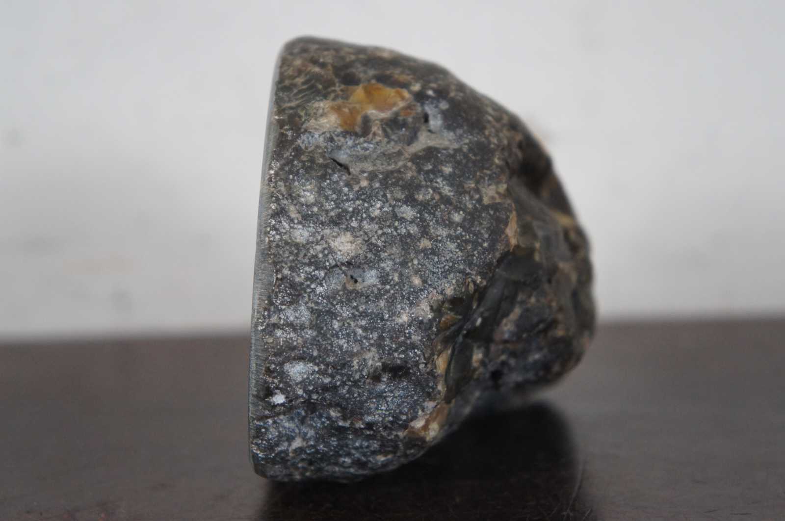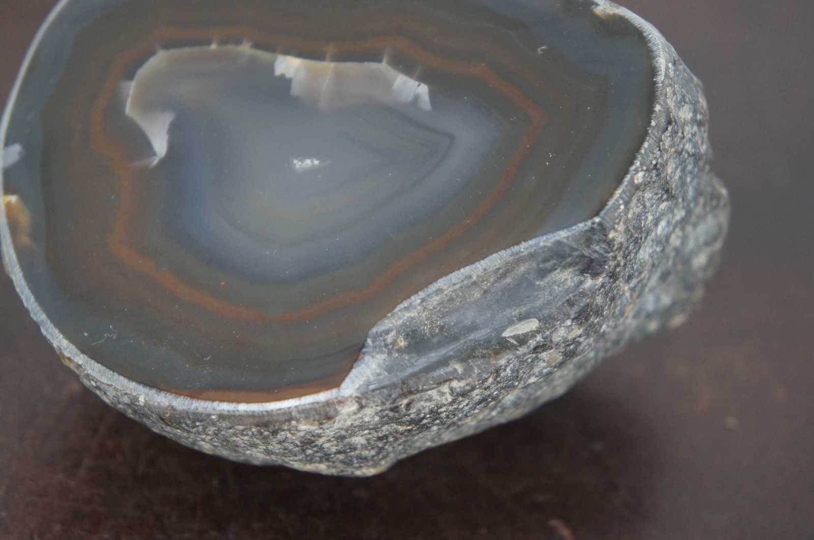 Polished half natural stone geode with alternating layers of shades of blue and rust orange.