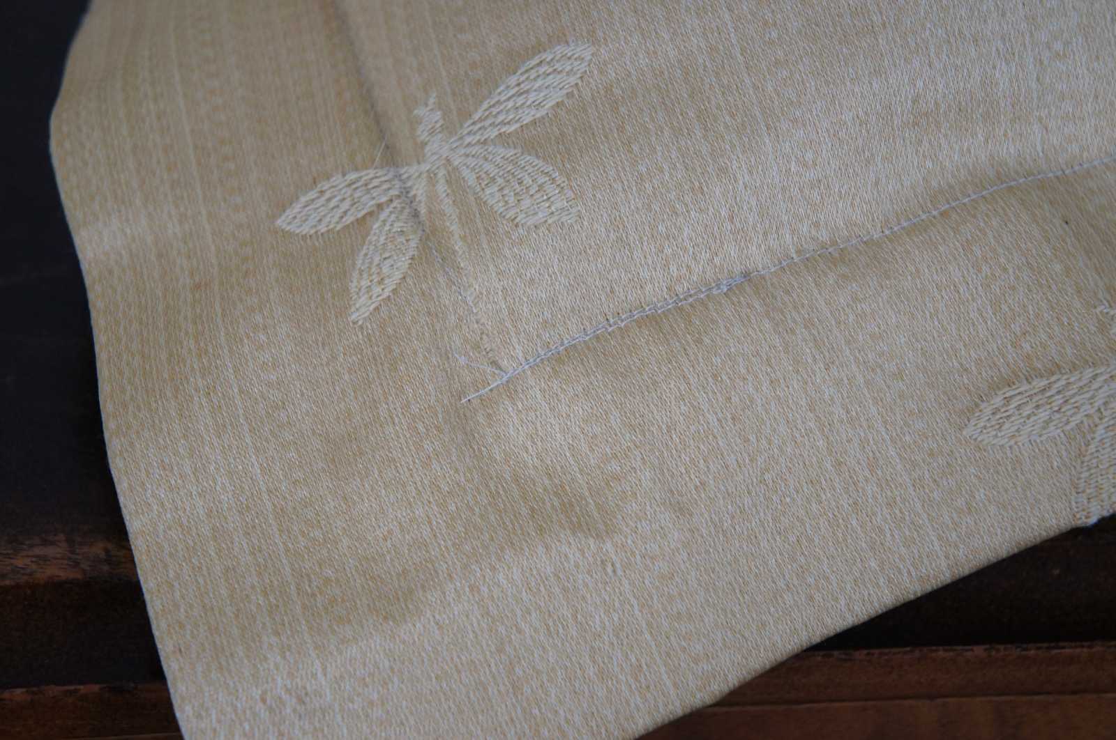 Pair of fiber filled throw pillows in gold silk with embroidered dragonflies.
