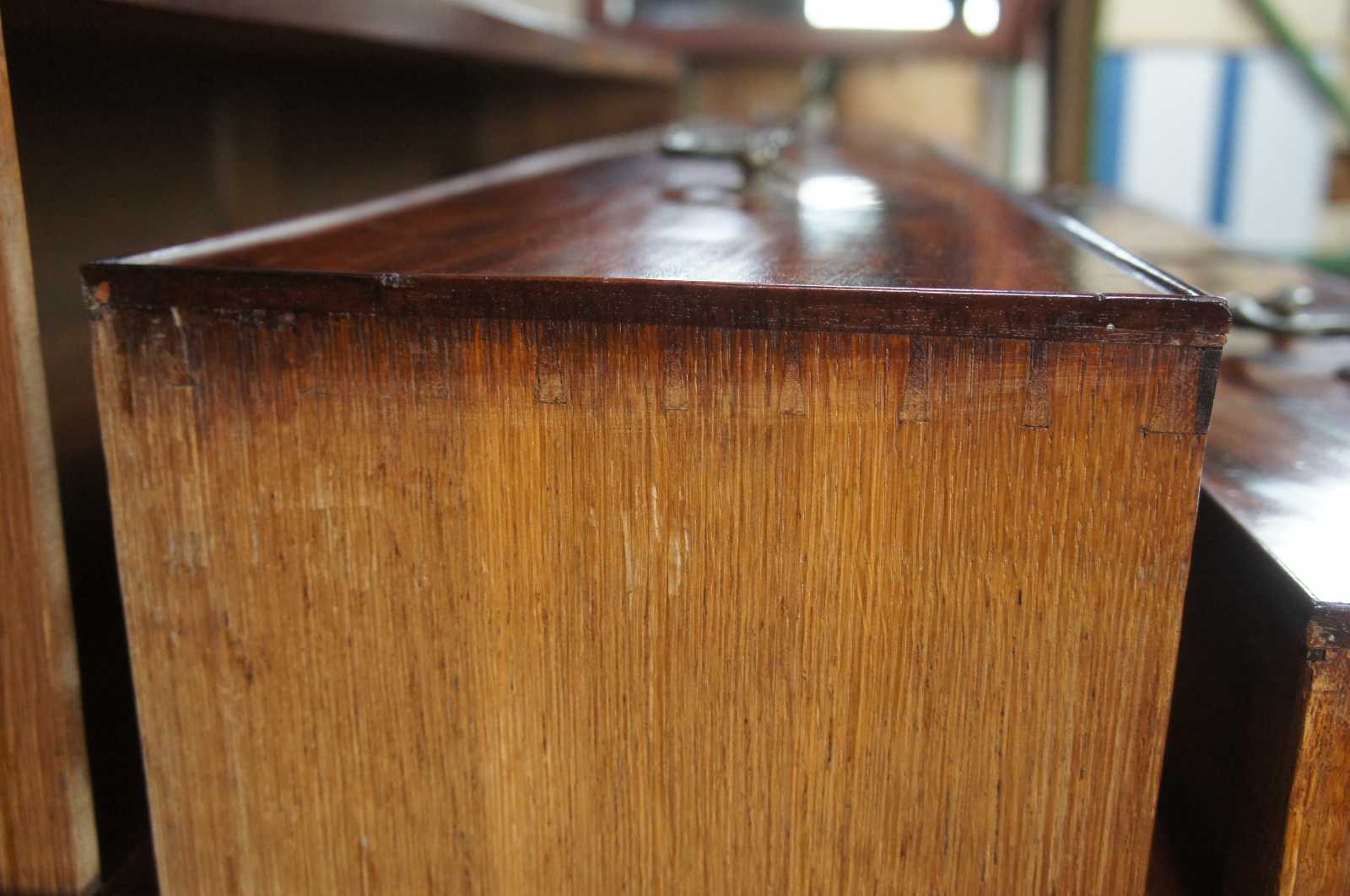18th century George III English mahogany linen press. Rectangular form with two over three hand dovetailed drawers and stepback closet/wardrobe. Features a carved crown with ogee edge, bracket feet and brass bail hardware.