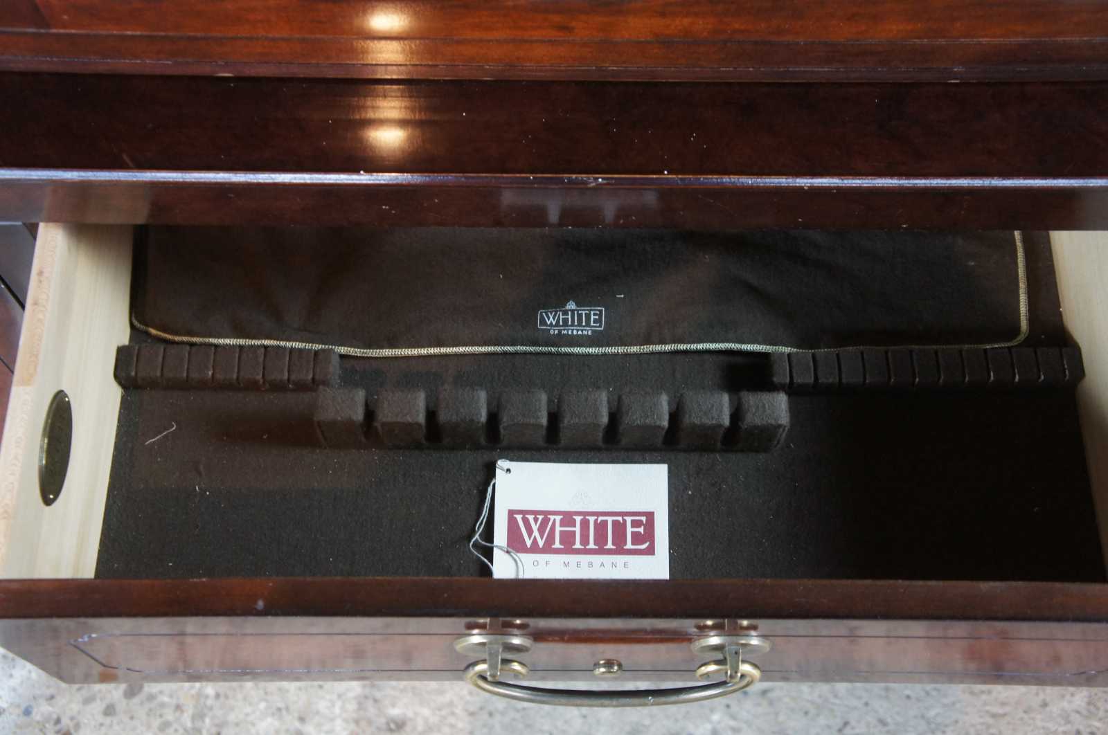 1987 White Furniture Ming Dynasty styled Mandarin China Cabinet, 330-31 Rectangular form with mahogany and burlwood paneling. Features an illumanted stepback top and brass hardware Illumination controlled by touching the of the brass hardware.