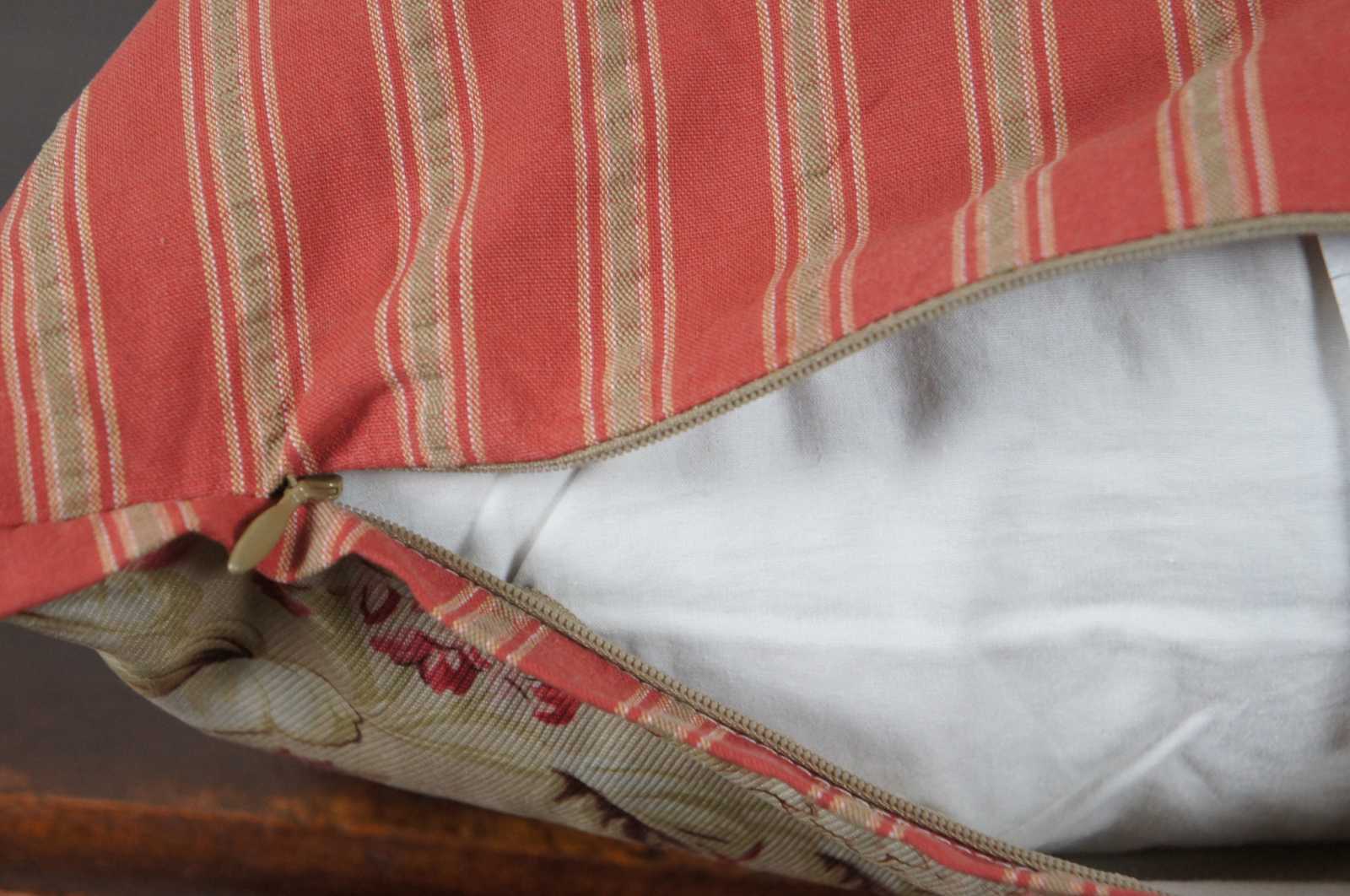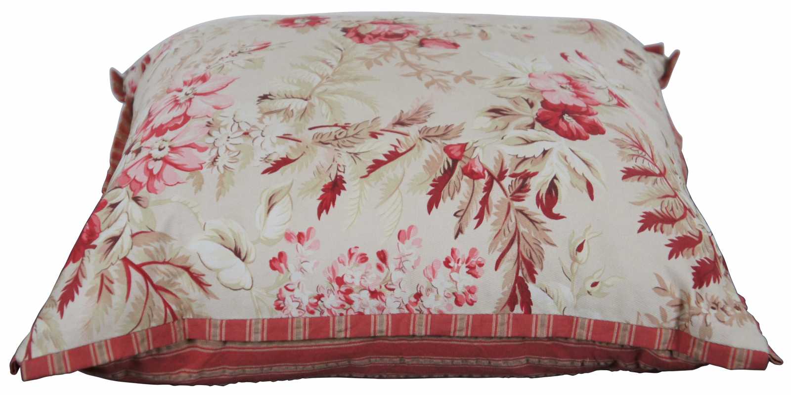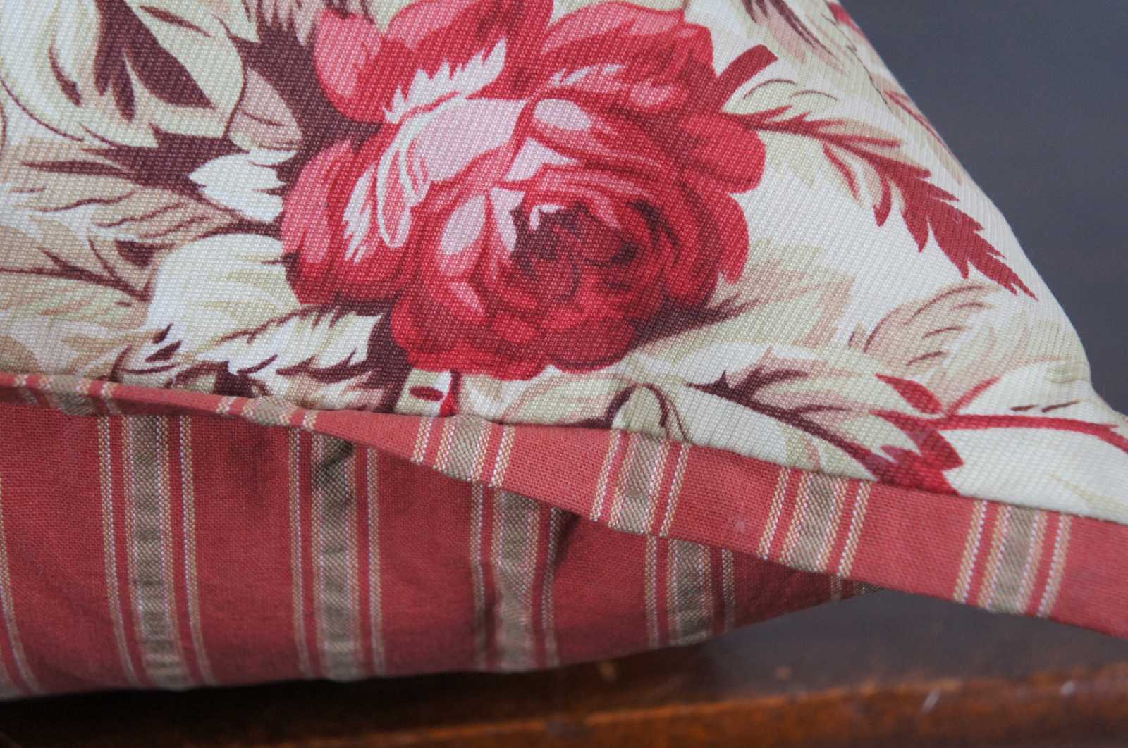 Arhaus Rosalee down filled throw pillow with red and off white floral front and red and beige striped back.