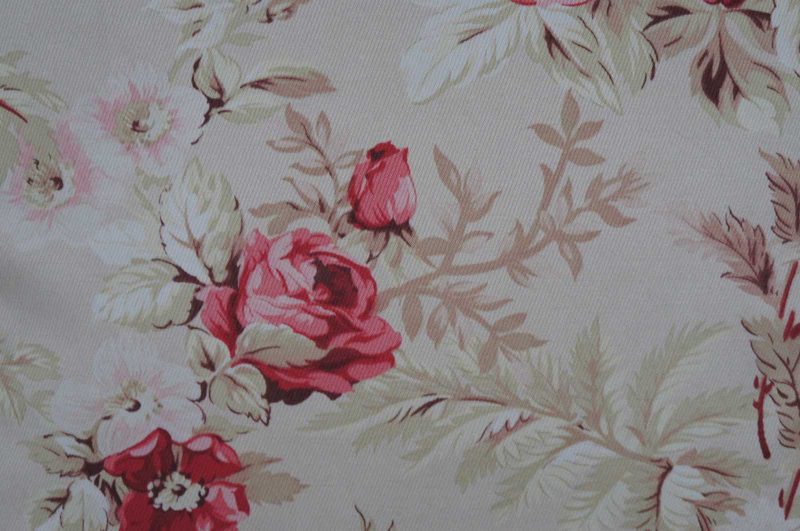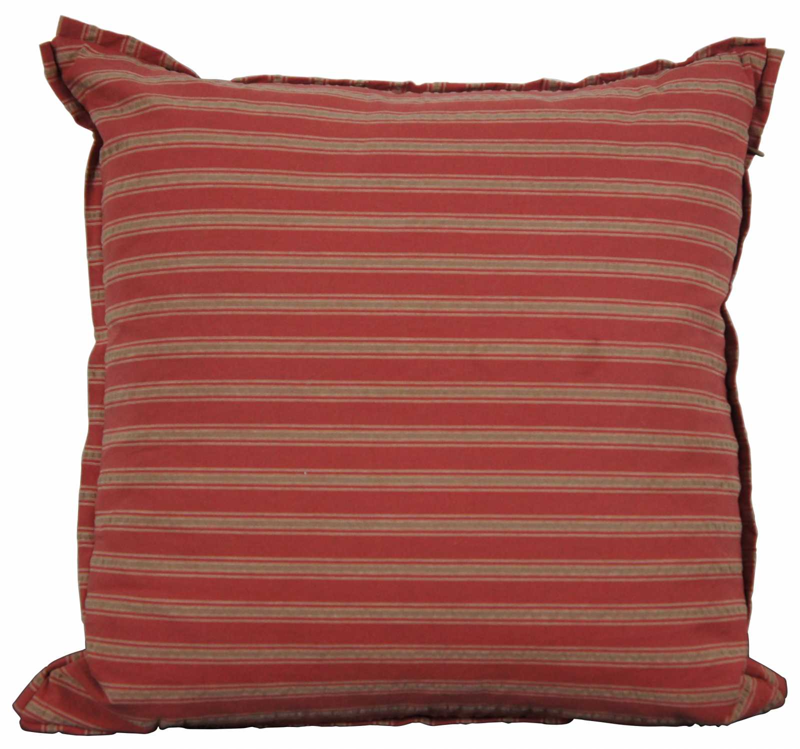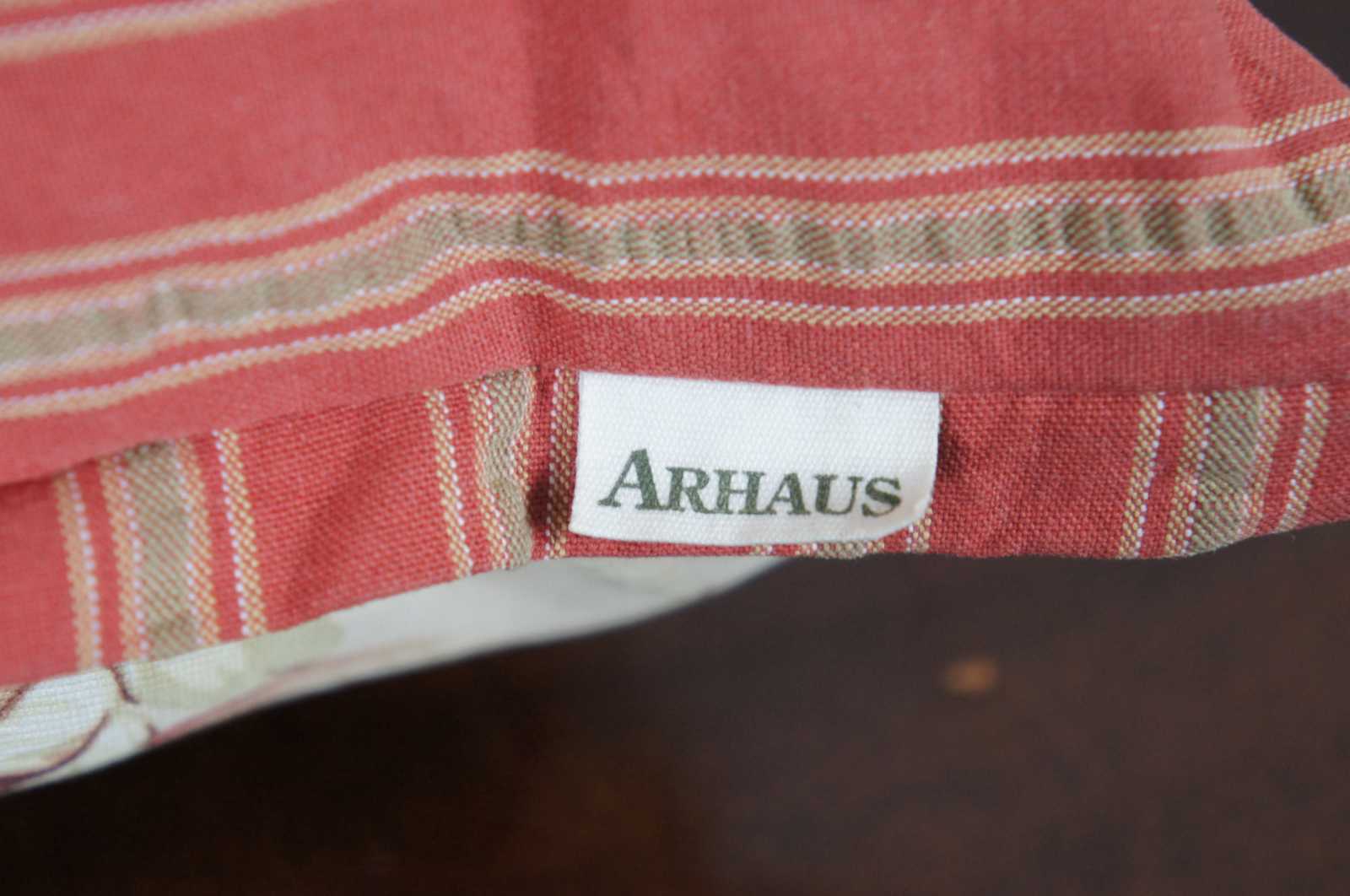 Arhaus Rosalee down filled throw pillow with red and off white floral front and red and beige striped back.