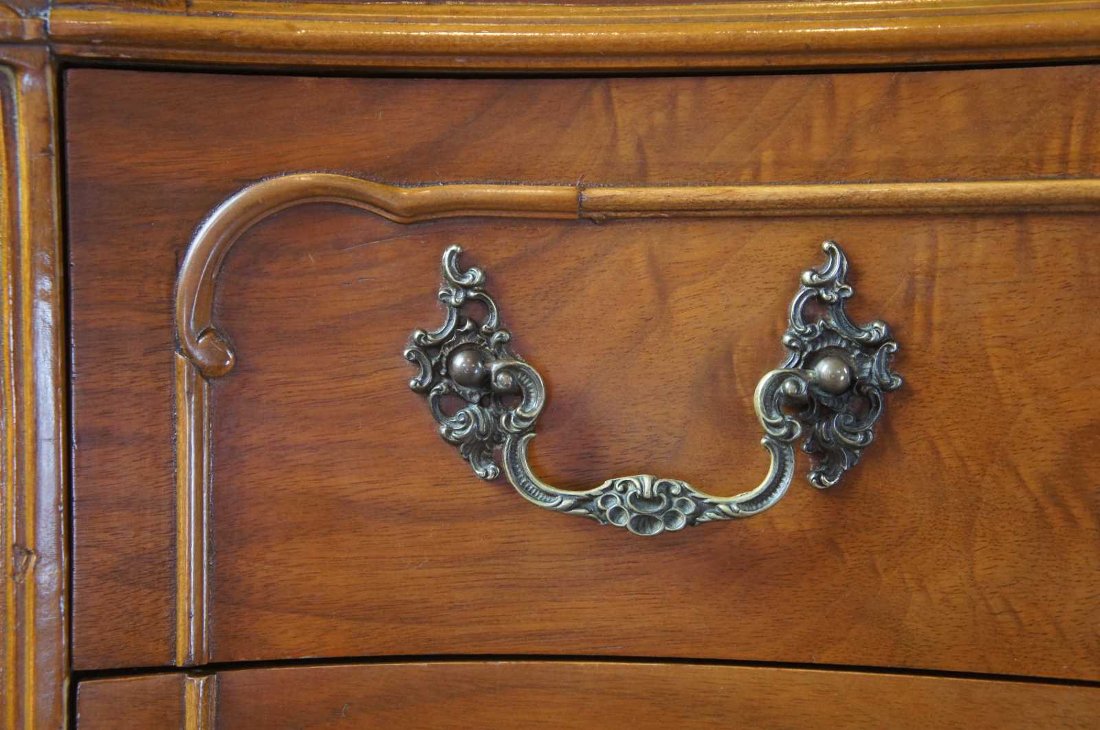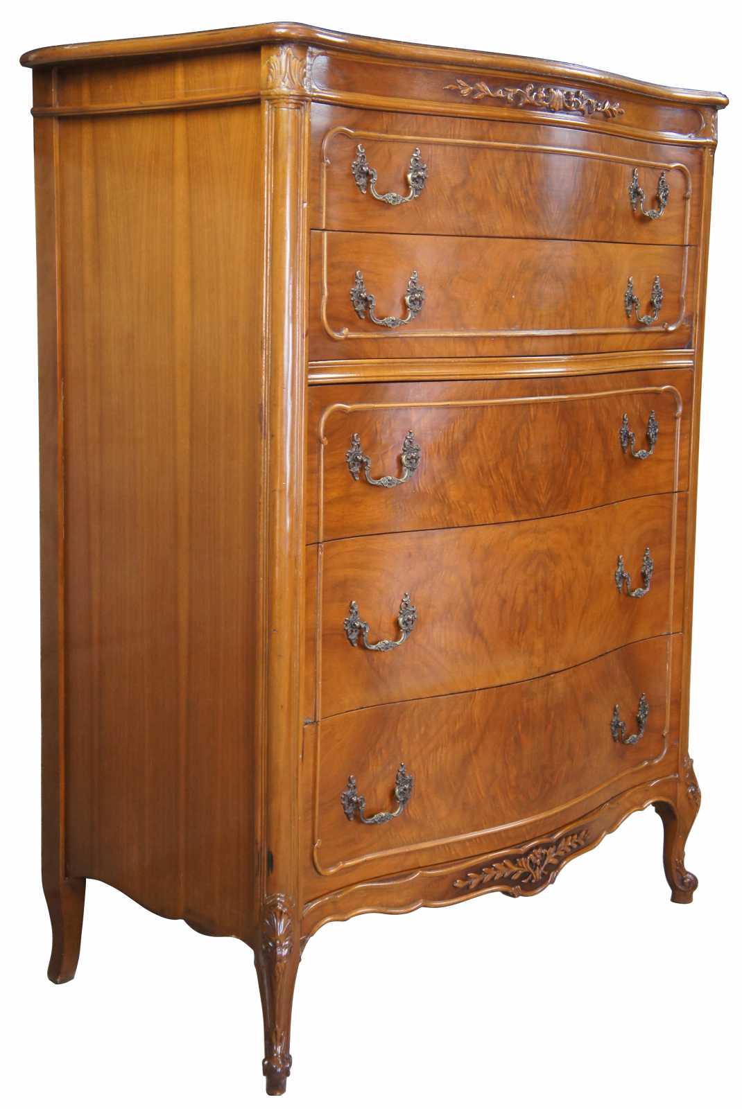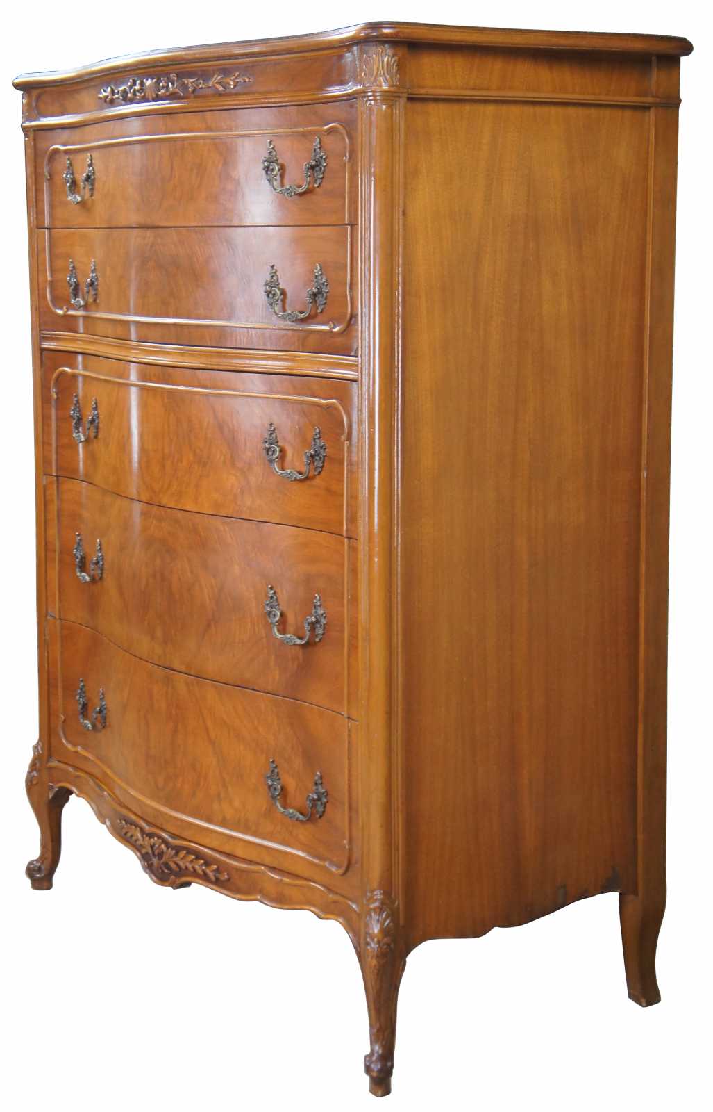 Circa 1940s French tallboy dresser or chest of drawers. Made from walnut with a serpentine front and crotch veneered drawers. Features carved accents, scalloped brass hardware, cabriole legs and glass top(not pictured)
