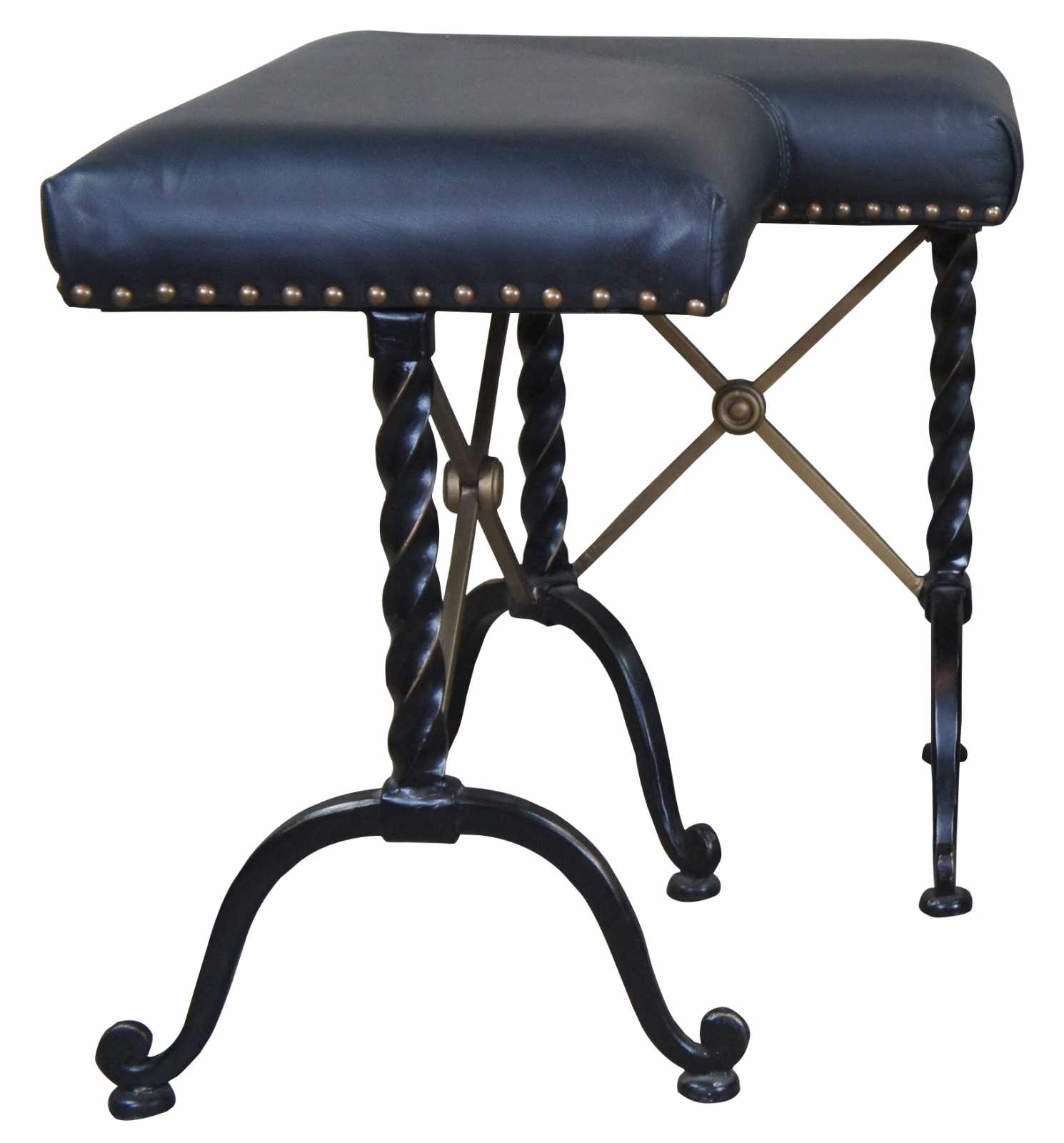 Luxueioua Neoclassical Style fireplace club fender benches. Made of Iron with brass accents, leather seat and nailhead trim.