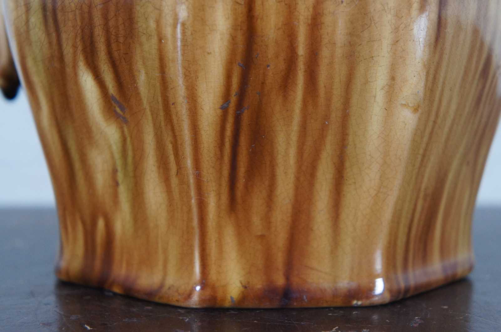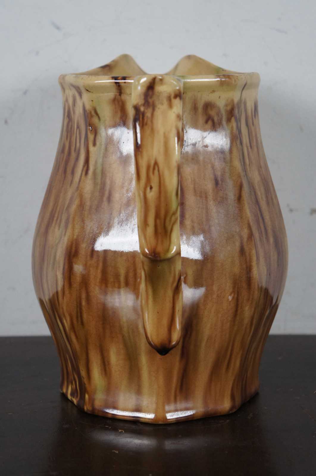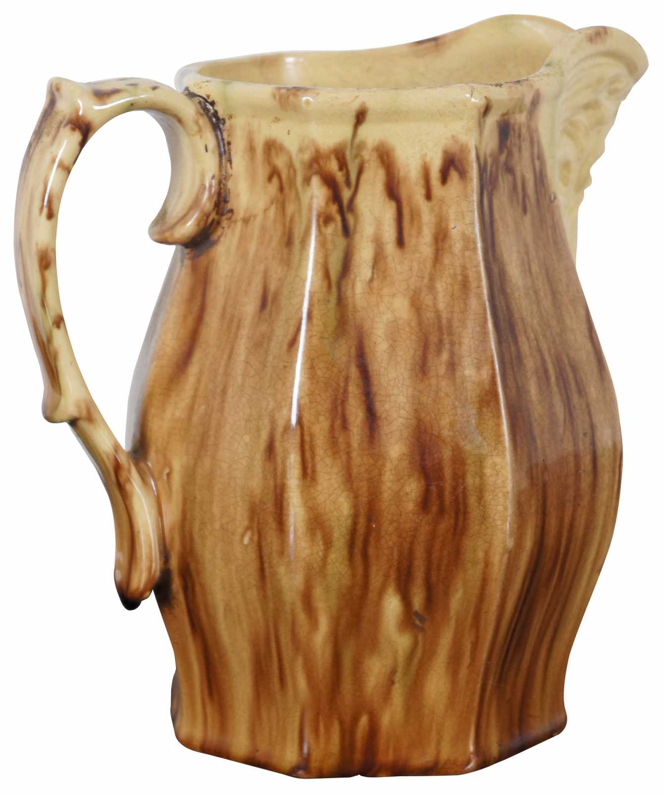 Antique Bennington pitcher with octagonal form featuring a man with a beard resembling the Northwind face under the spout, and Rockingham mottled brown on yellow ground.