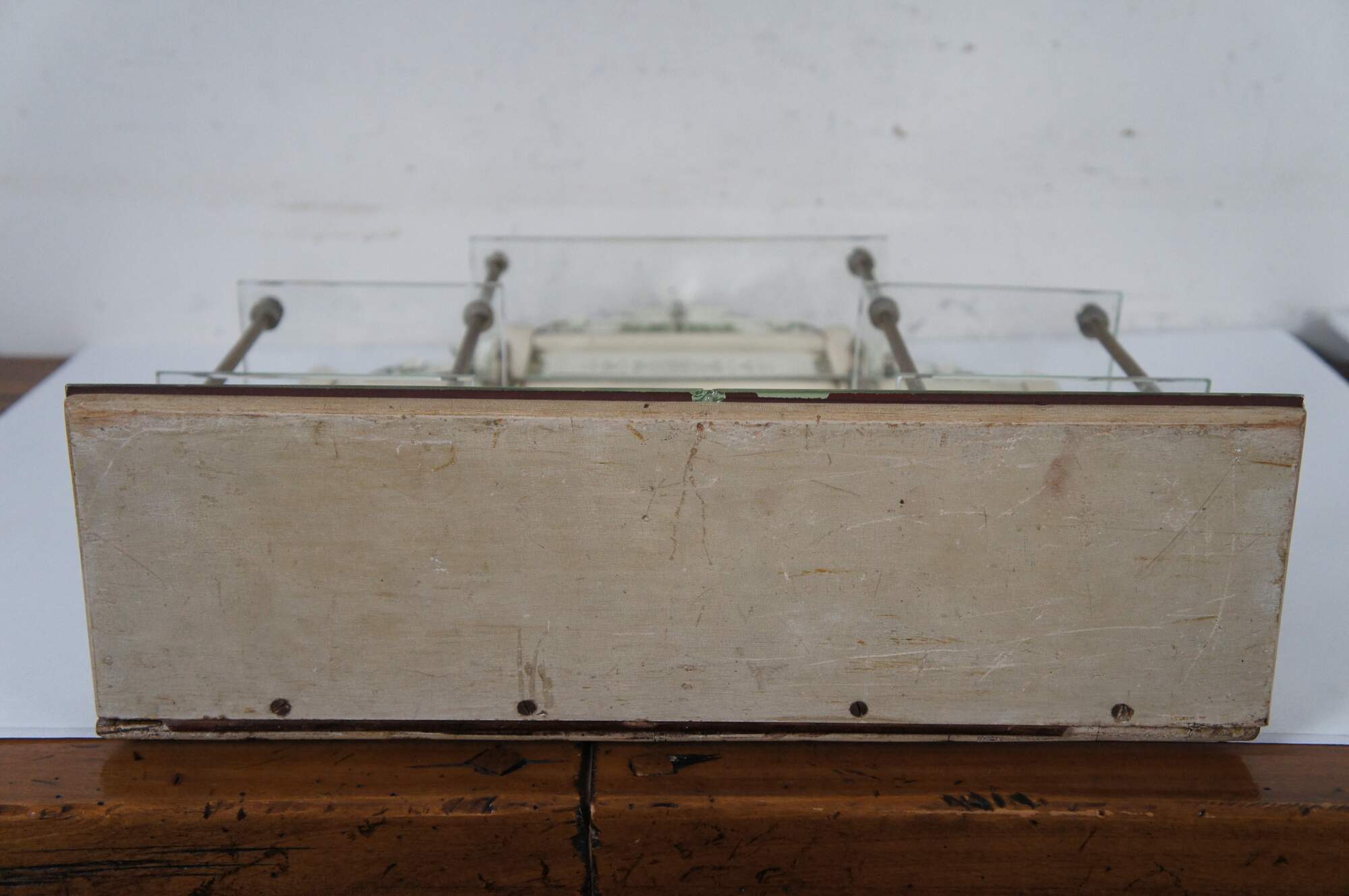 Vintage Venetian mirrored wall hanging curio shelf featuring beveled mirror panels framed in off-white painted wood and topped with a beautifully etched and scalloped mirror crest. Features a mirrored shelf along the base and five smaller clear glass shelves supported with metal rods. Stamped with a triangular mark that reads D.C.C. C.N. TIMIS.