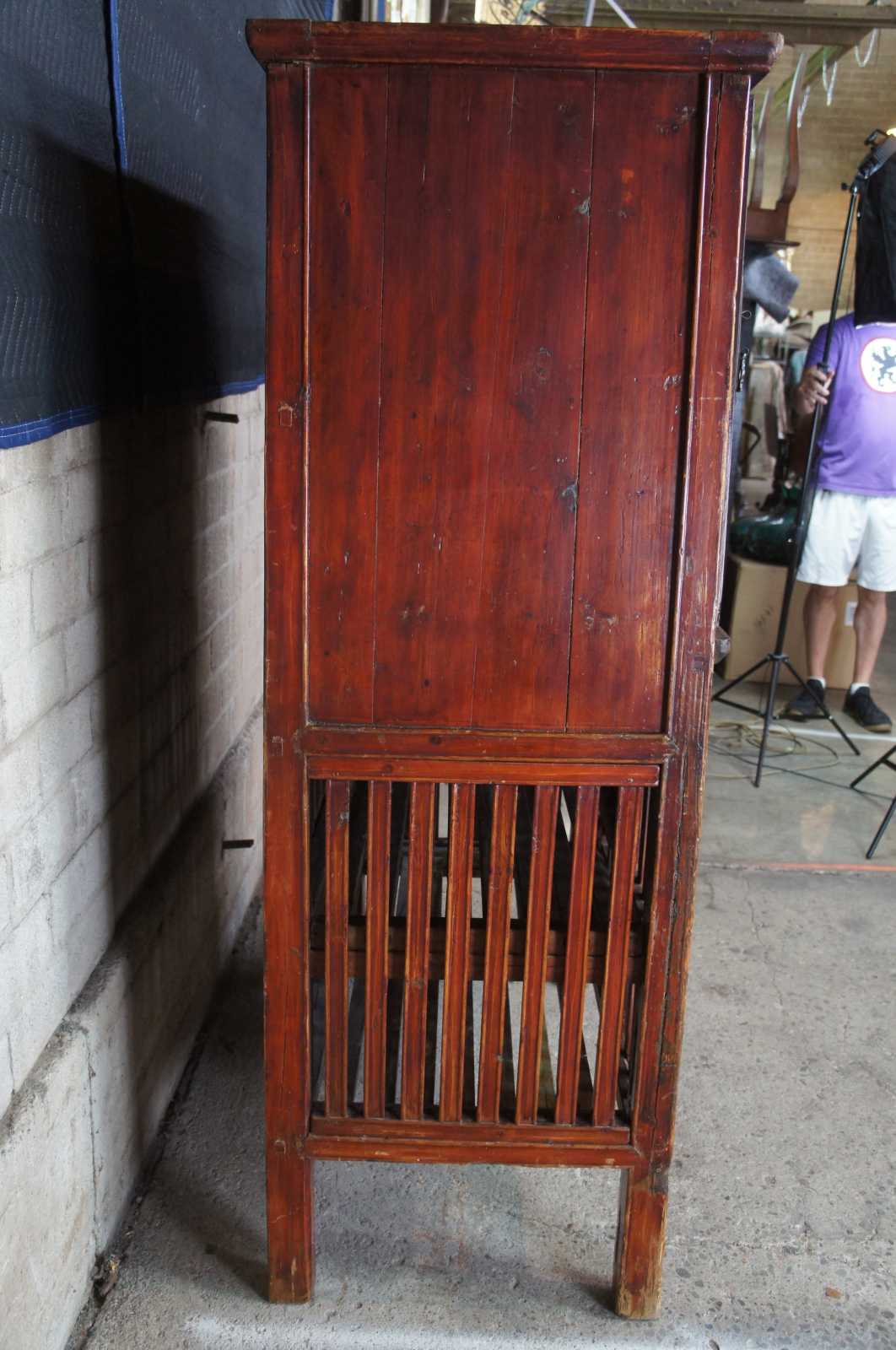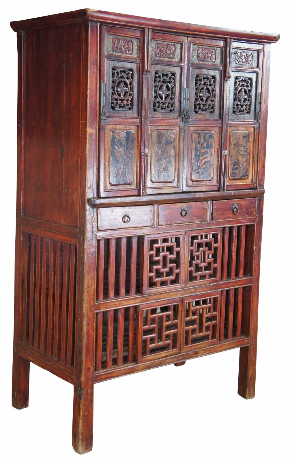 Antique Chinese Kitchen cabinet or cupboard. Made from Elm with intricate fretwork and finish in red, circa late 19th century. Features mortise and tenon joints, 3 drawers, adjustable lower panels and removable top doors.