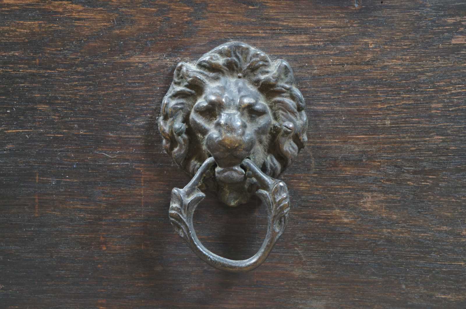 Antique Victorian Gothic style oak coal bin with leather seated top, iron feet and lion’s head handles, with tin lining.