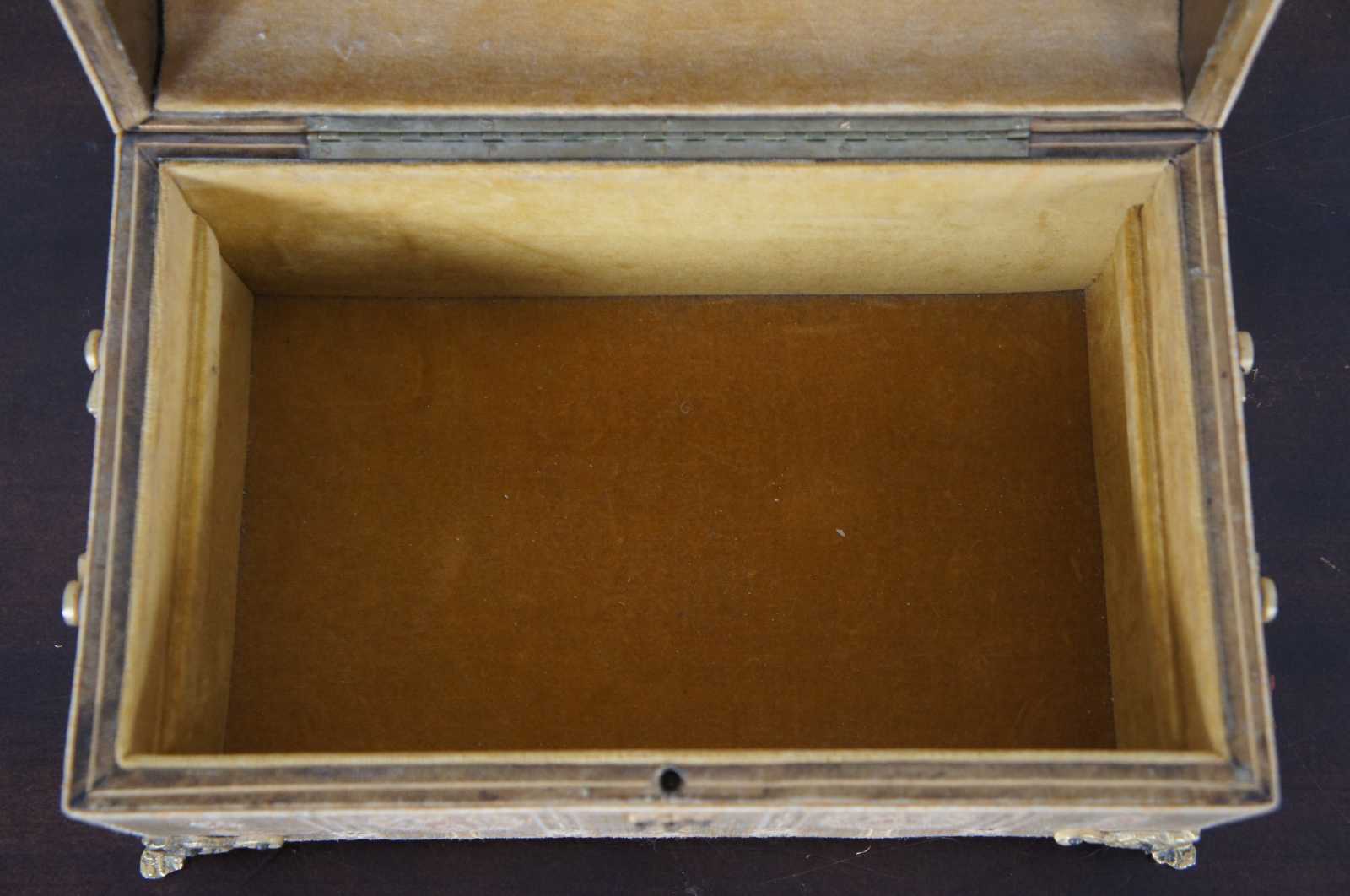 Vintage velvet lined jewelry box in the shape of a treasure chest and covered in a gold silk floral brocade with brass feet.