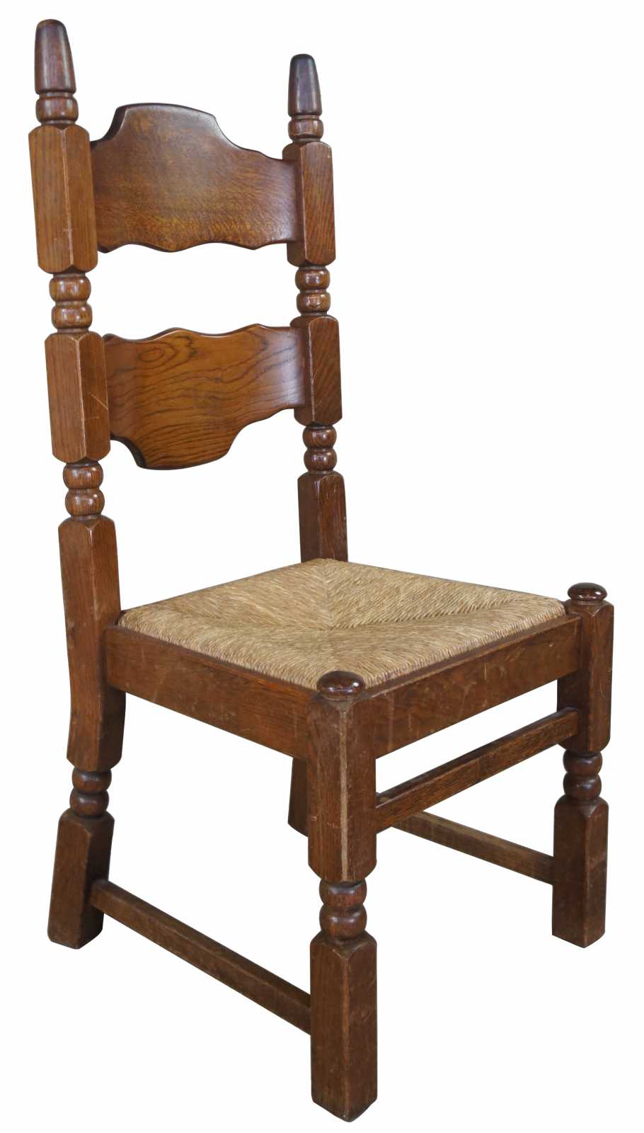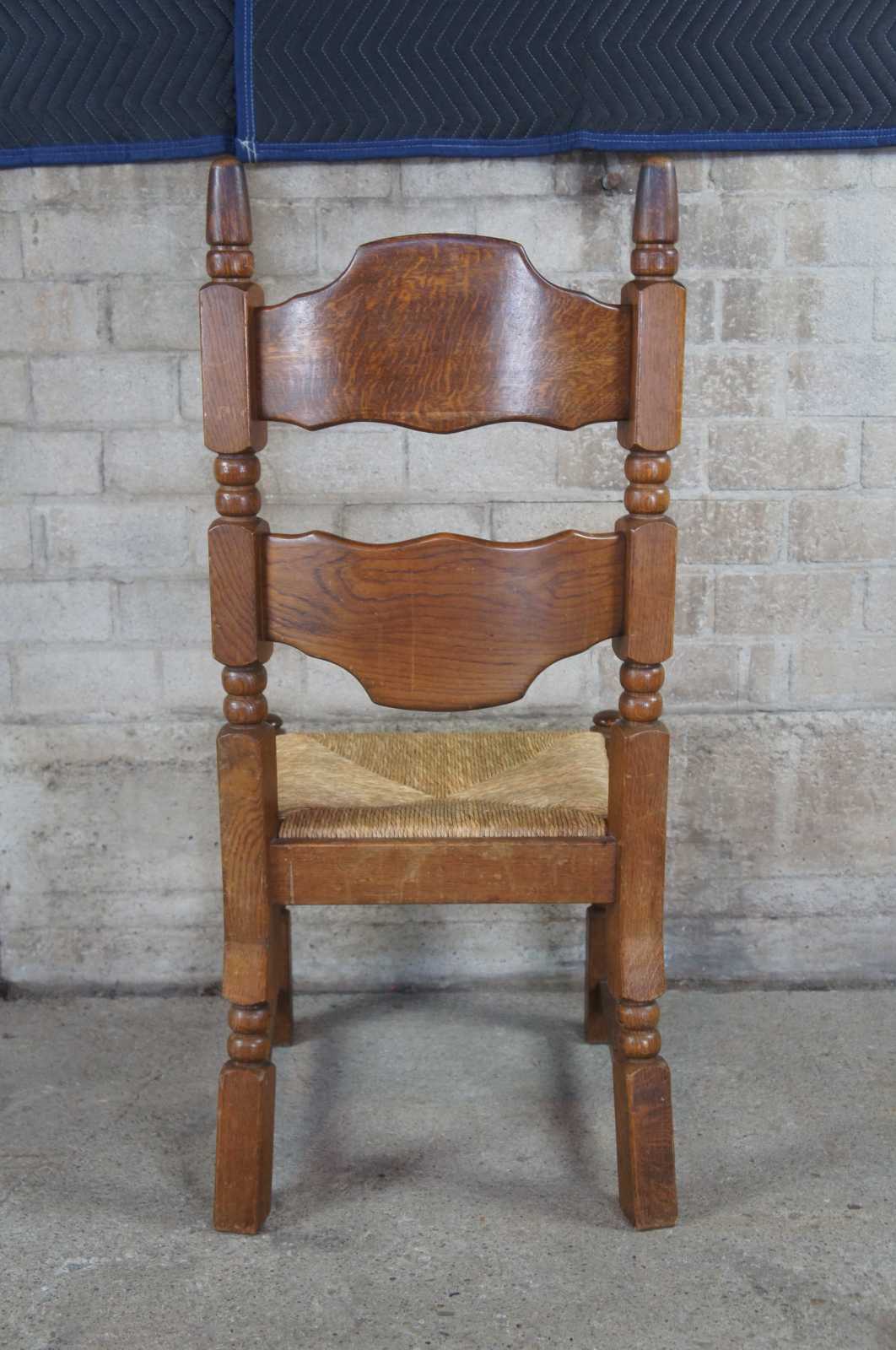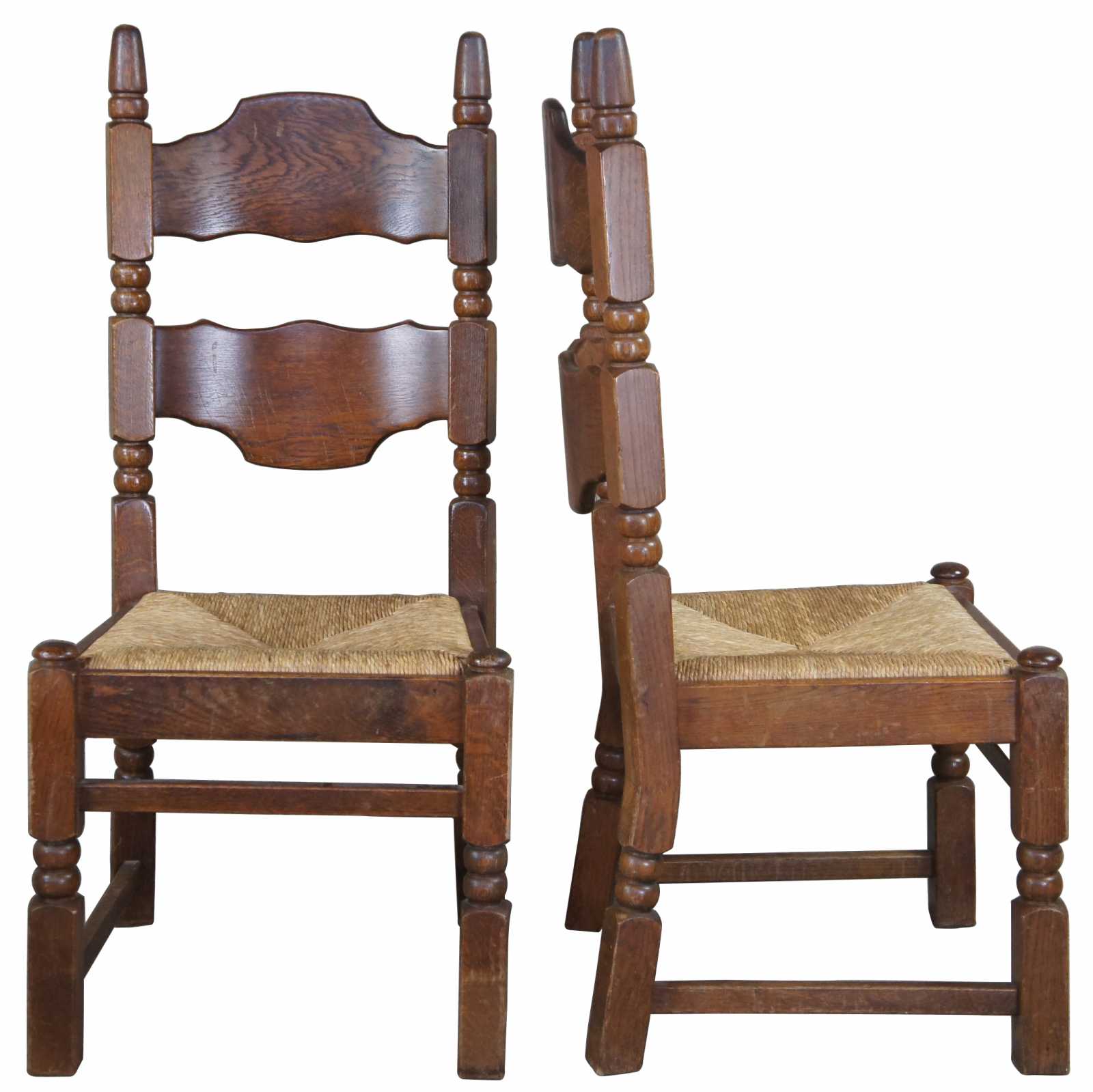 Set of eight old world dining chairs. Made from a heavy oak frame with curved ladder back, gothic style posts and rush seat.