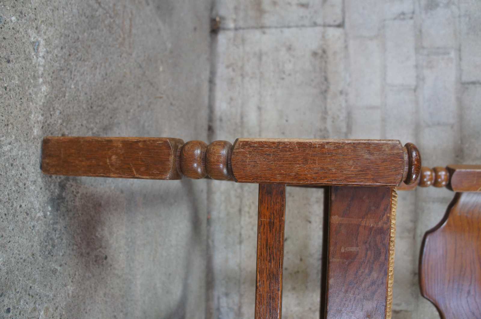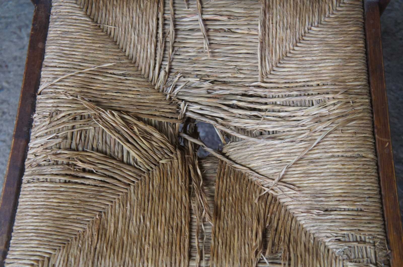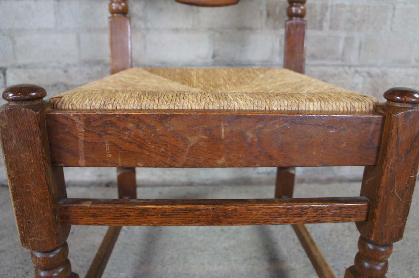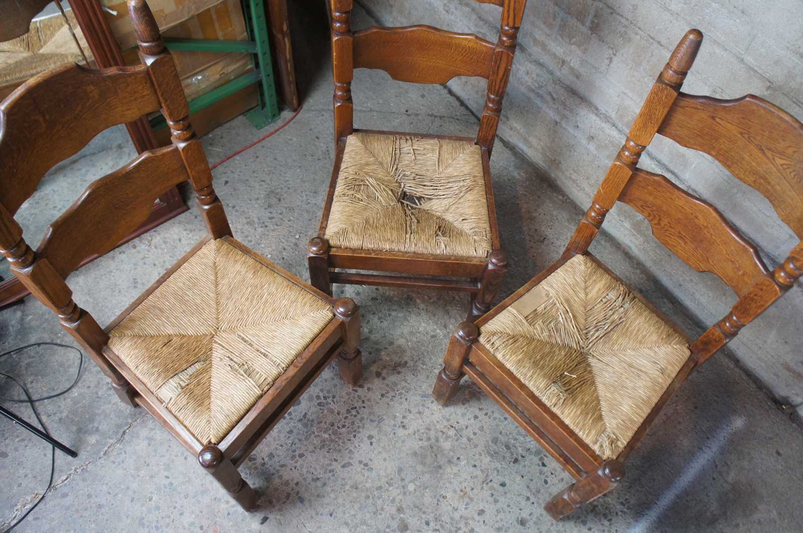 Set of eight old world dining chairs. Made from a heavy oak frame with curved ladder back, gothic style posts and rush seat.