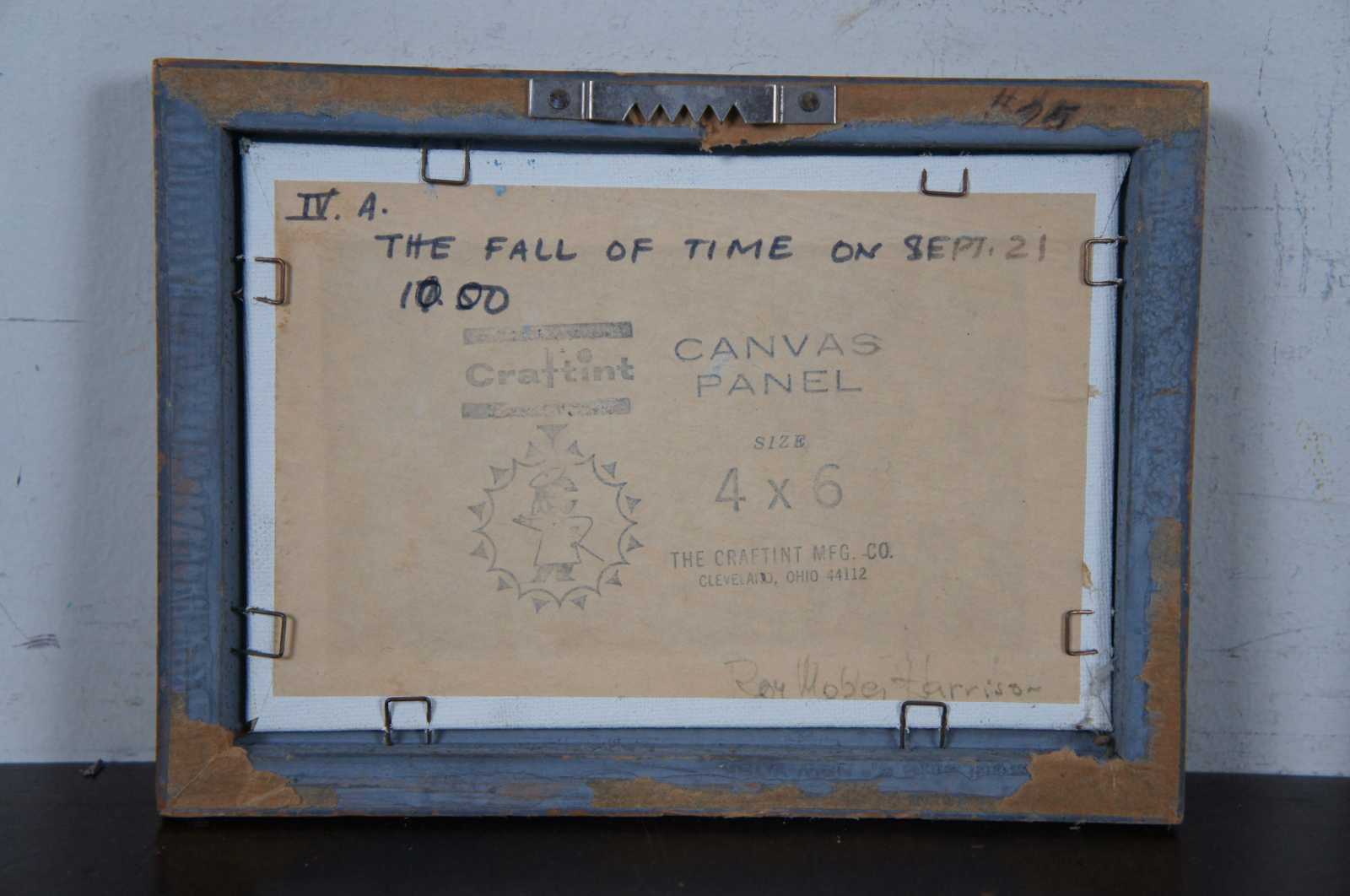 Pair of small oil on canvas board landscape paintings titled “The Winter Time of Dec. 21” and “The Fall of Time on Sept. 21” by Roy Mobley Harrison 1970.