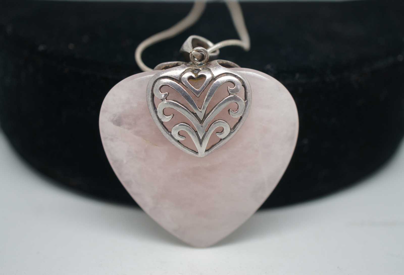 Set of three polished heart shaped gemstone pendants – jade green, rose quartz and banded apricot agate – with .925 sterling silver settings and two sterling chains.