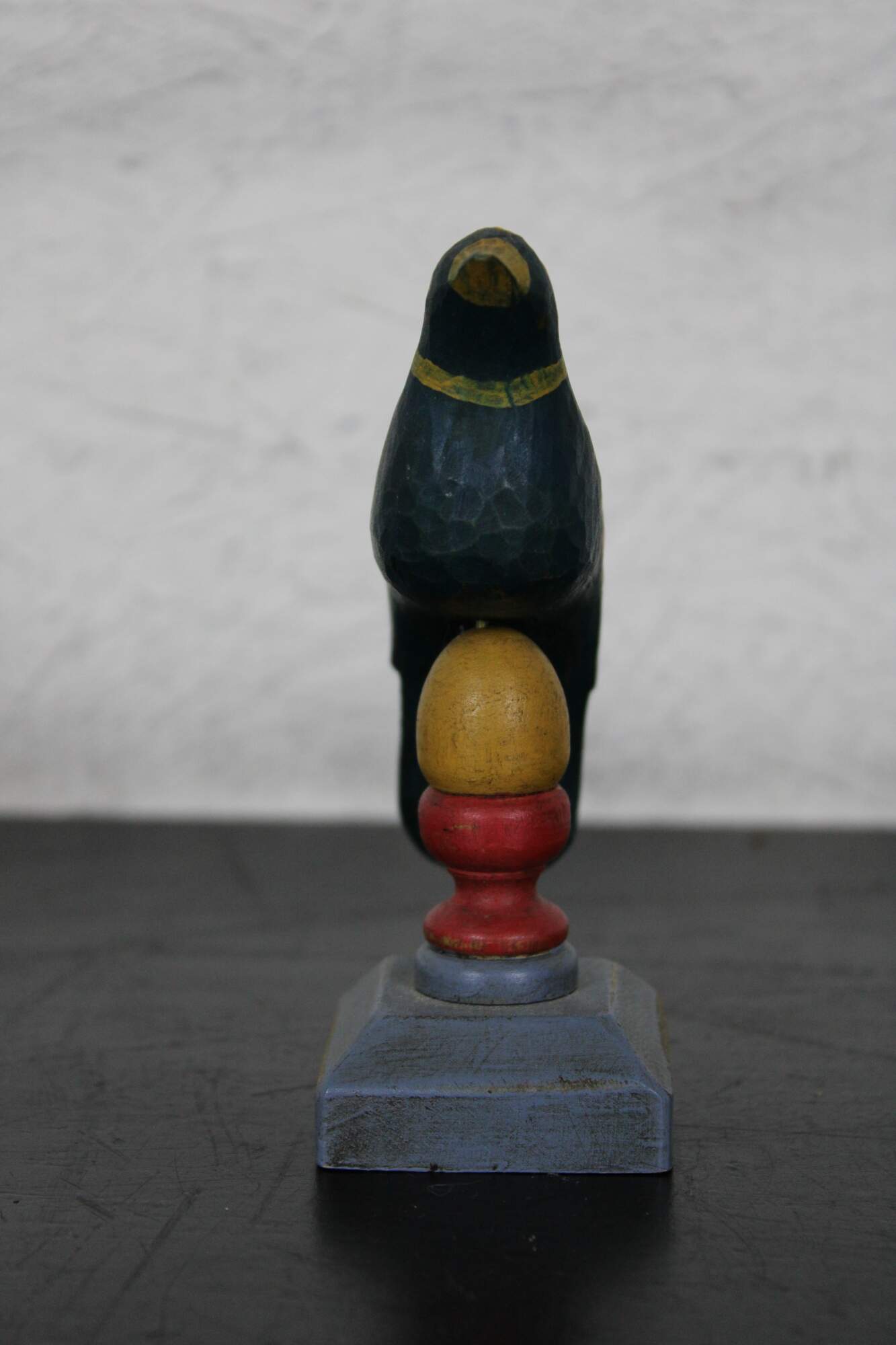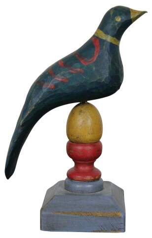 Vintage primitive folk art style wooden bird figurine on an acorn finial base; marked “CVP 1997.”