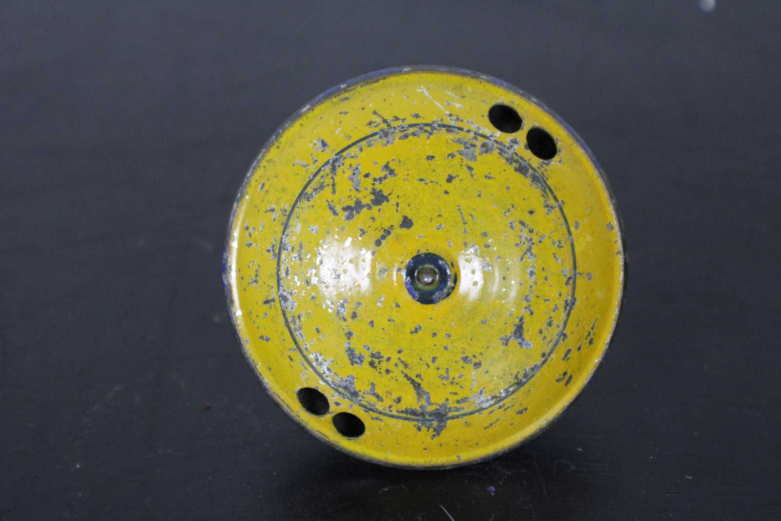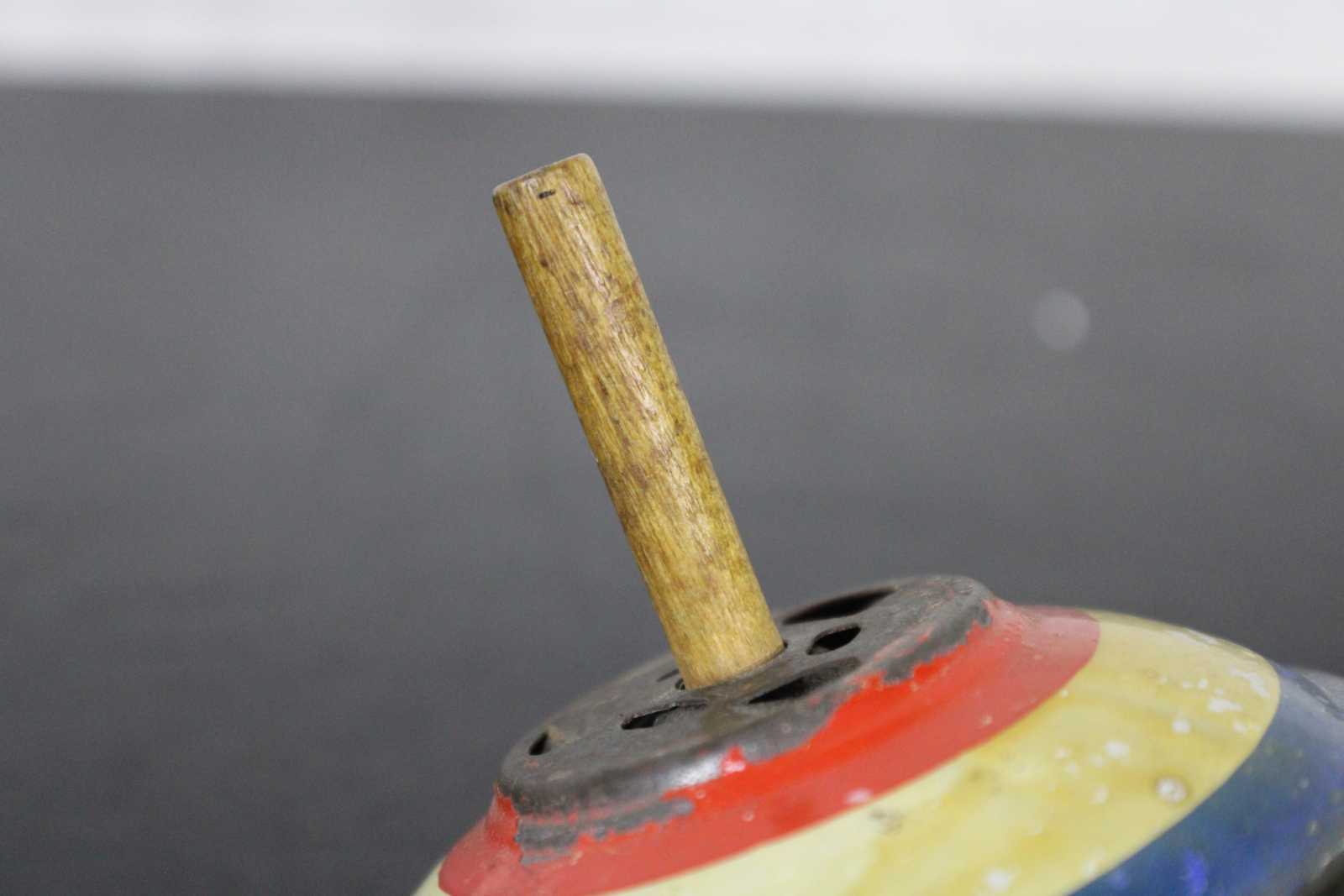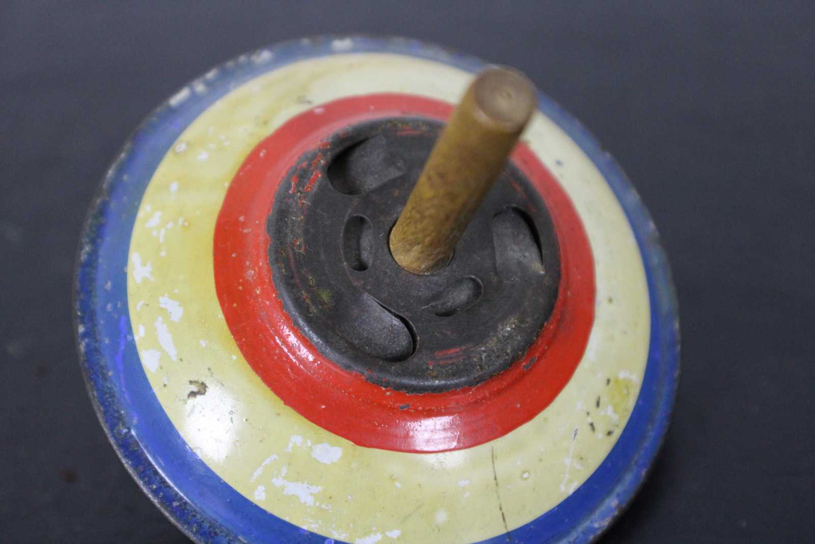 Vintage tin top painted with red, white, and blue stripes on top and yellow on the base, with wooden dowel handle.