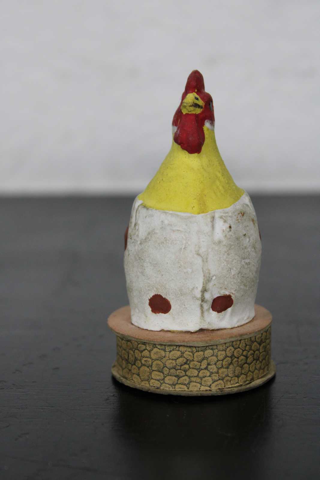 Antique German paper mache candy container with a round base decorated like a stone wall, topped with a seated chicken with a brown and white body, yellow head, and red wattle and comb.