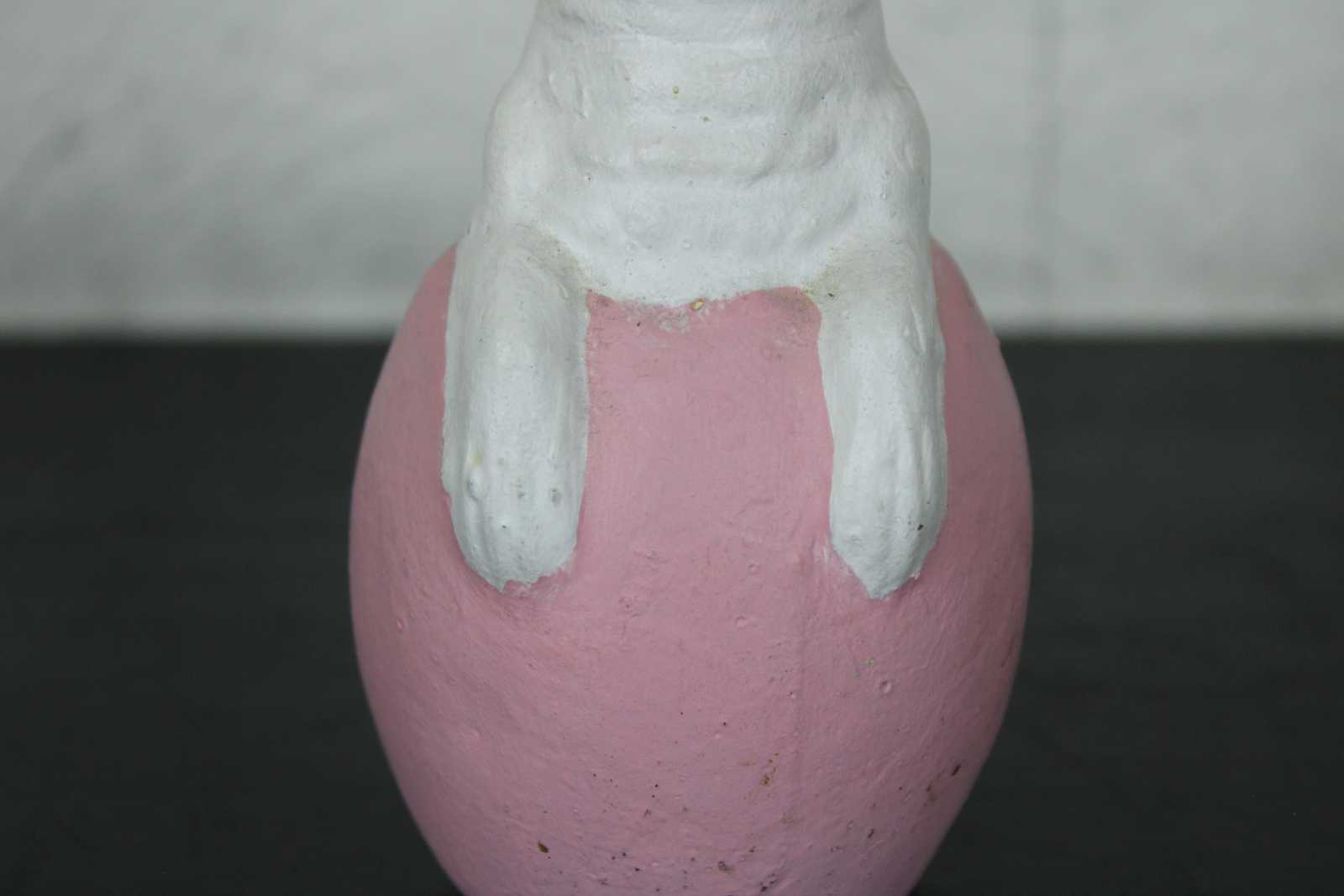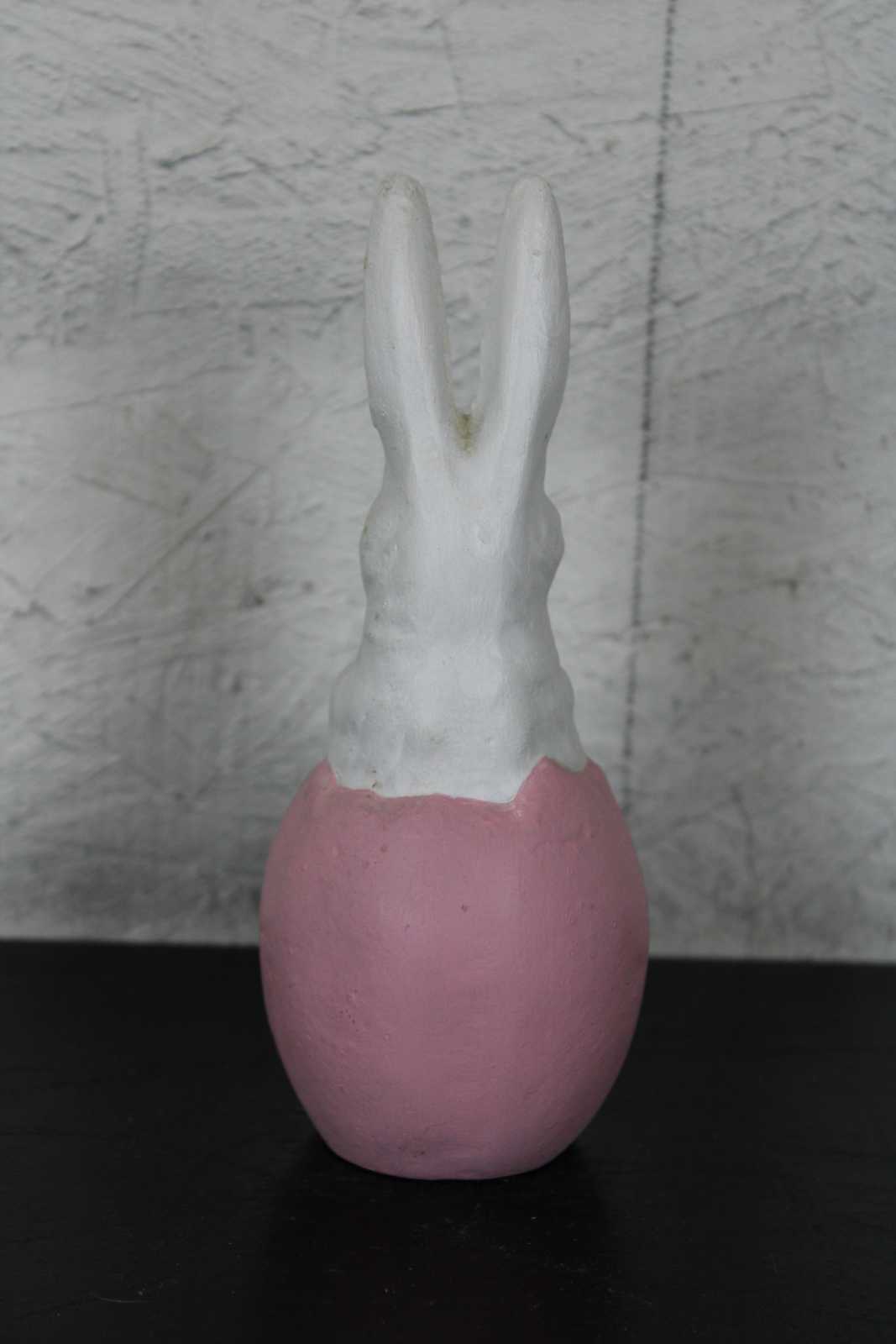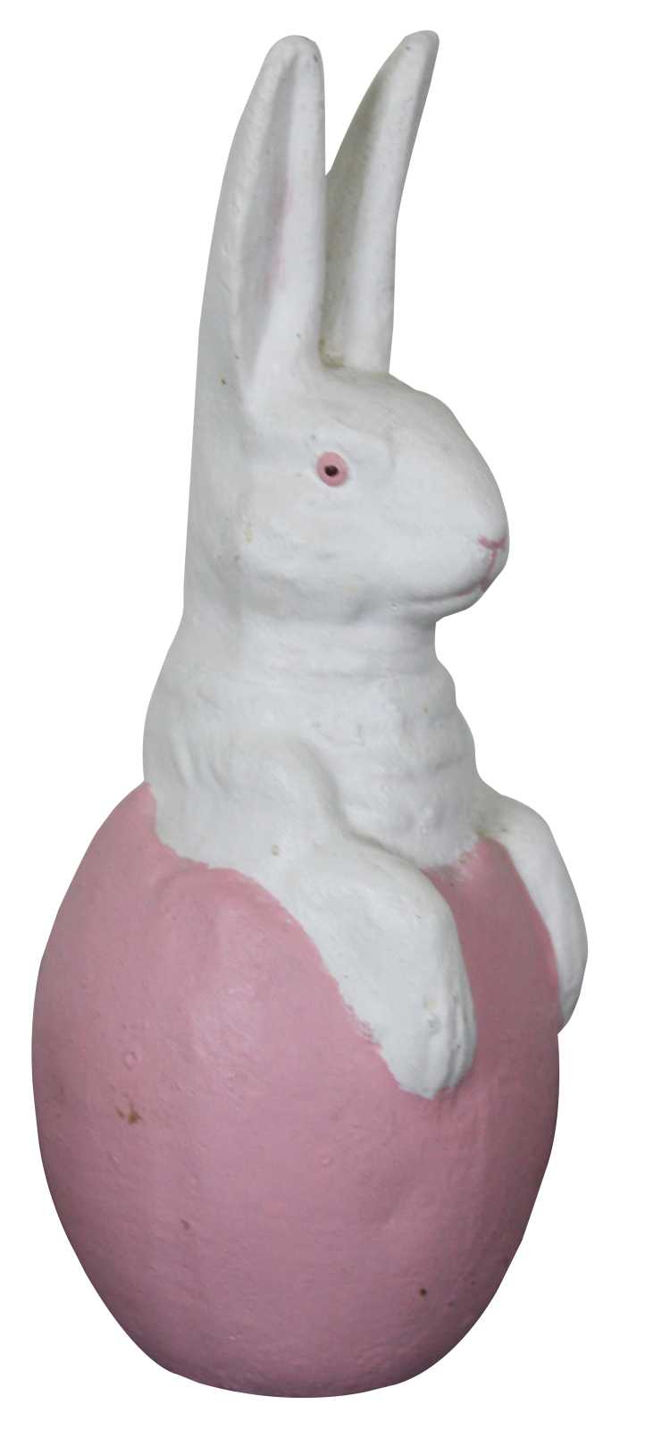 Antique ceramic or composition figurine in the shape of a white rabbit sitting in a pink Easter egg. In the style of German paper mache candy containers.