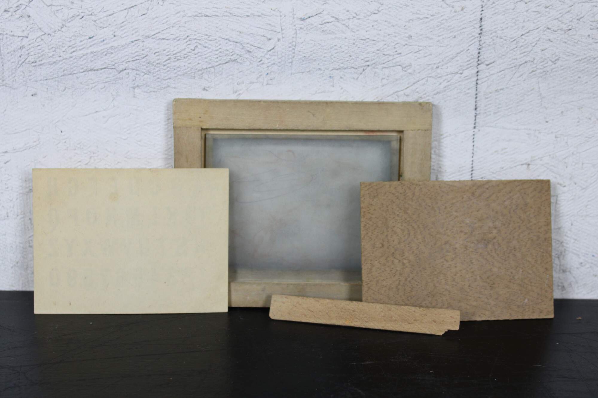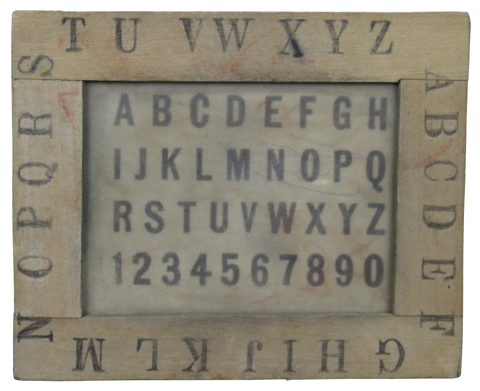 Antique primitive wooden frame with the alphabet stamped along the edges, plus four educational paper alphabet and coloring sheets.