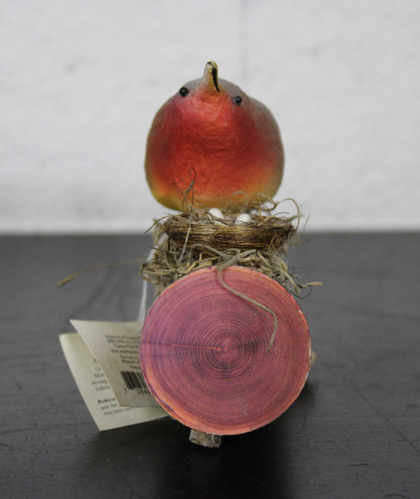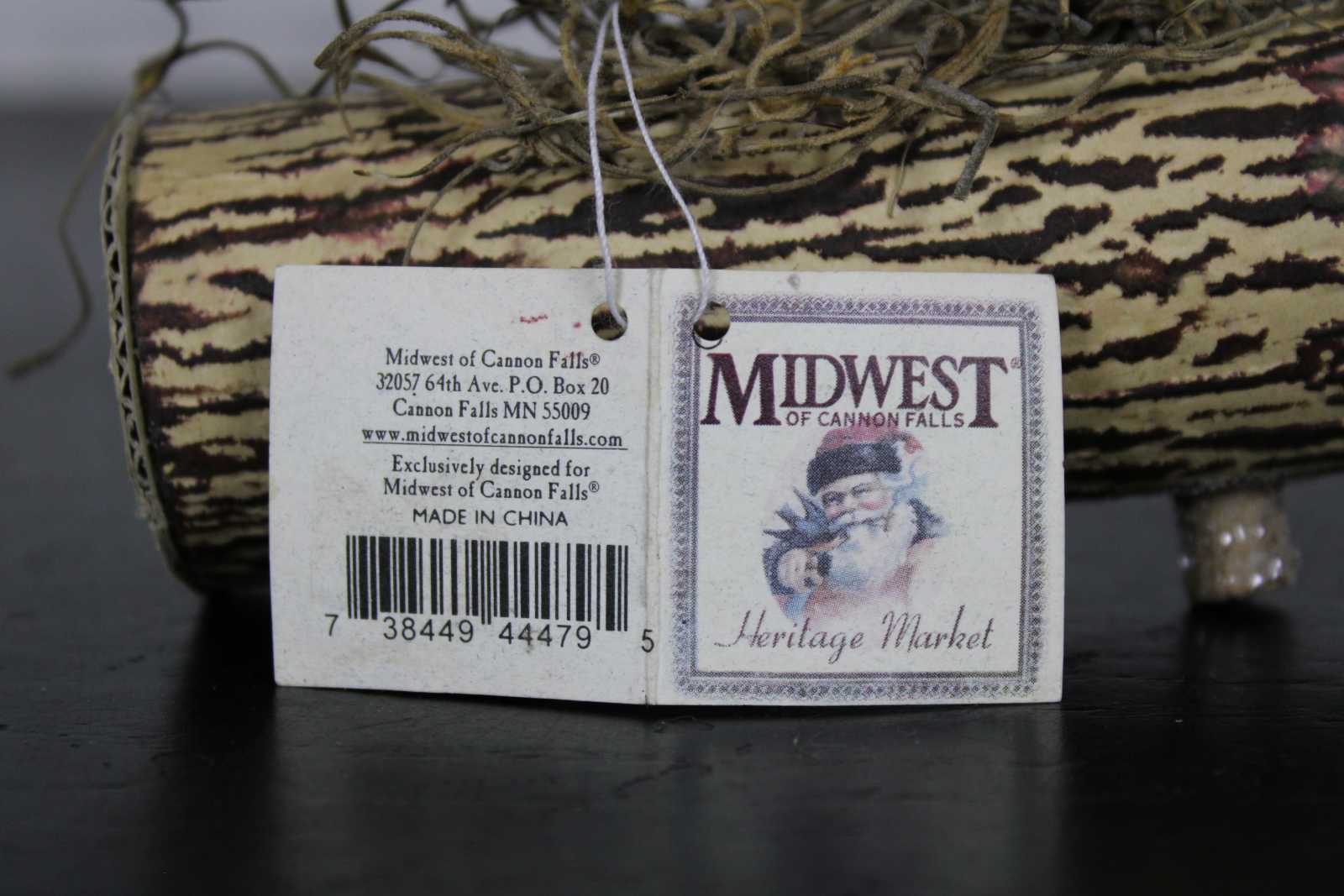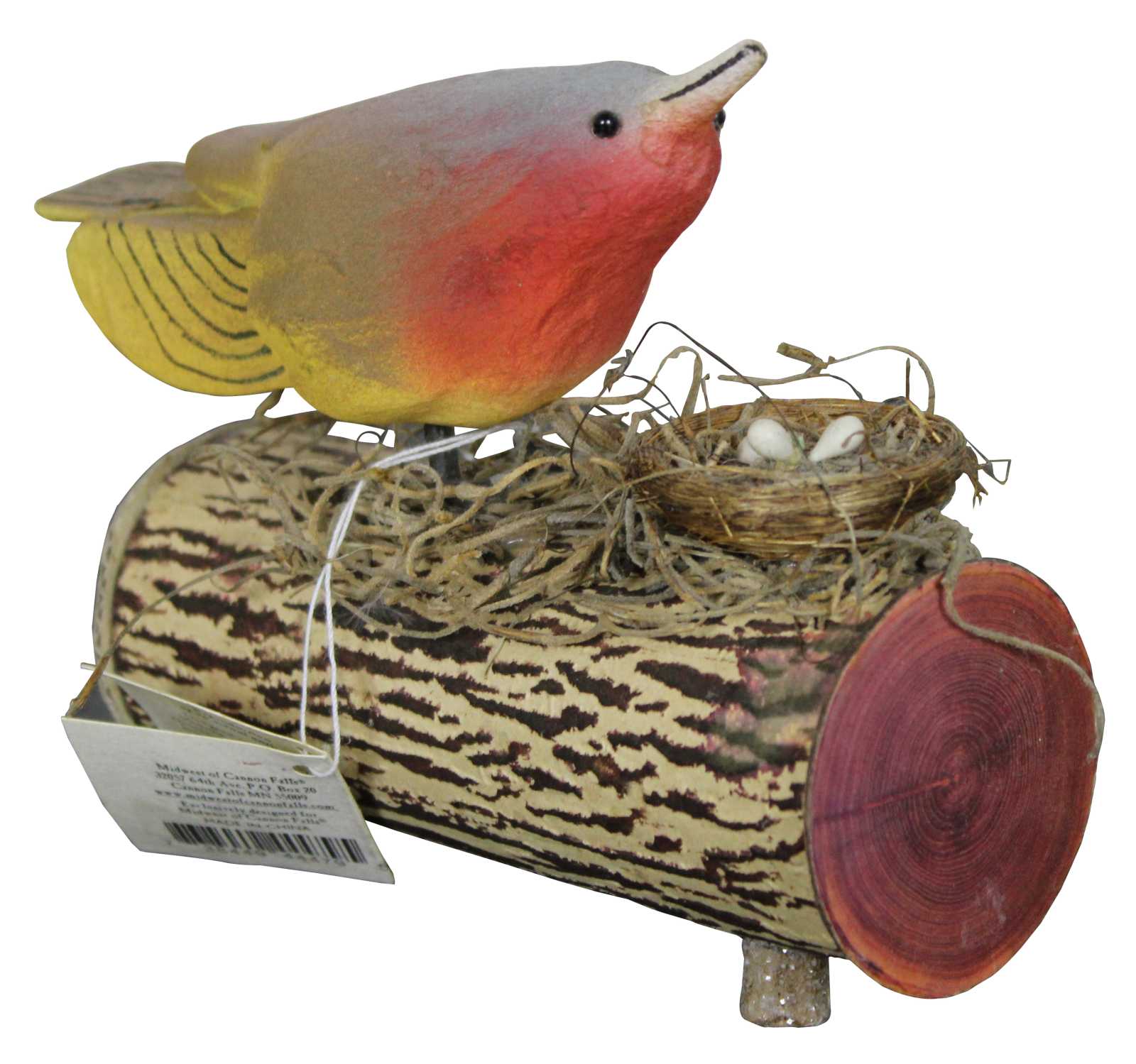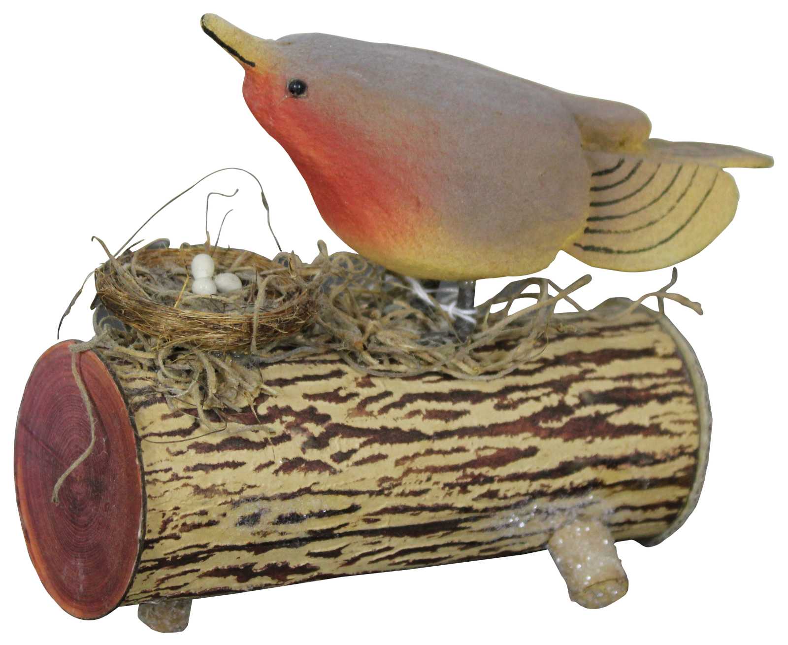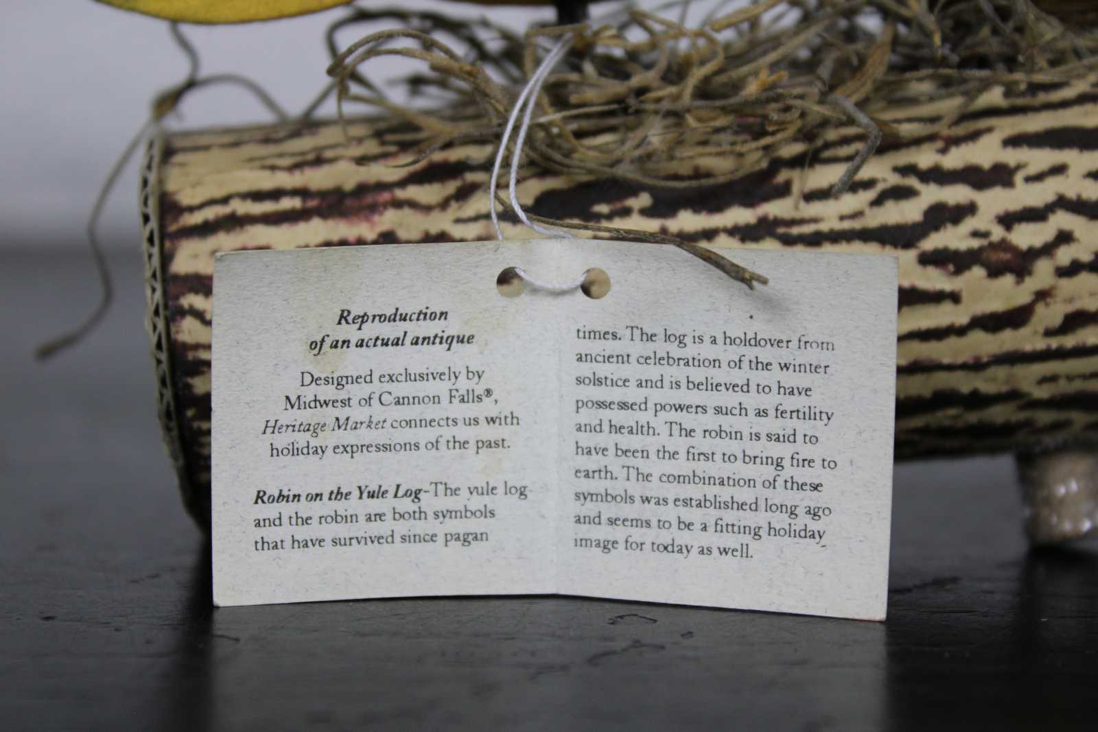 Robin on the Yule Log” paper mache figurine by Midwest of cannon Falls Heritage Market series; a reproduction of a real antique.