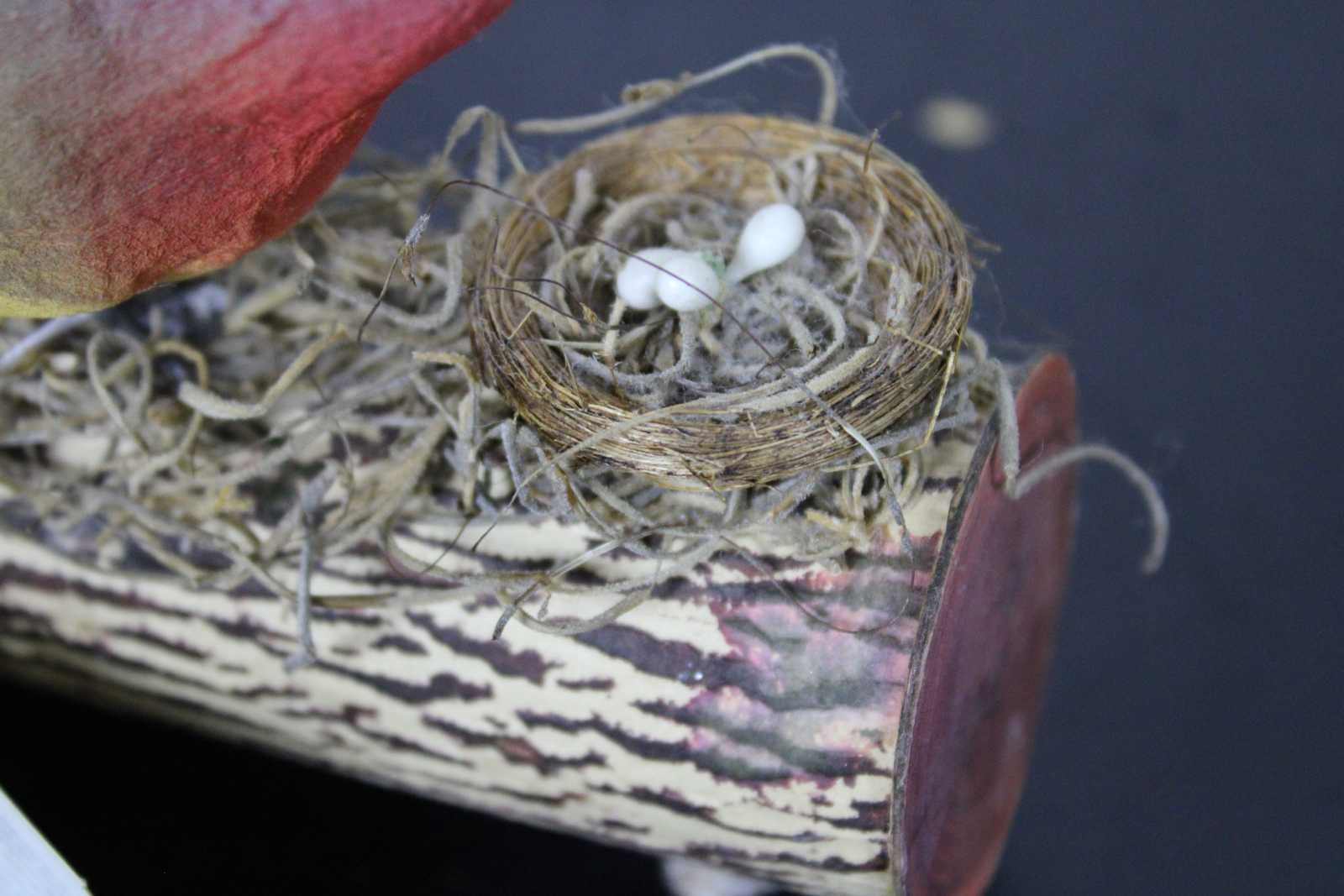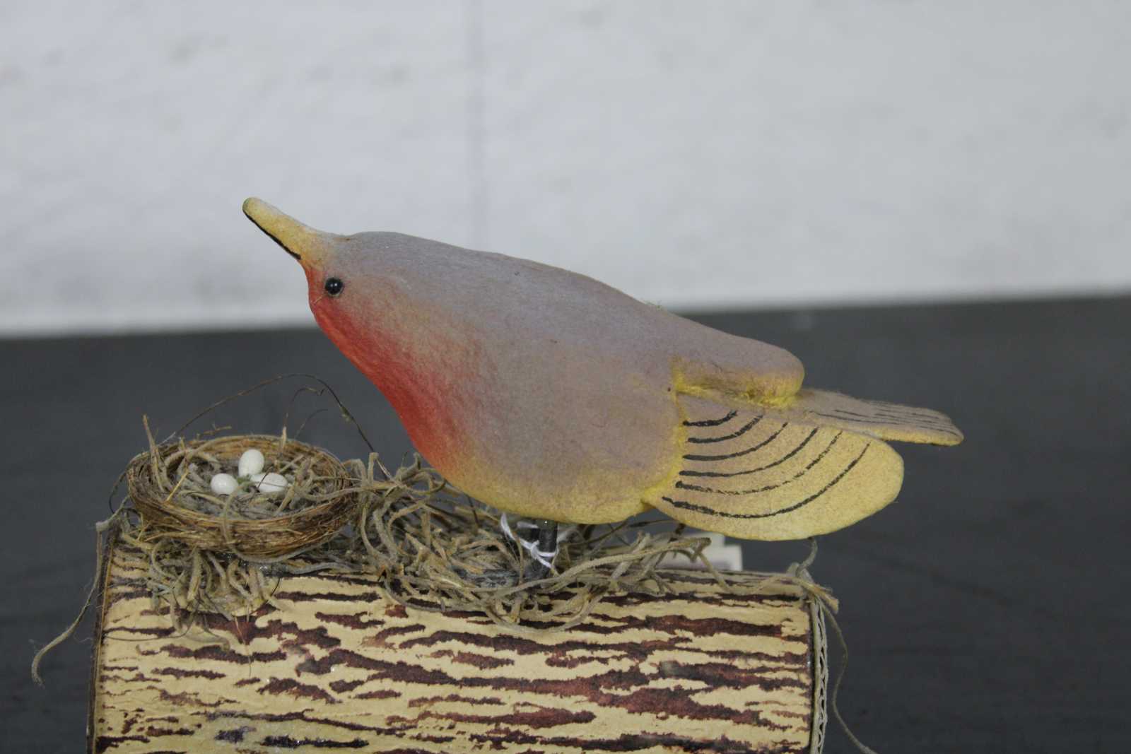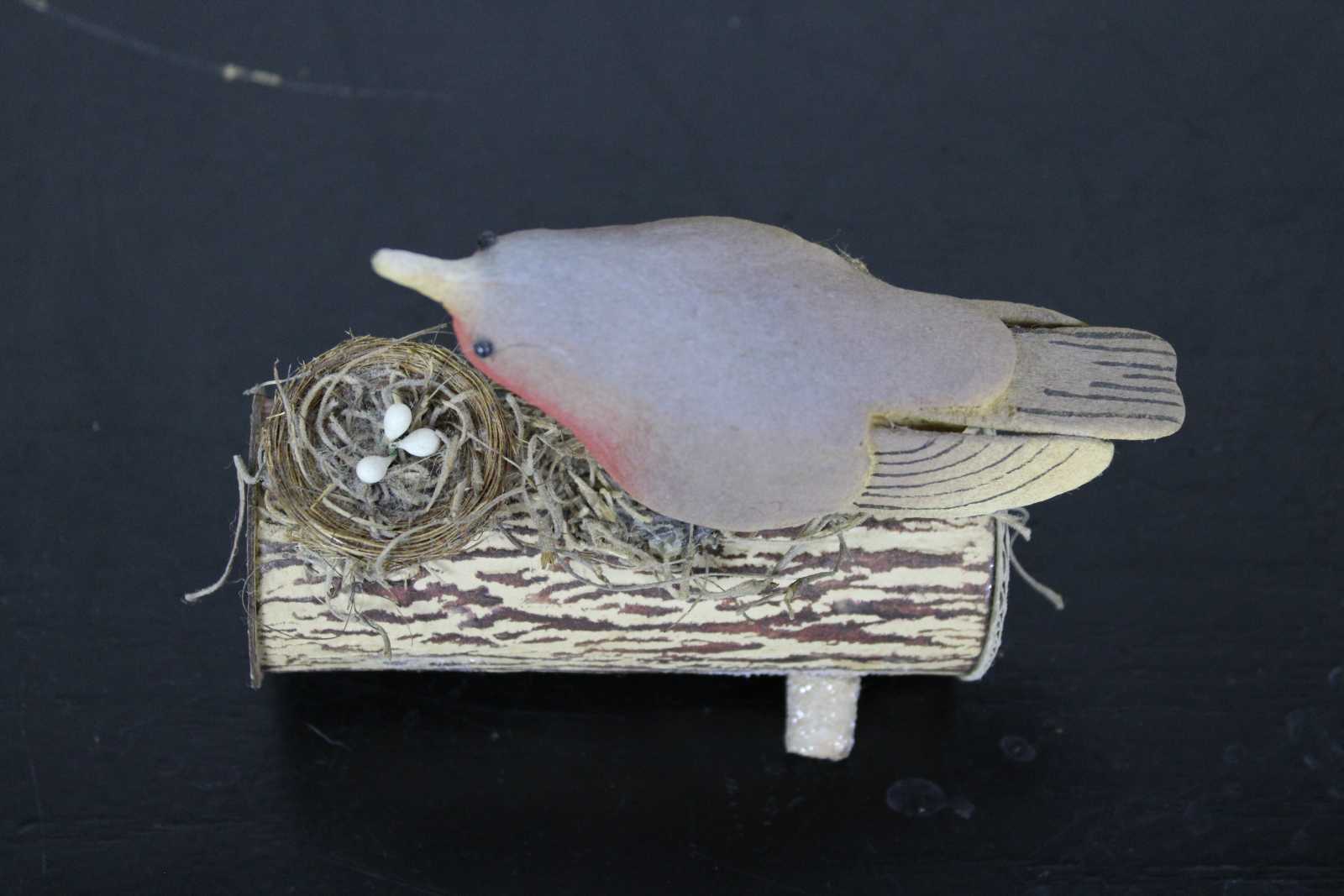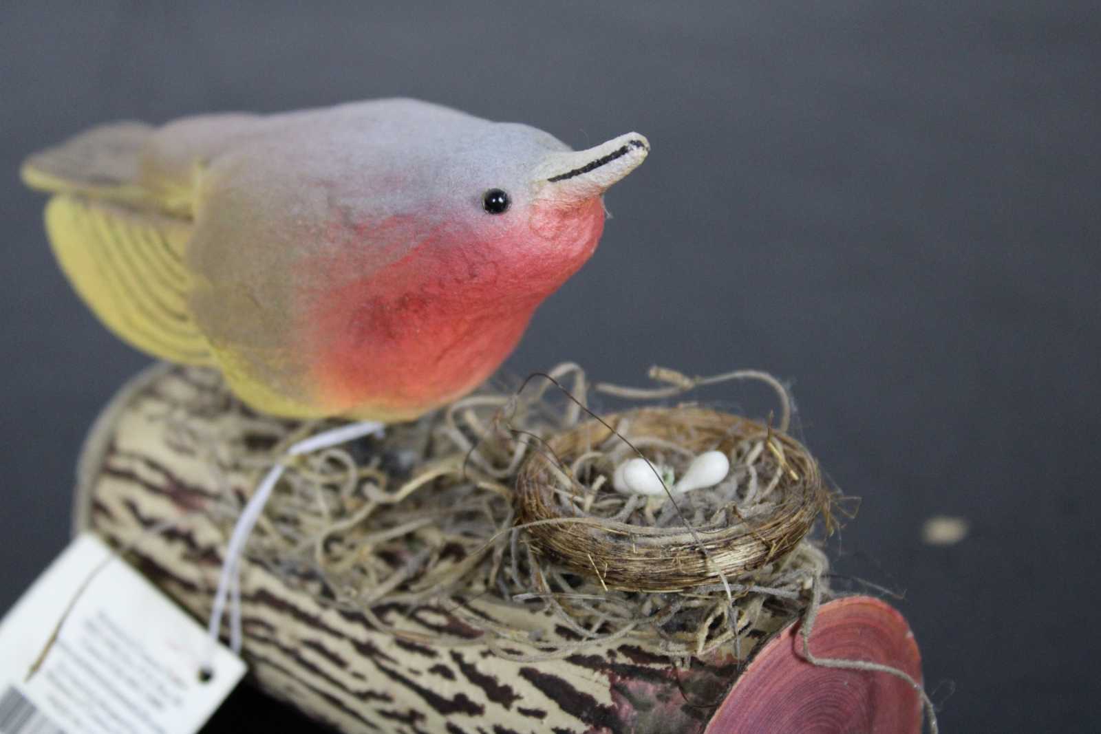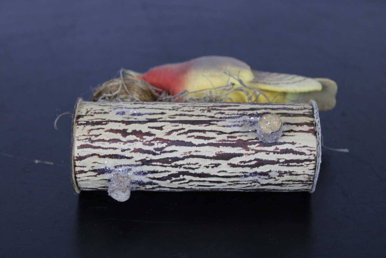 Robin on the Yule Log” paper mache figurine by Midwest of cannon Falls Heritage Market series; a reproduction of a real antique.