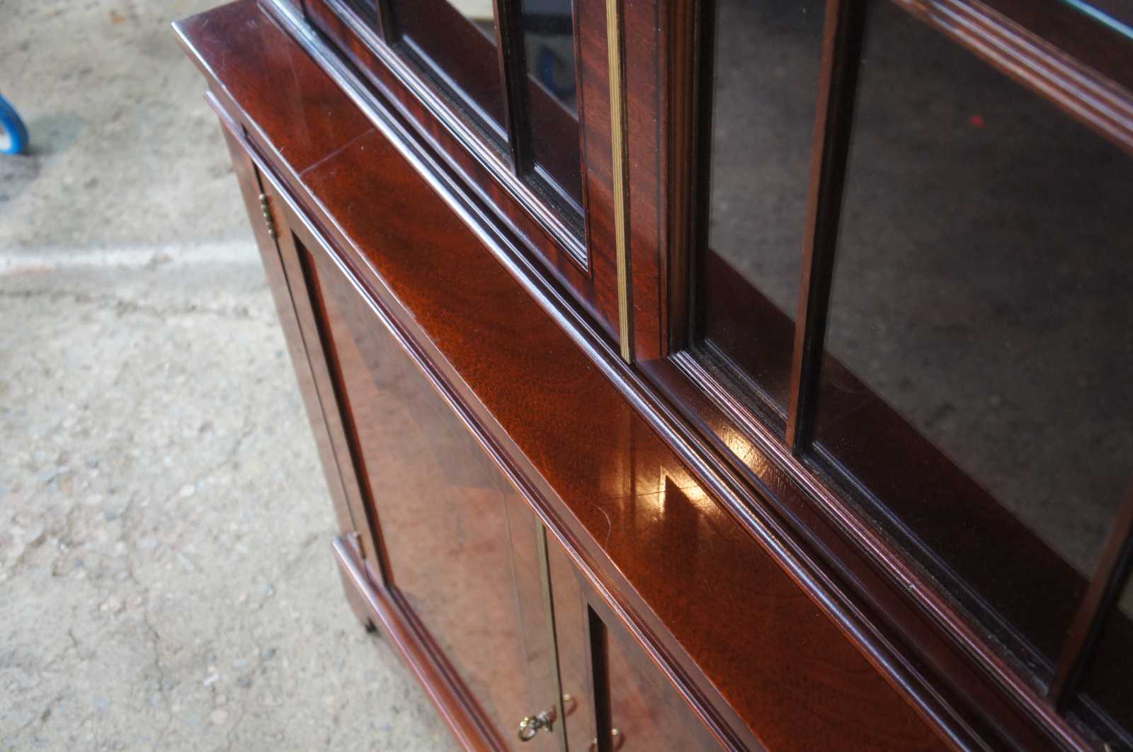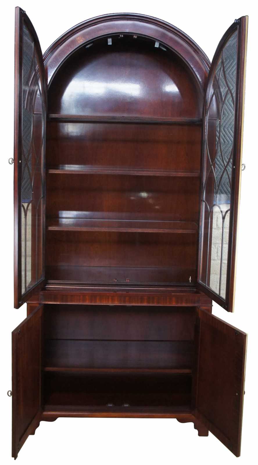 Baker Furniture Historic Charleston Collection bonnet top curio or china cabinet. A timeless beauty adapted from a pair of English originals in the Joseph Manigault House, circa 1790s. Made from mahogany with satinwood inlay, burled door panels and brass hardware. Features a glass front with elaborate fretwork. Opens to an iluminated interior with three inset shelves and lower cabinet storage.