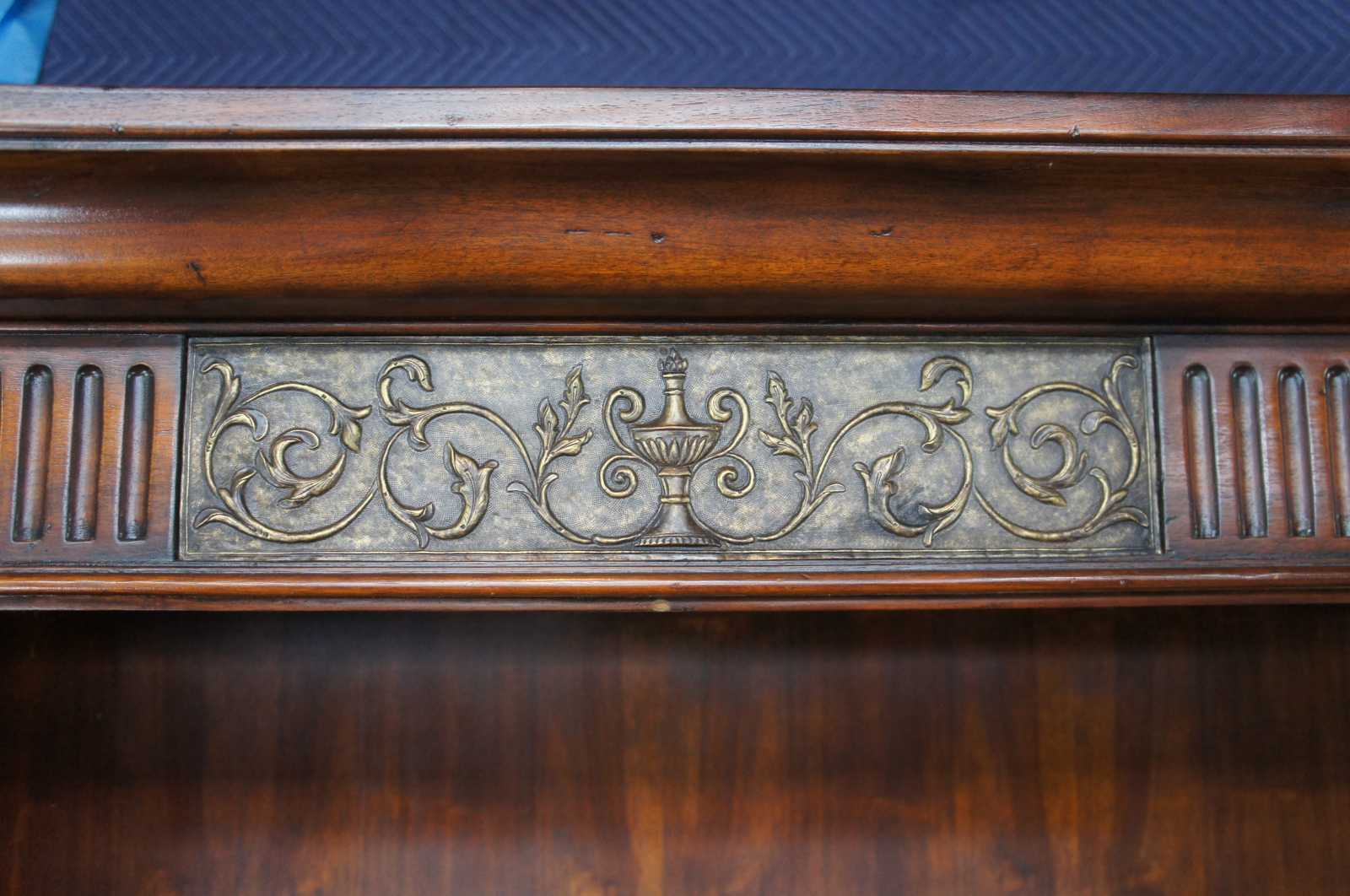 Monumental Regency/Neoclassical inspired breakfront by Theodore Alexander. Made from flame/ crotch mahogany with brass hardware. Features a doric crown with triglyph frieze over long carved columns, intricate capitals, medallions and low relief panels with trophy urns amongst scrolling wreaths. Includes a beveled glass front, dimmable interior, adjustable shelves, 8 drawers and lower accessory storage. The perfect statement for any space.