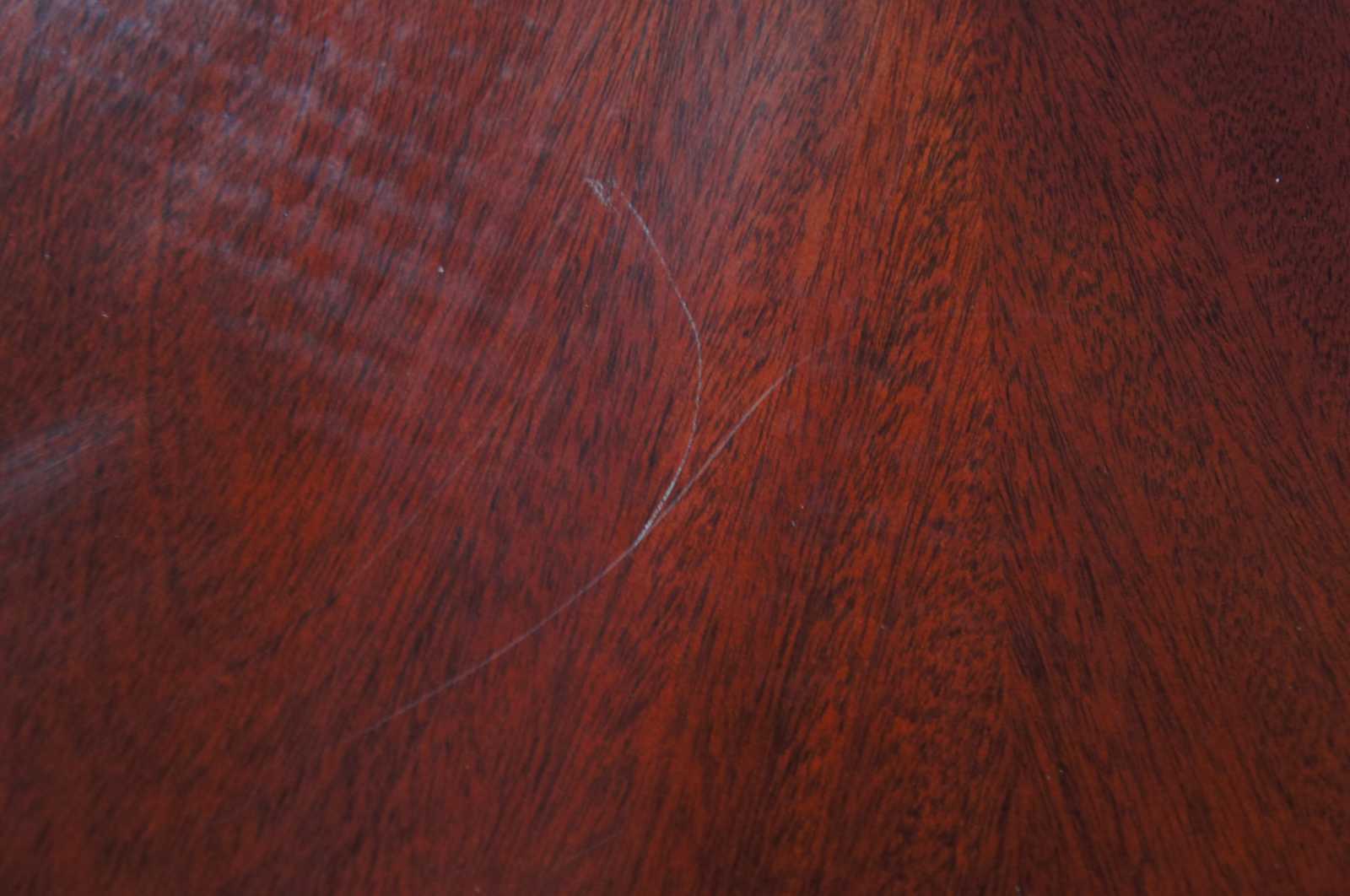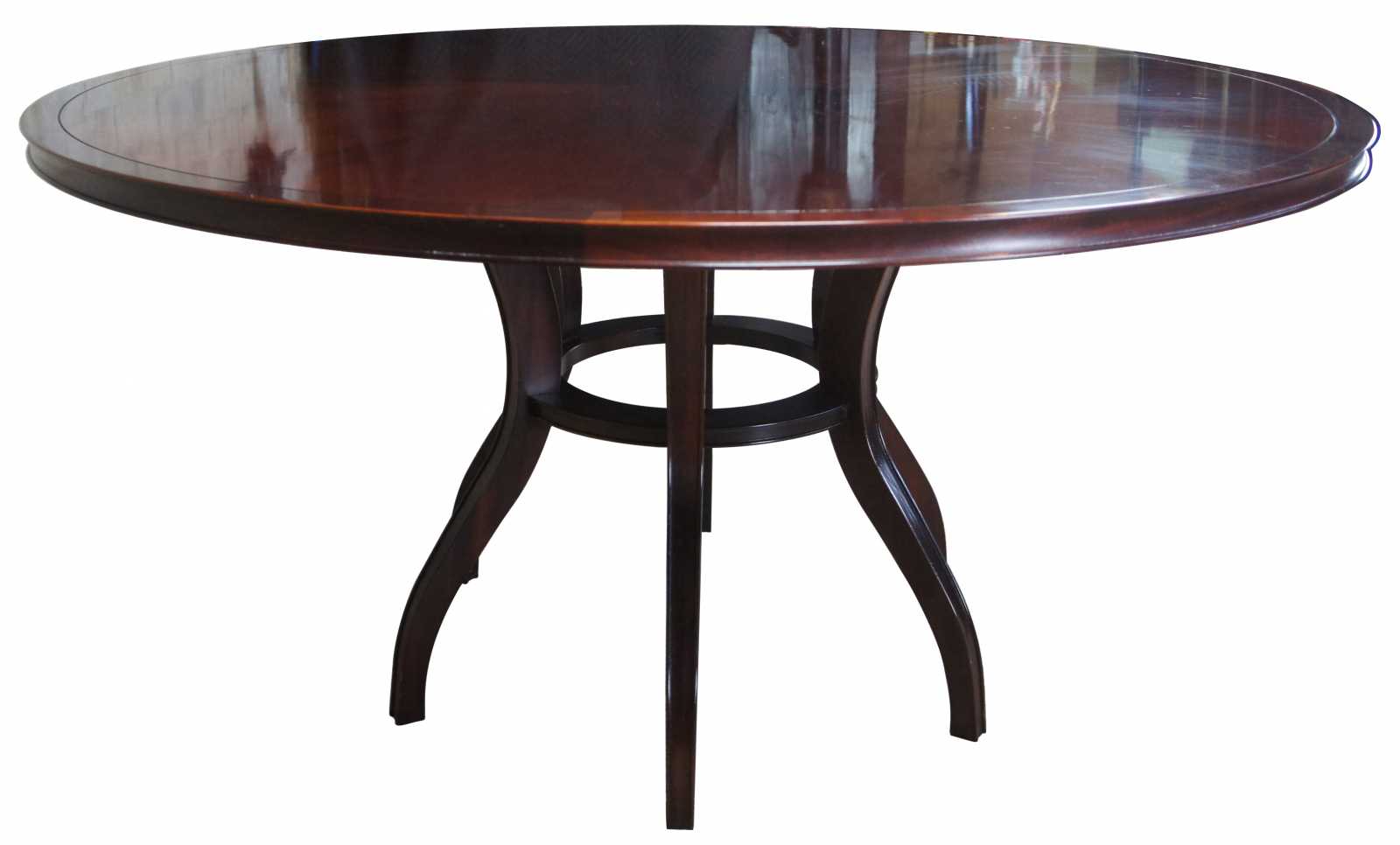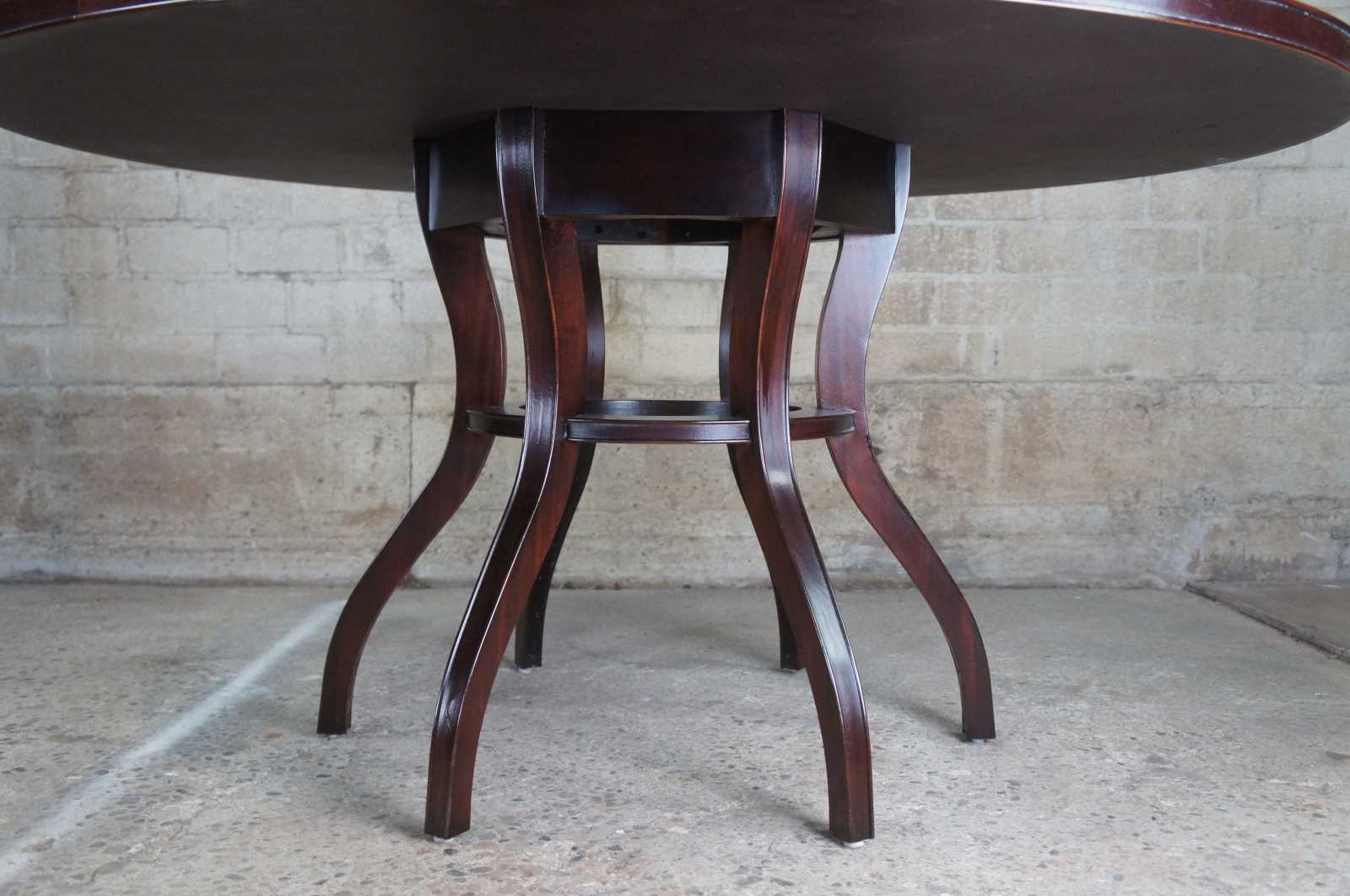 Designed by Barbara Barry for Baker, this pedestal table has a 60 inch round top with concave rim. Six curving legs are connected by a circular stretcher. The luxurious mahogany wood is covered in a rich, dark finish.
